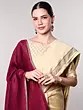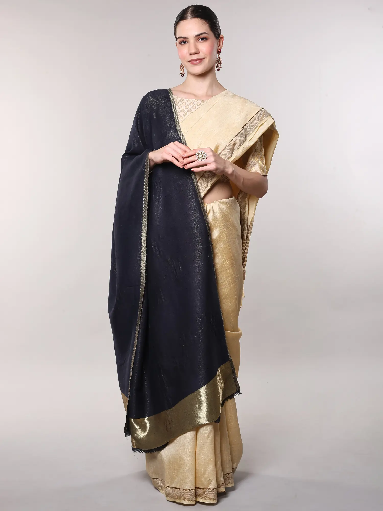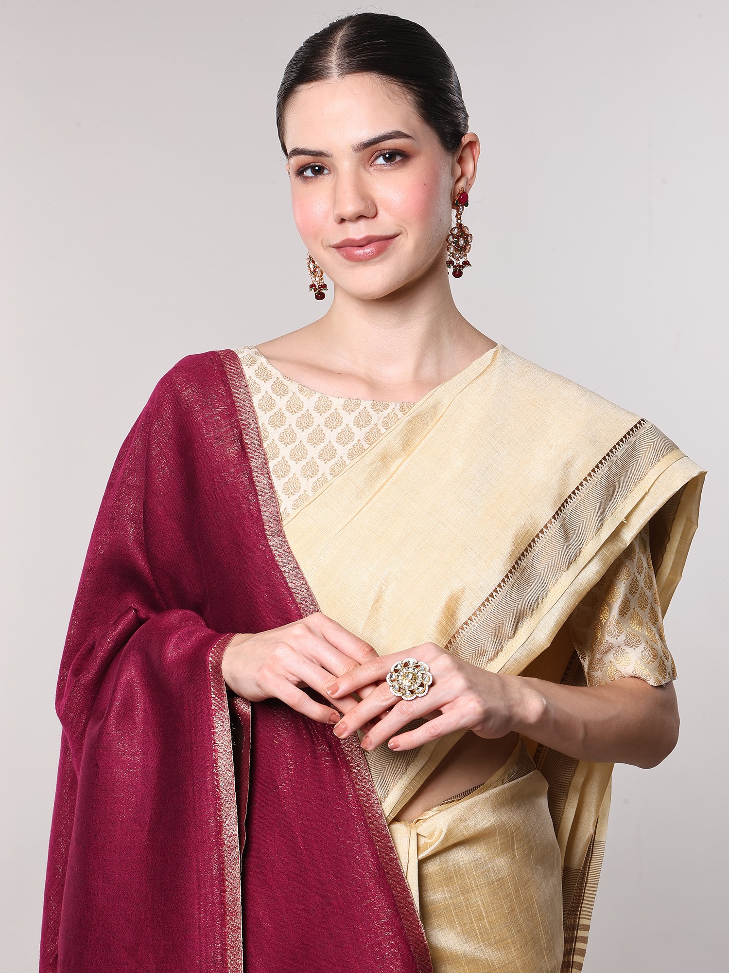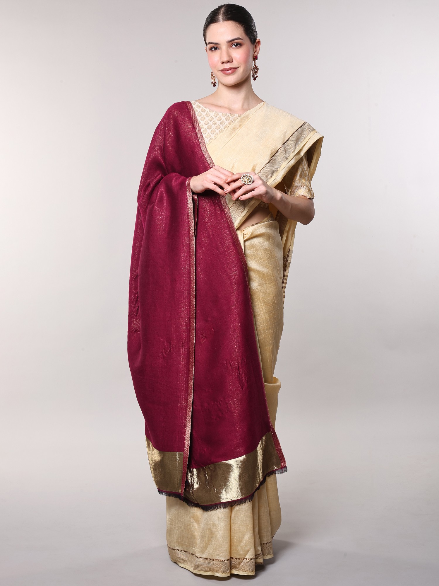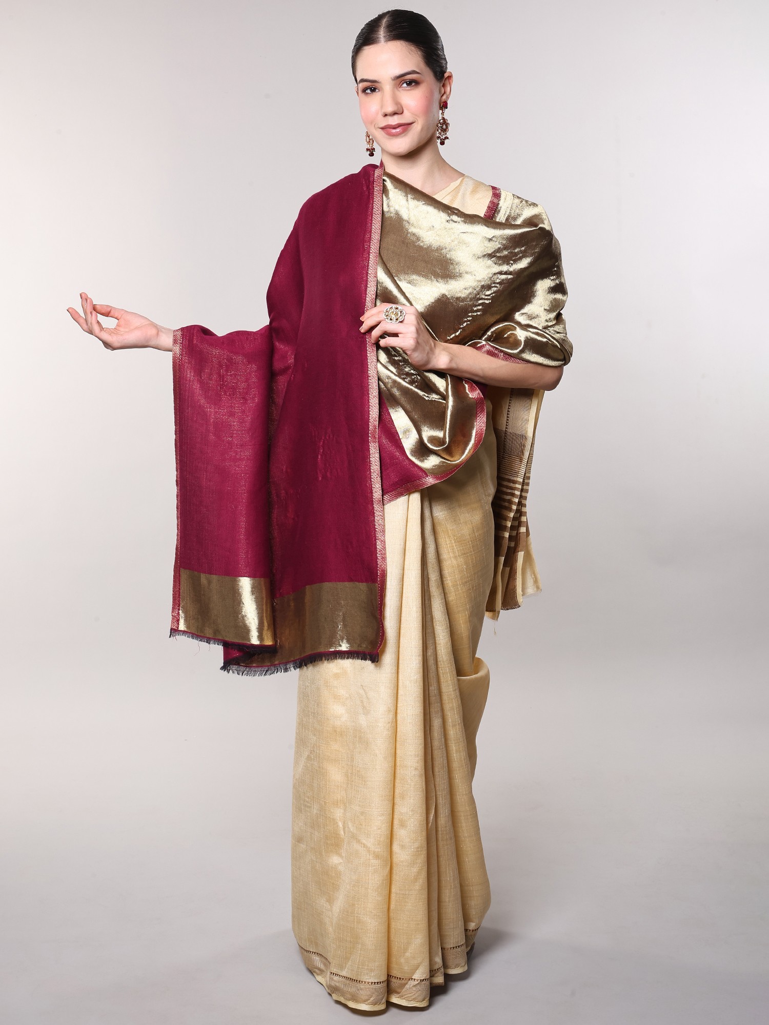 The unique weave of this stole creates a subtle texture that is both visually appealing and pleasing to the touch. The Zari work, traditionally renowned for its intricate patterns and metallic luster, is here presented in a refined manner, adorning the edges of the stole to create a sophisticated frame. This detail elevates the stole from a mere accessory to a statement piece, capable of transforming any outfit with its understated glamour. The reversibility of the stole means you get two distinct yet harmonious looks, further enhancing its value and wearability.