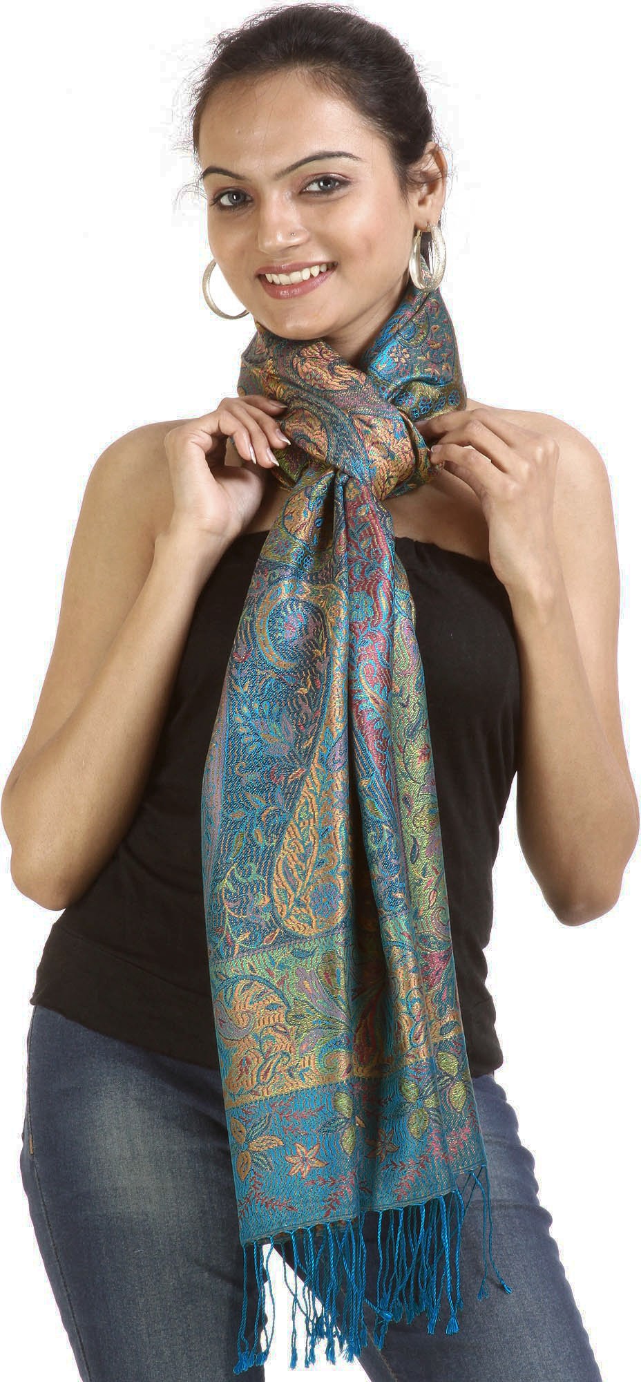 Crafted of pure silk fabric conceived as a large scarf or a shawl with narrow breadth for putting around the neck for beauty but as much to protect from rough unsympathetic winds, the hot summer’s, or the cold winter’s, and to preserve its golden glow, more than a wear this stole is a colourful art piece. Not so much a wardrobe member the stole is more befittingly an art studio’s inhabitant. Ingeniously crafted this piece has been woven with various design patterns and motifs using multi-coloured silk-threads as wide in range as such patterns. These patterns and motifs extend from simple vines and flower-leaf designs to architectural members like arched openings and the mystic and spiritual symbols and motifs.