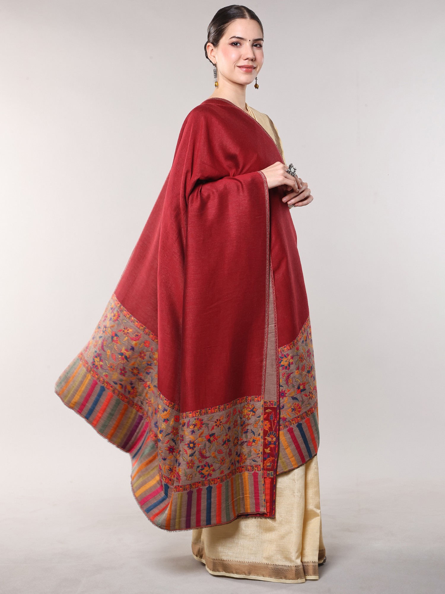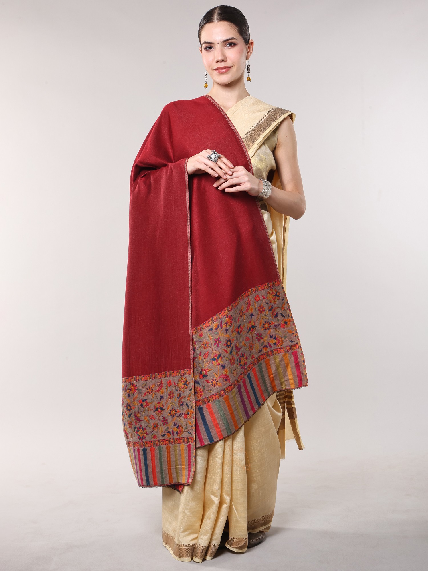 The luxurious wool offers a soft, inviting touch, providing comfort through every season. Its expansive design, measuring a generous 88 inches in length and 42 inches in width, ensures it drapes beautifully, offering ample coverage. The rich, deep hue of the primary fabric is perfectly contrasted by the intricately woven Kani border, featuring a symphony of blossoms and complementary striped accents that add a vibrant yet harmonious flair.