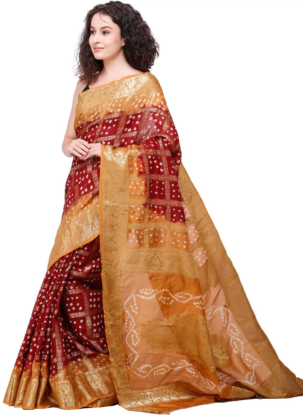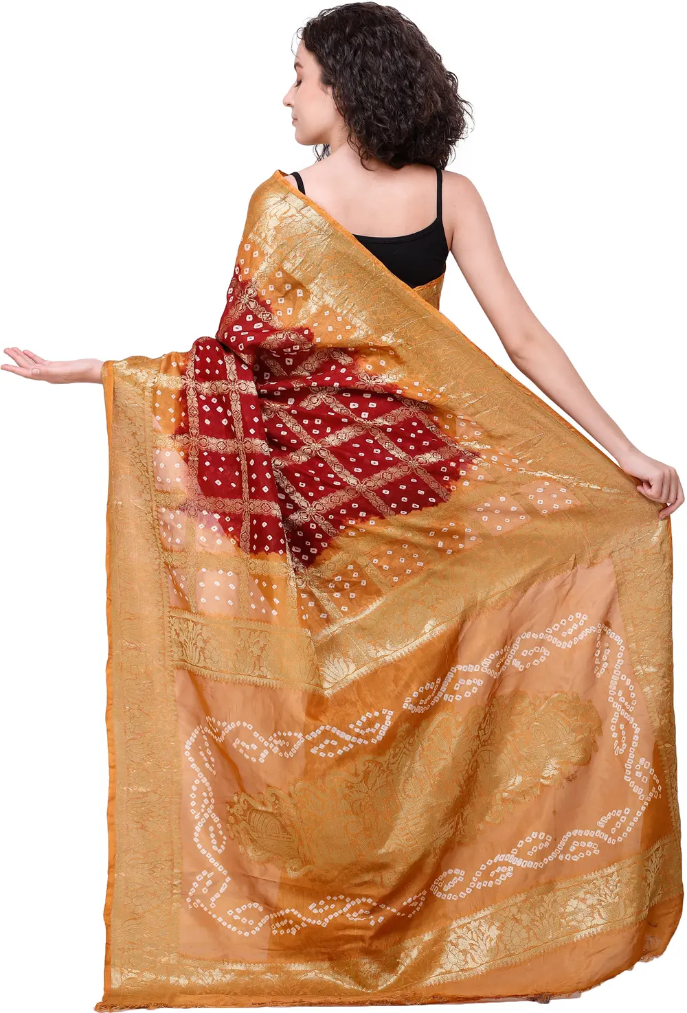 Georgette Bandhej Saree with All-Over Golden Thread Woven Motifs from Gujarat