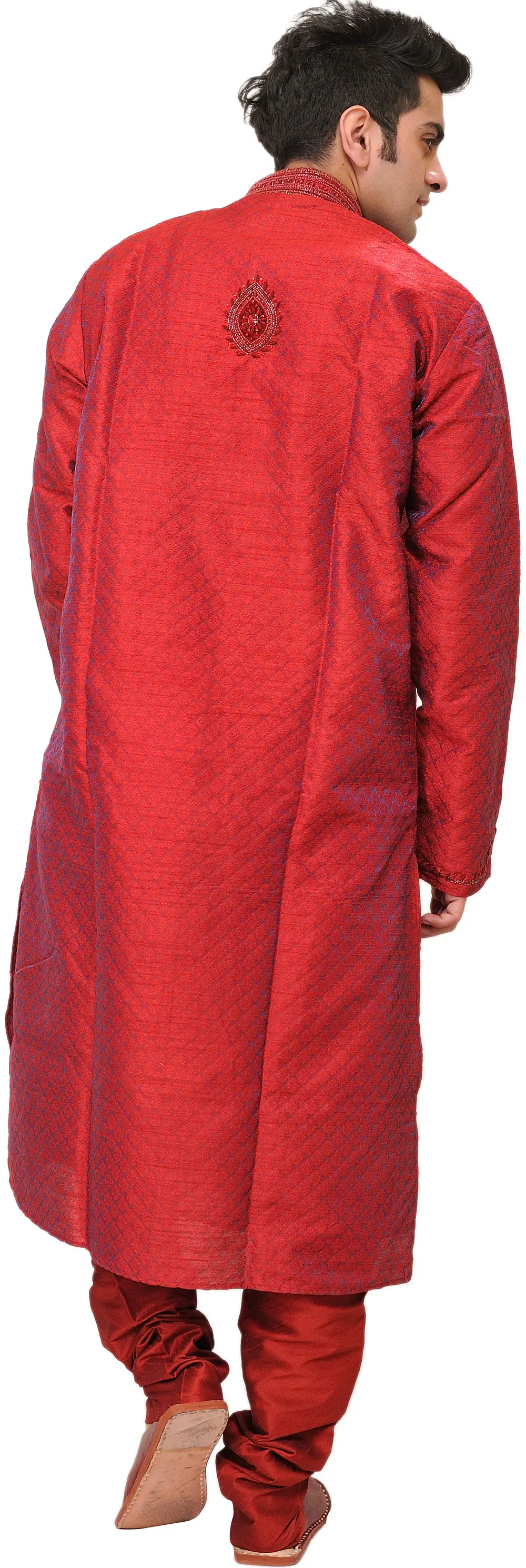 This “Rococo-Red Self Weave Wedding Kurta Pajama Set” is a marvel of design and luxury that will boost your wedding wardrobe. This royal outfit, crafted from luxurious art silk, displays a mesmerising self-weave pattern, exuding refinement and classic charm. The neckline is embellished with delicately stitched beads, creating a sense of richness.