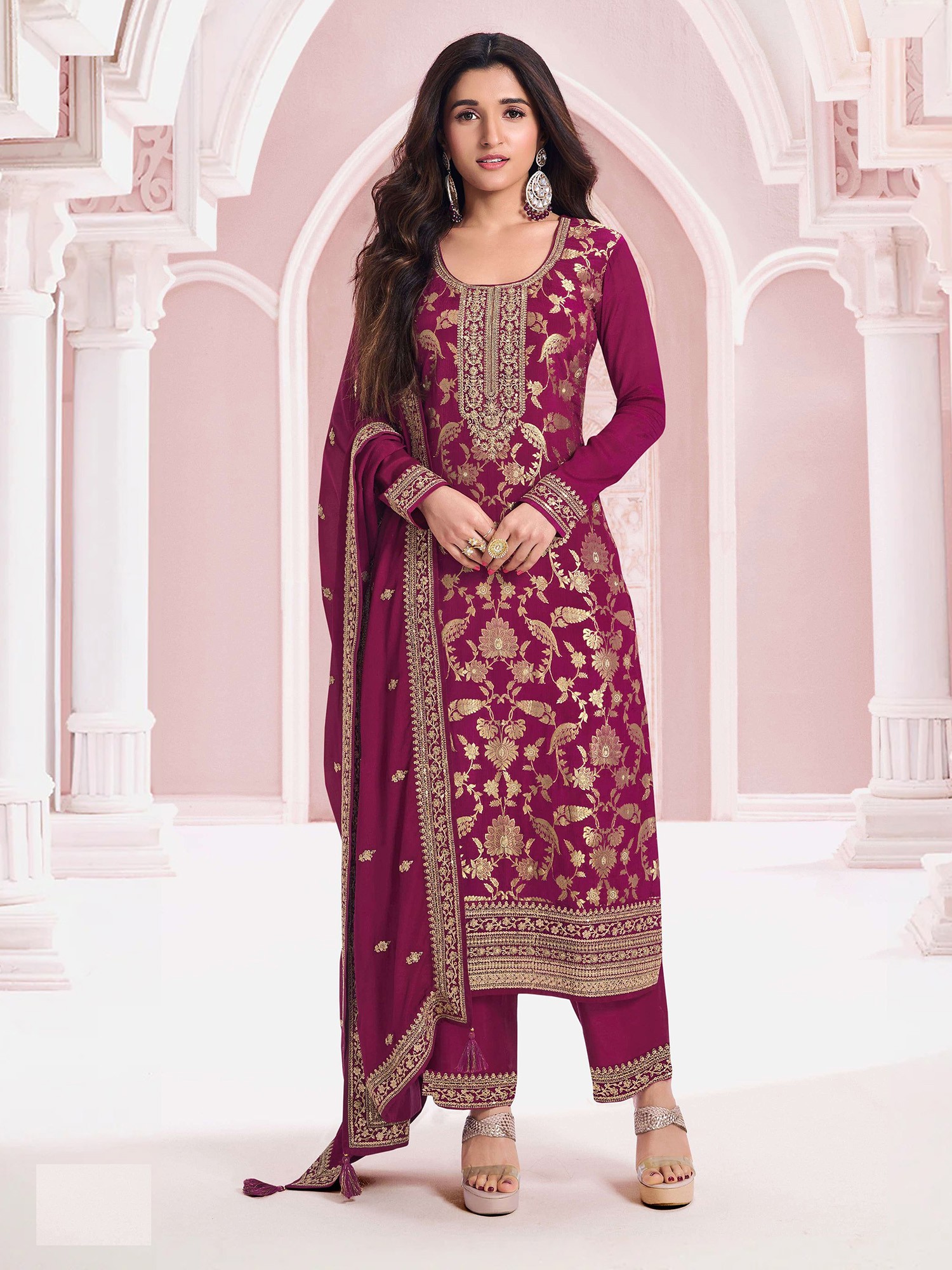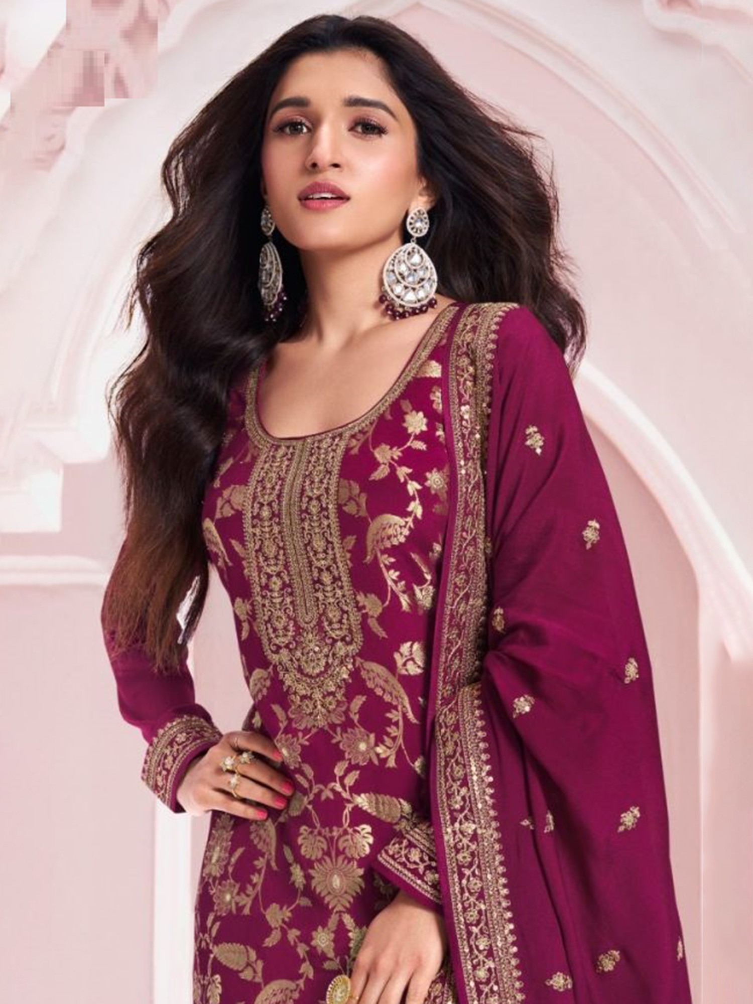 Medium-Violet-Red Heavy Embroidery And Sequins Work Kurta Set With Matching Dupatta