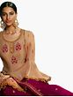 However, the most eye-catching occurrence of Zari in this art silk Sharara salwar-kameez is on the flared Sharara pants with the internationally known chevron pattern on its hem and enduring Indian ethnic motifs on the rest of the pants. The glistening Kaam (work) of Zari continues on the beautiful dupatta that comes with the art silk suit whose vibrant color pallet, accompanied by a statement Indian jewelry will turn any party into a grand gala.