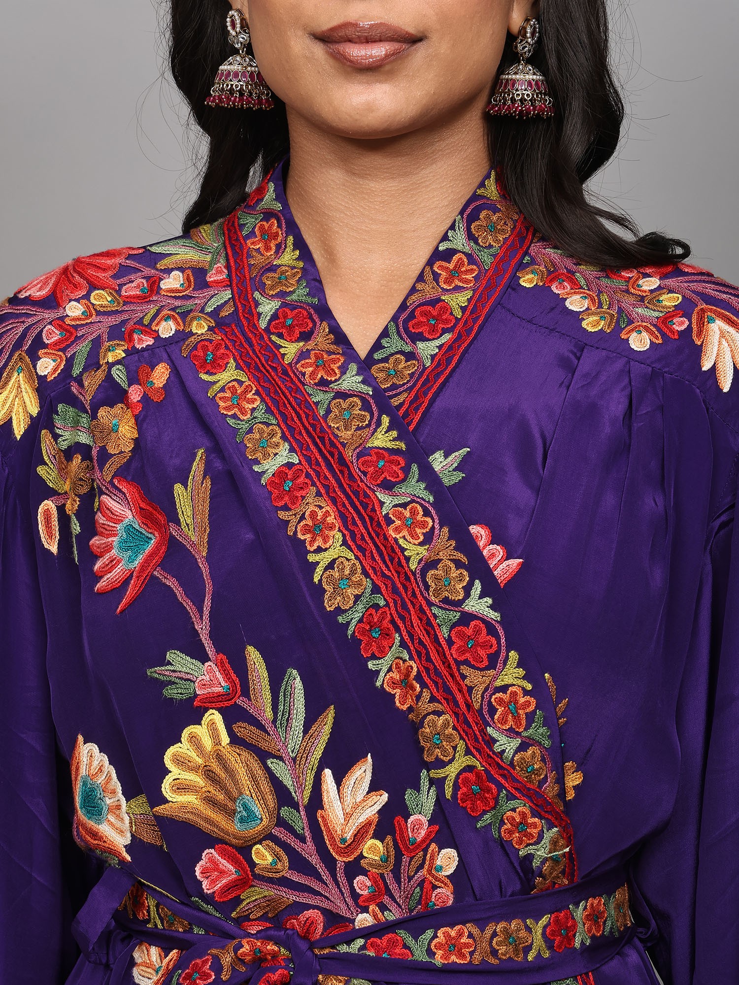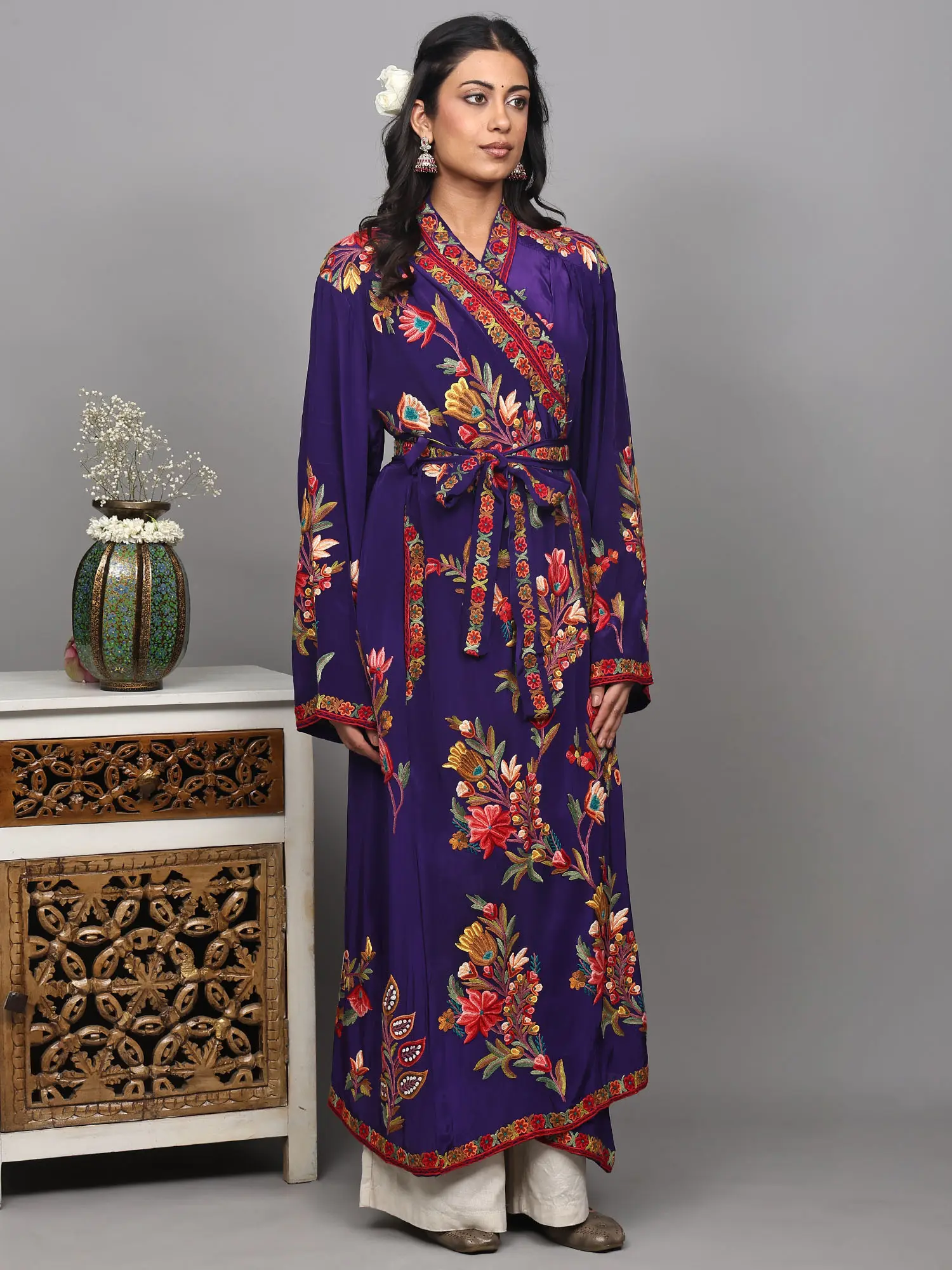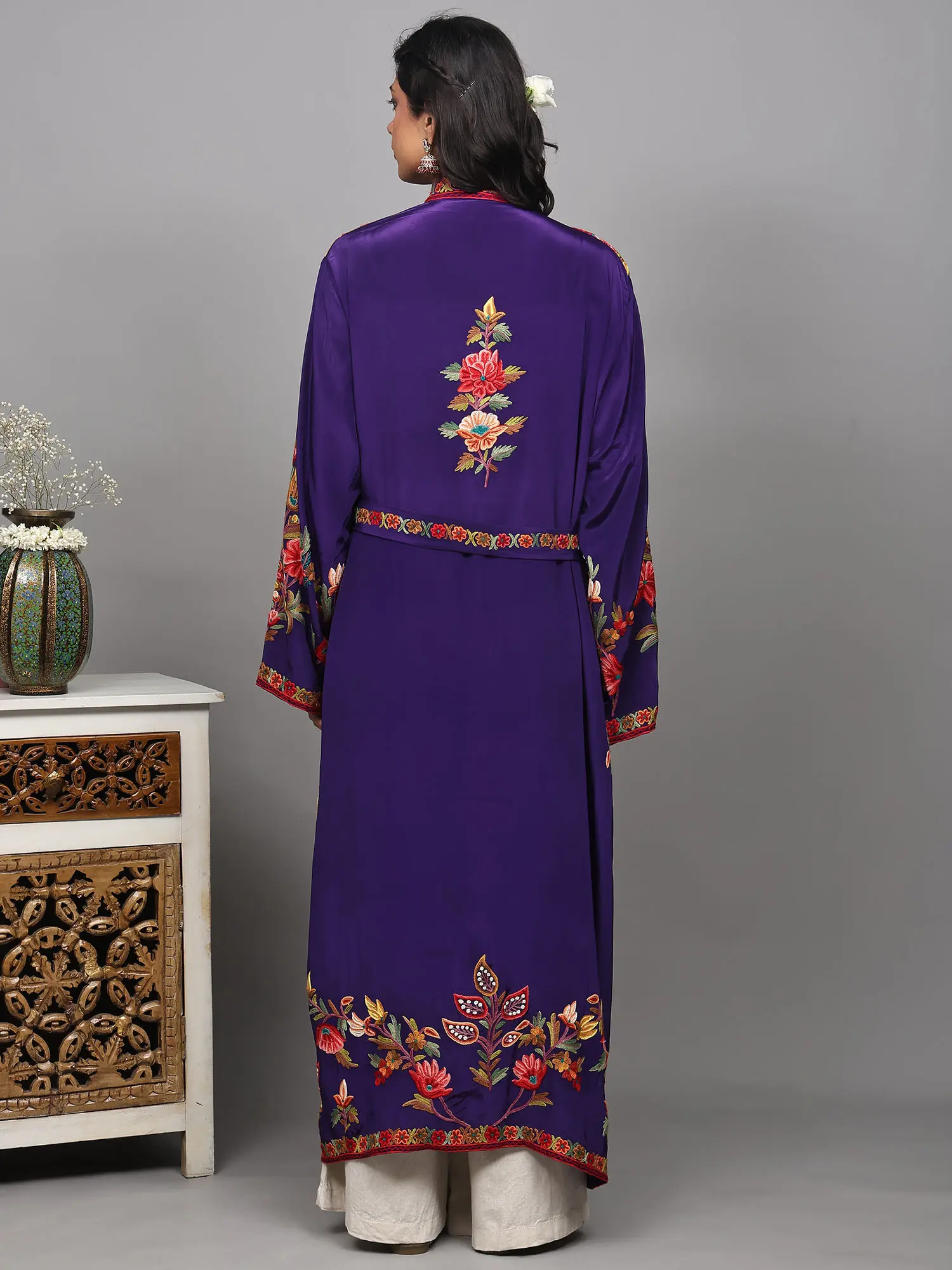 Riverside-Blue Kashmiri Robe with Aari Hand-Embroidered Floral Vines