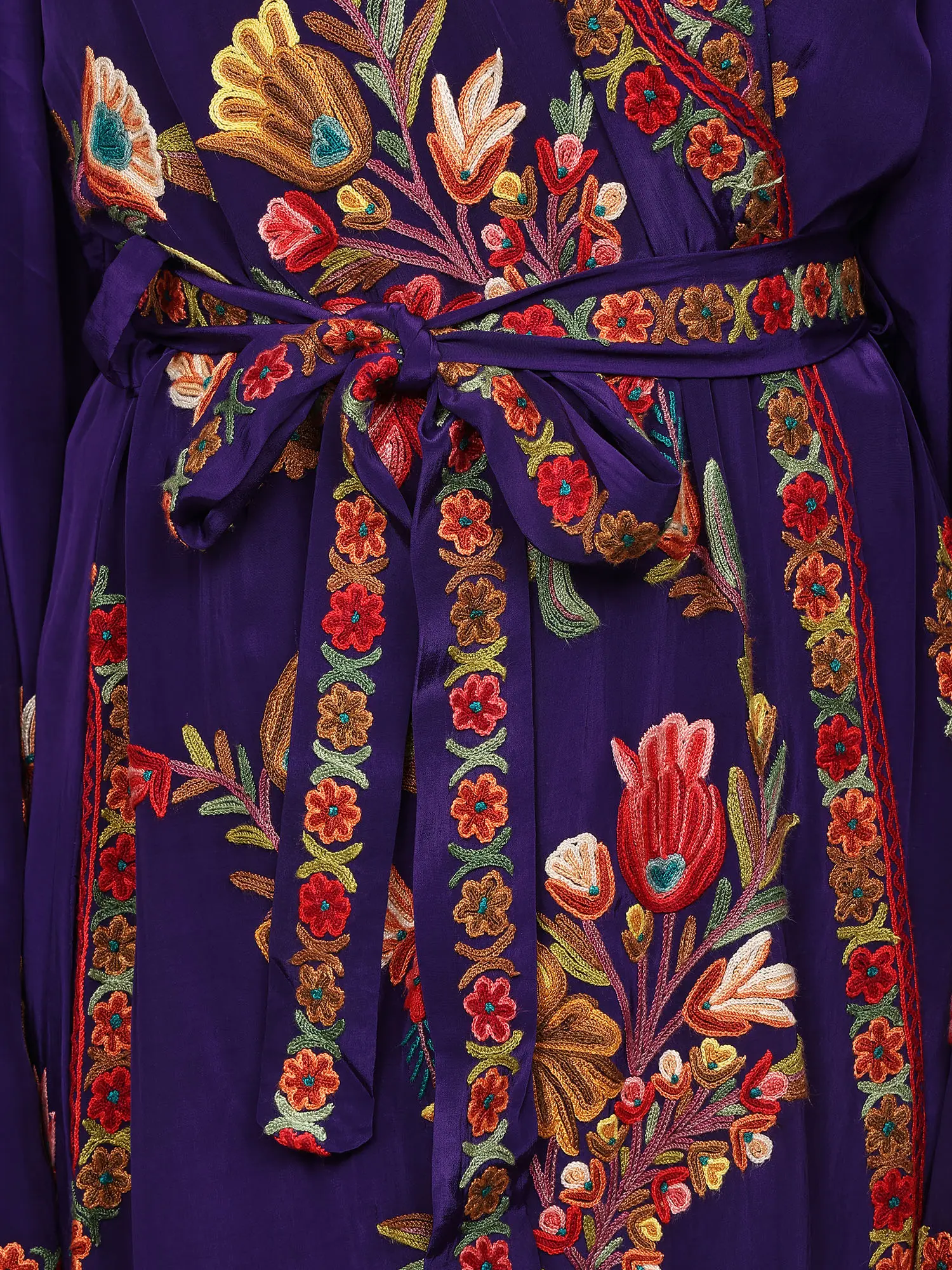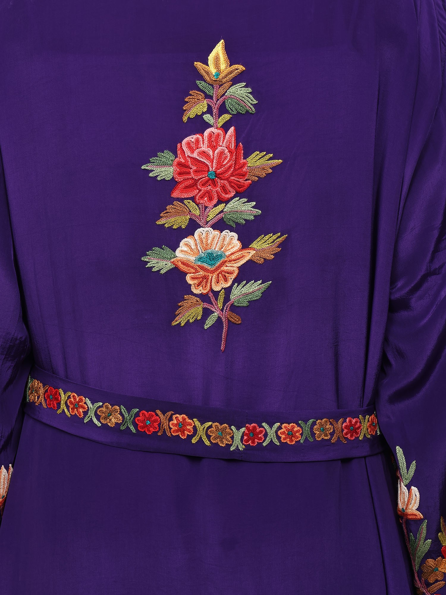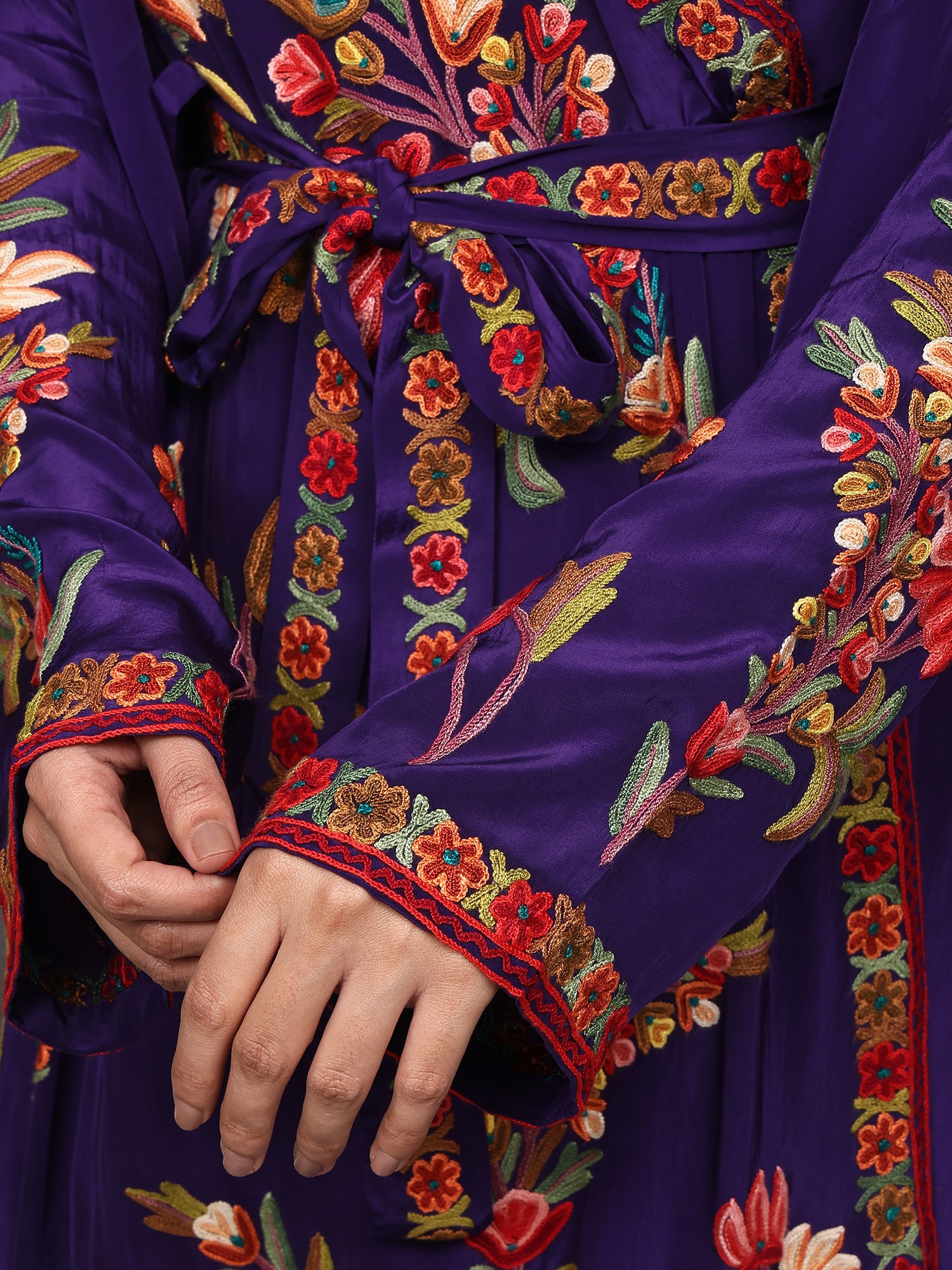 Papyrus-White Kashmiri Robe with Aari Hand-Embroidered Multicolored Flowers