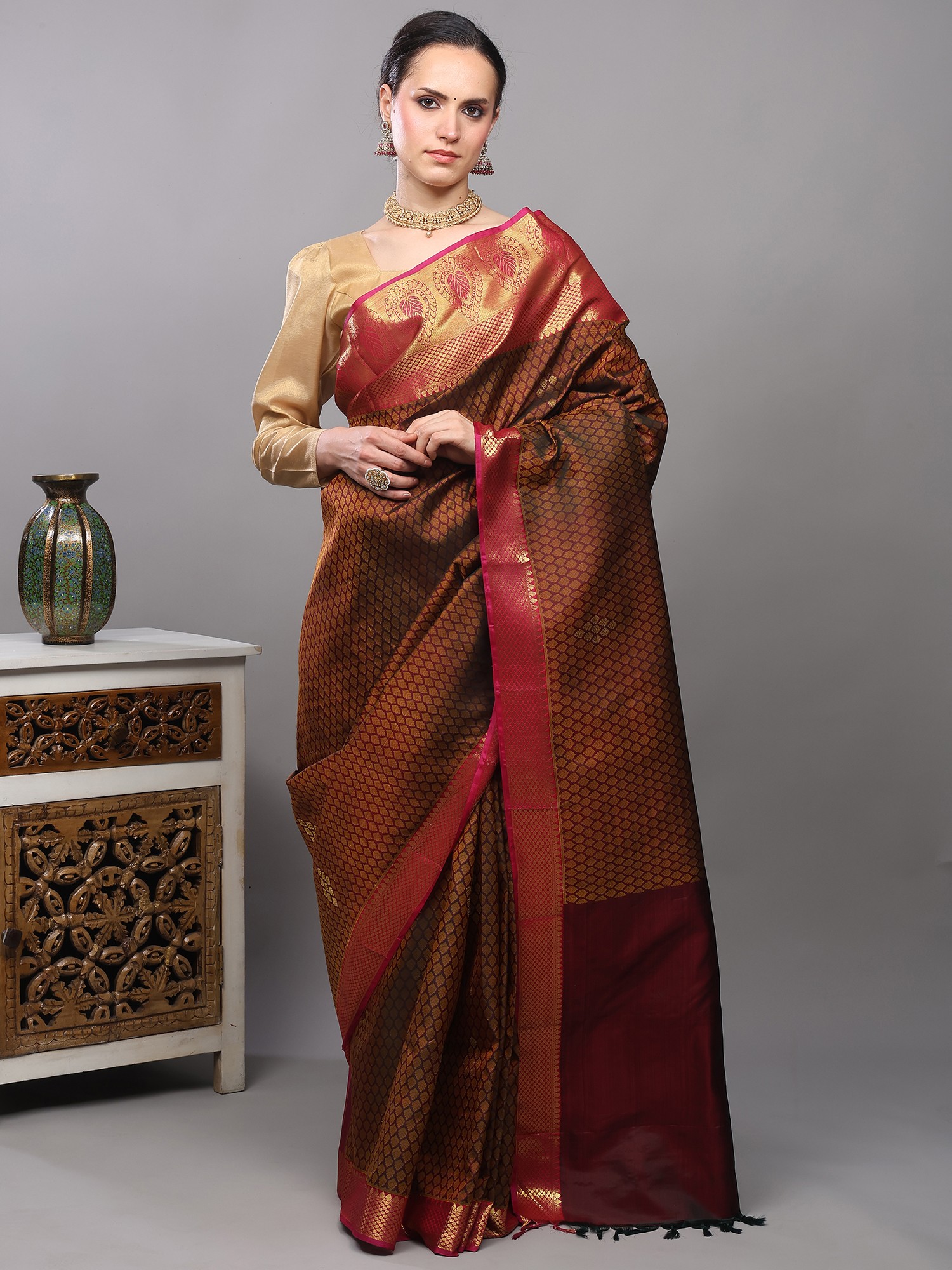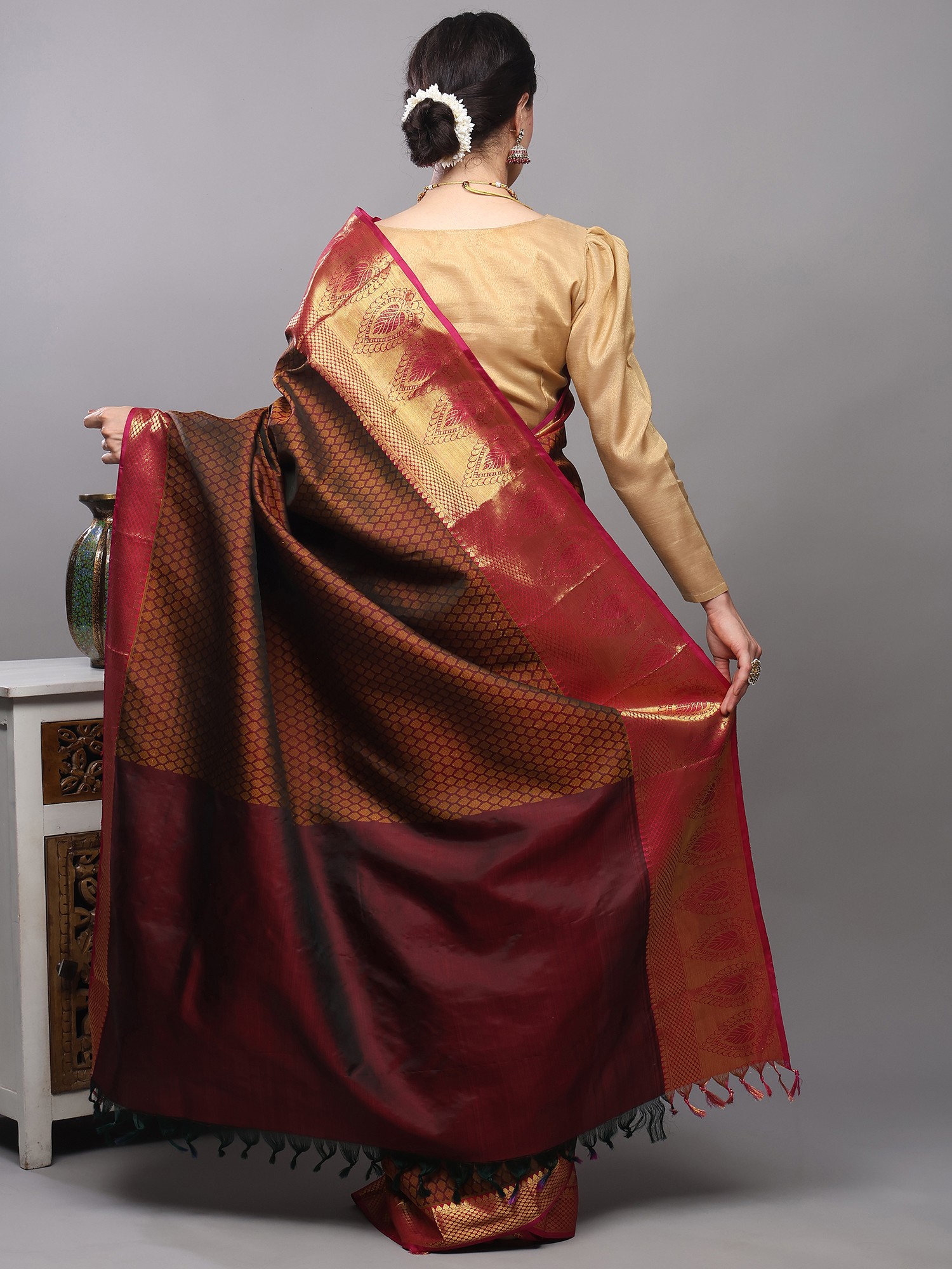 Fir-Green Pure Silk Saree from Bangalore with All-over Leaf Weave