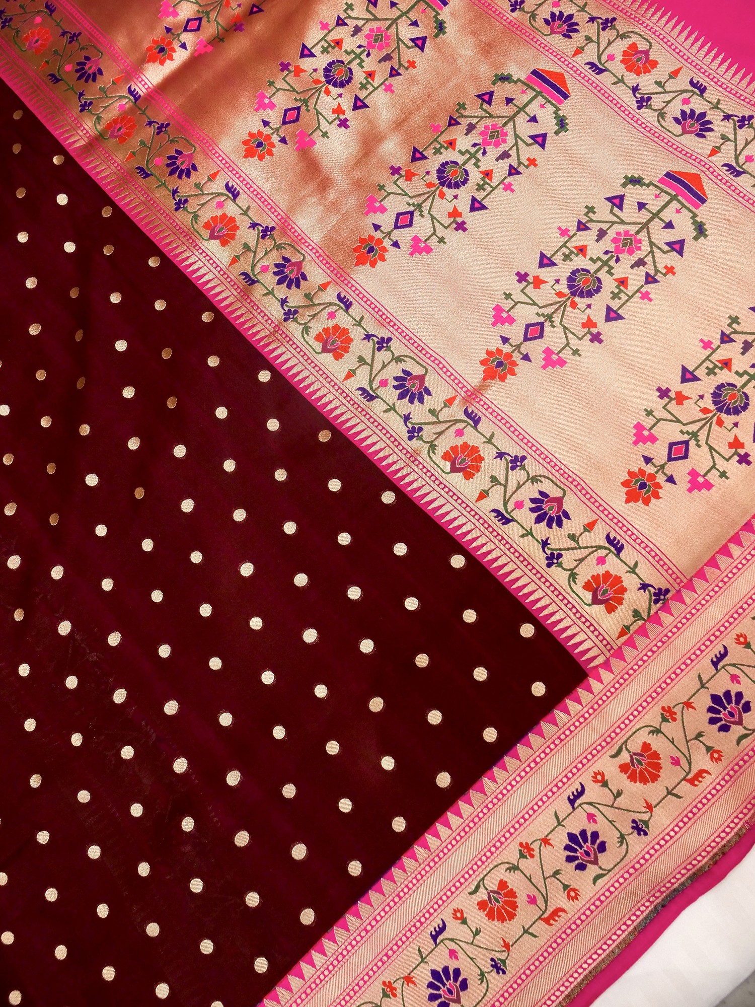 Rumba-Red Katan Silk Banarasi Saree with Chakaram Butta & Floral Pallu-Border