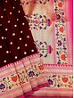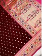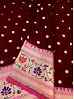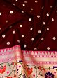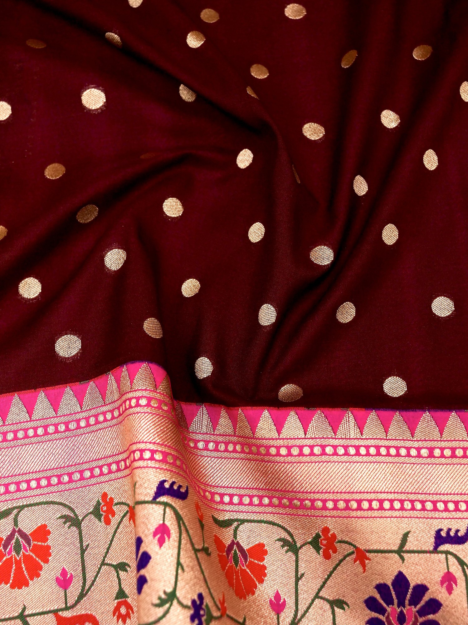The simple and tasteful beauty of the dark red field is bordered by a vibrant tapestry of floral motifs created with Zari and resham threads.