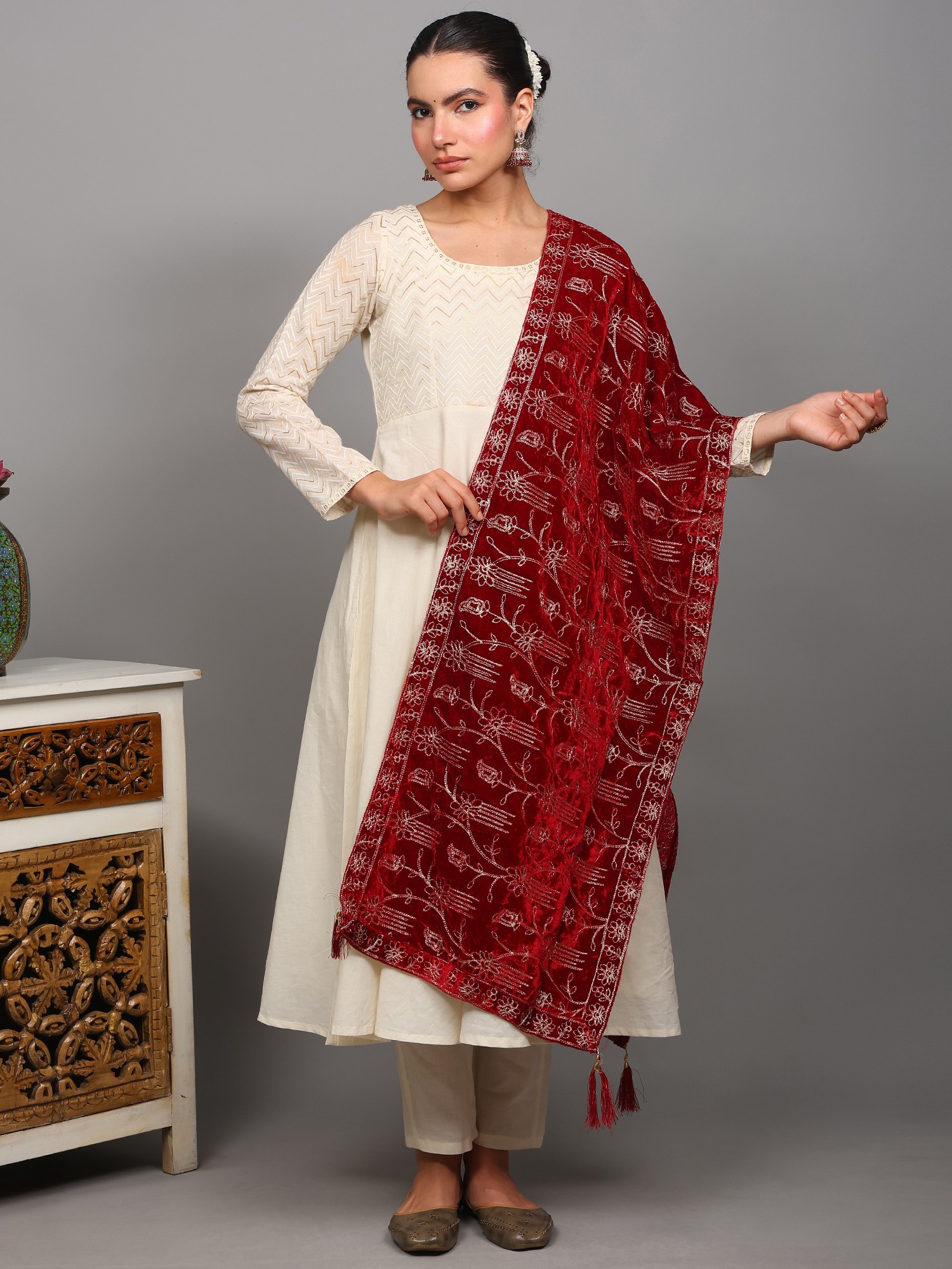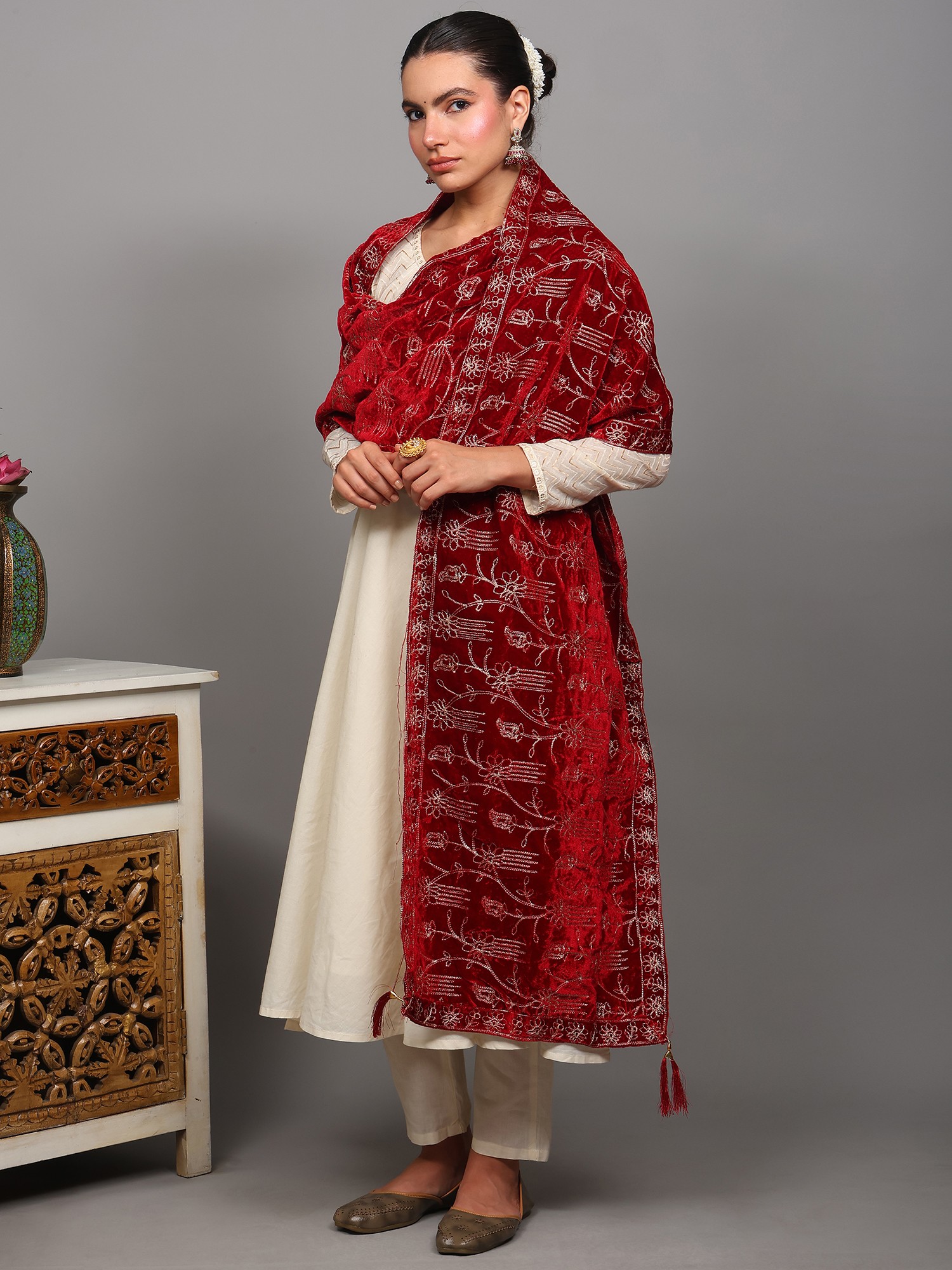 Rumba-Red Velvet Stole from Amritsar with Floral Golden Thread work and Latkan