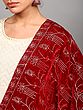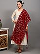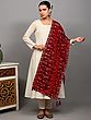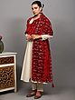 Adding a playful yet sophisticated flourish, the stole is adorned with matching red latkans at its corners. These tassels are not merely decorative; they are imbued with the spirit of celebration and tradition, adding a subtle movement and charm to the stole as you wear it. They are a perfect finishing touch, hinting at the joyous occasions for which this stole is ideally suited. Whether you're attending a wedding, a festive gathering, or a special evening out, this stole promises to be the perfect companion, adding a layer of glamour and cultural richness to your attire. Its generous length ensures versatile styling options, allowing you to wear it draped over your shoulders, across your body, or in a more structured fashion.