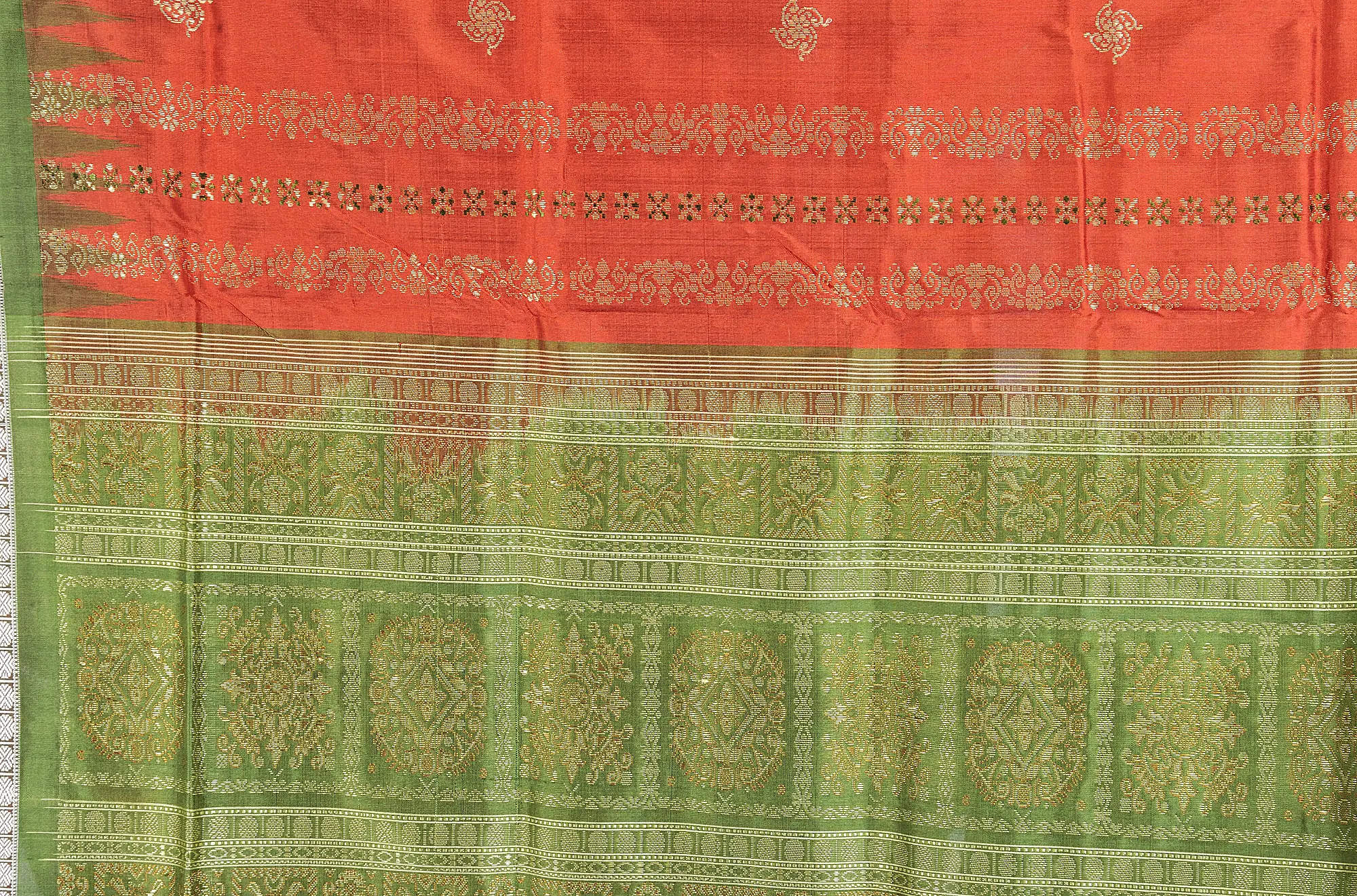 Dark-Cheddar Bomkai Handloom Sari from Orissa with Box Design on Pallu and Temple Border