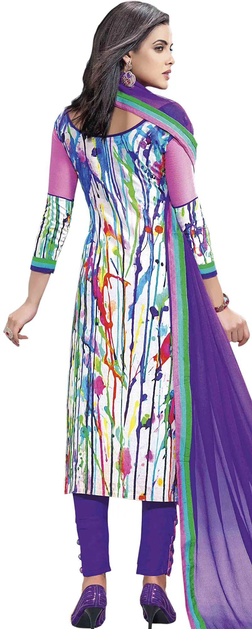 The true artistry of this salwar suit is evident in its thoughtful embellishments. The lower hem of the kameez is beautifully enhanced with a series of circular chakra patches, intricately embroidered with colorful patterns and outlined in shades of blue and green. These patches are complemented by a striking horizontal border featuring bands of color and delicate embroidery, further elevating the visual appeal. The accompanying dupatta is a rich shade of purple, transitioning gracefully into a complementary border of green and pink, echoing the vibrant theme of the kameez.