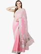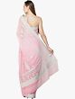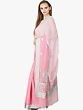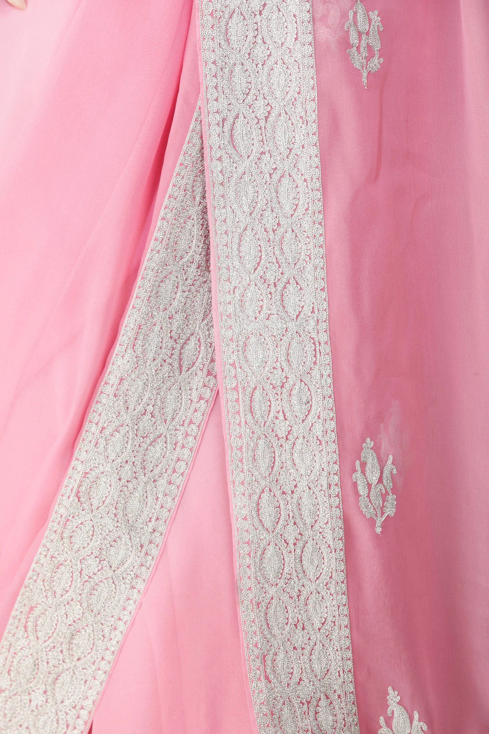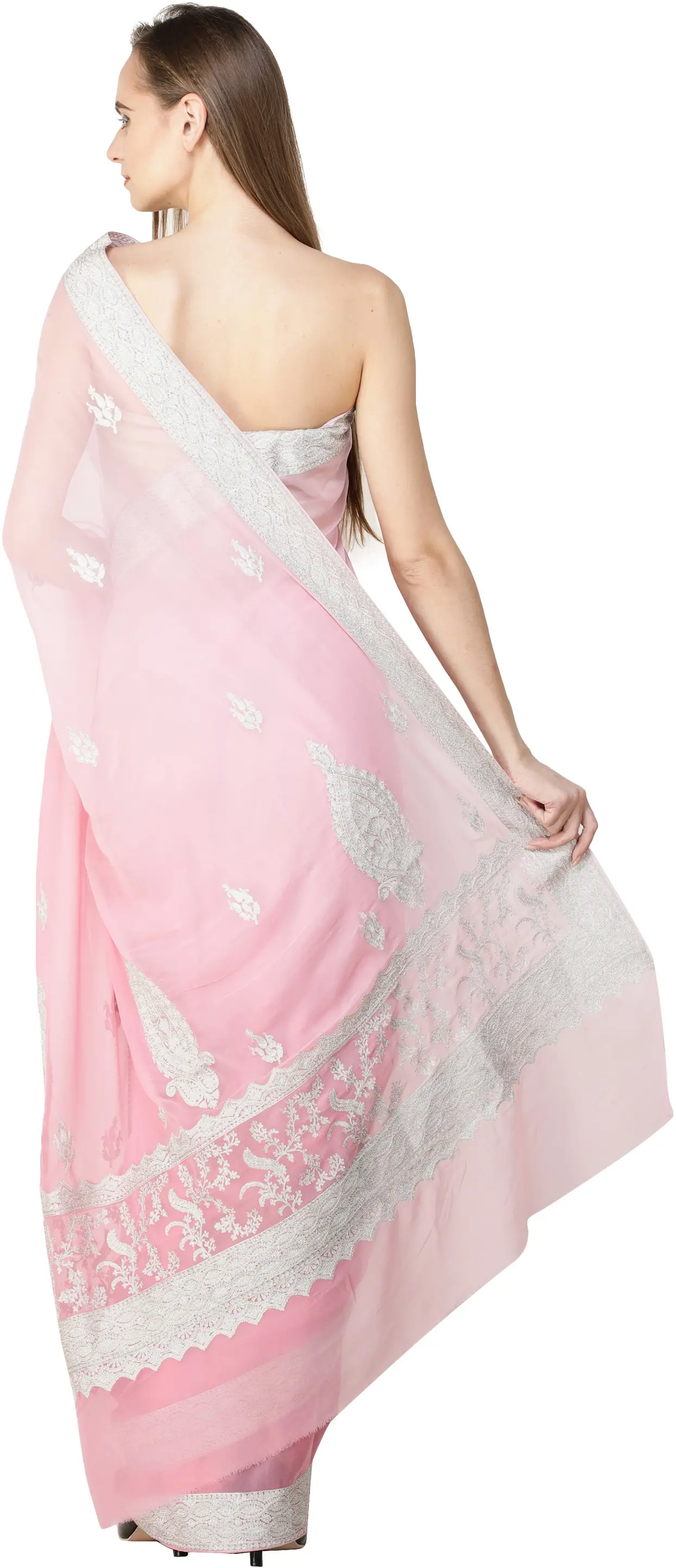 The true magic of this saree lies in its intricate embellishments. Adorning the borders and scattered across the flowing expanse of the fabric are meticulously hand-embroidered paisleys in shimmering silver zari thread. Each motif is a masterpiece in itself, showcasing the rich heritage of Kashmiri embroidery. The paisleys, with their teardrop-like forms and intricate detailing, are a symbol of fertility and good fortune, adding a deeper layer of meaning to this already stunning creation. The silver zari catches the light beautifully, creating a subtle yet striking contrast against the soft pink of the chiffon, promising to turn heads wherever you go.