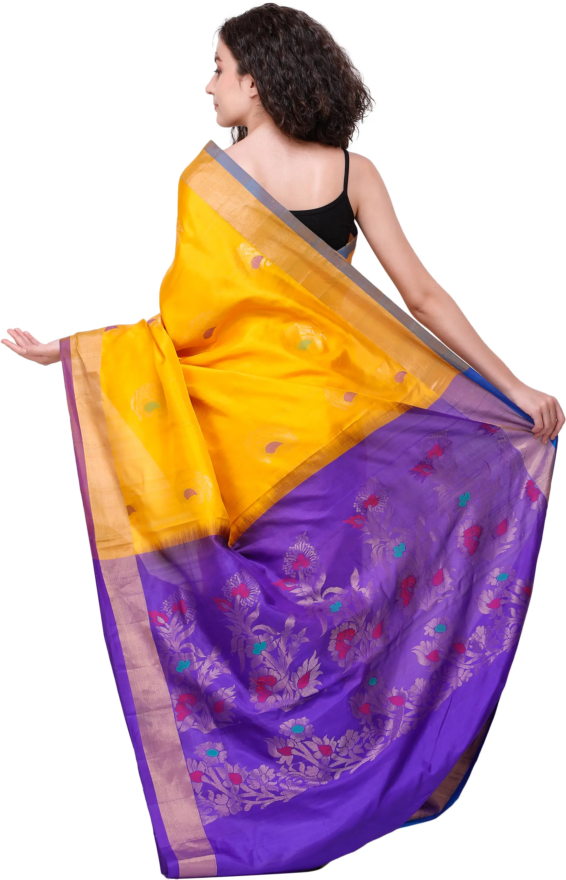 Drape yourself in the exquisite charm of this pure silk Uppada saree, a testament to traditional Indian craftsmanship with a modern sensibility. Originating from the renowned weaving clusters of Bangalore, this saree is a masterpiece of artistry, designed to make you feel like royalty. The vibrant saffron hue of the main body radiates a cheerful and regal aura, instantly catching the eye and illuminating any occasion.