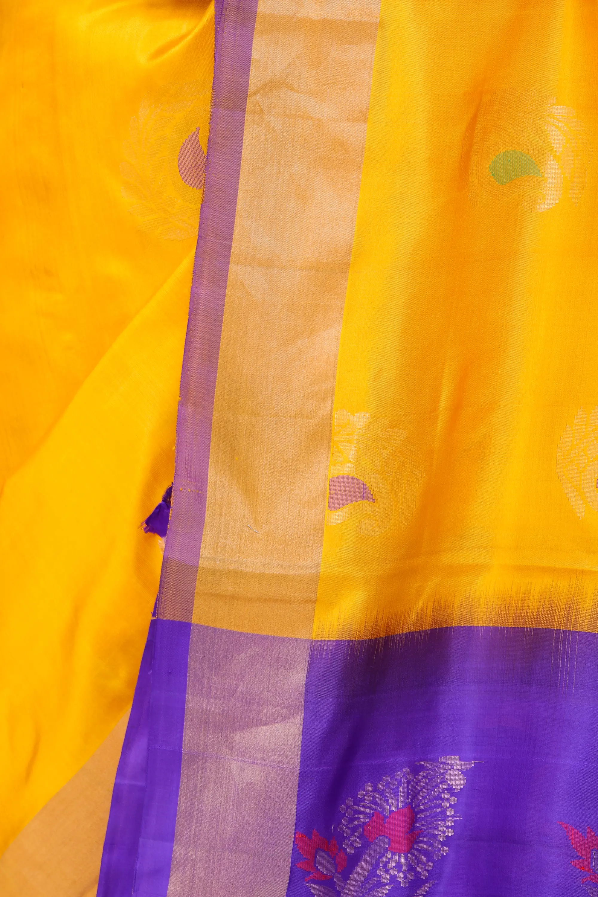 Zinnia-Yellow Brocaded Uppada Silk Saree from Bangalore with Green Border and Peacocks on Pallu