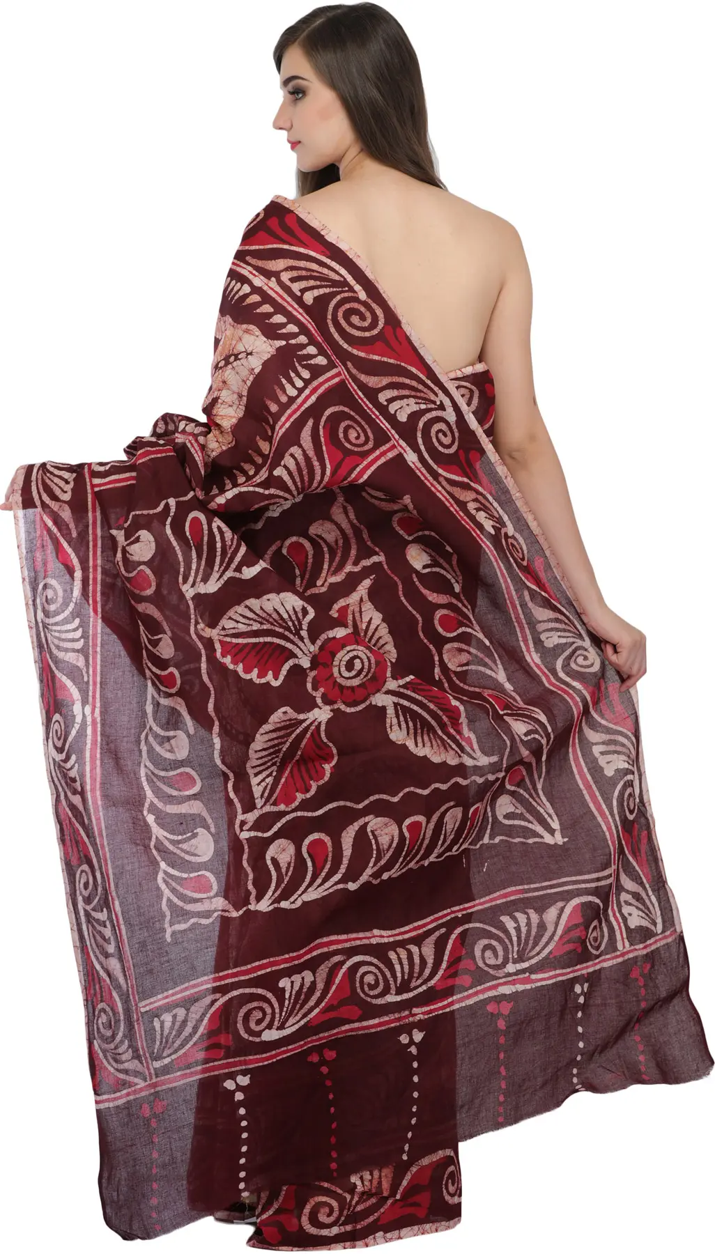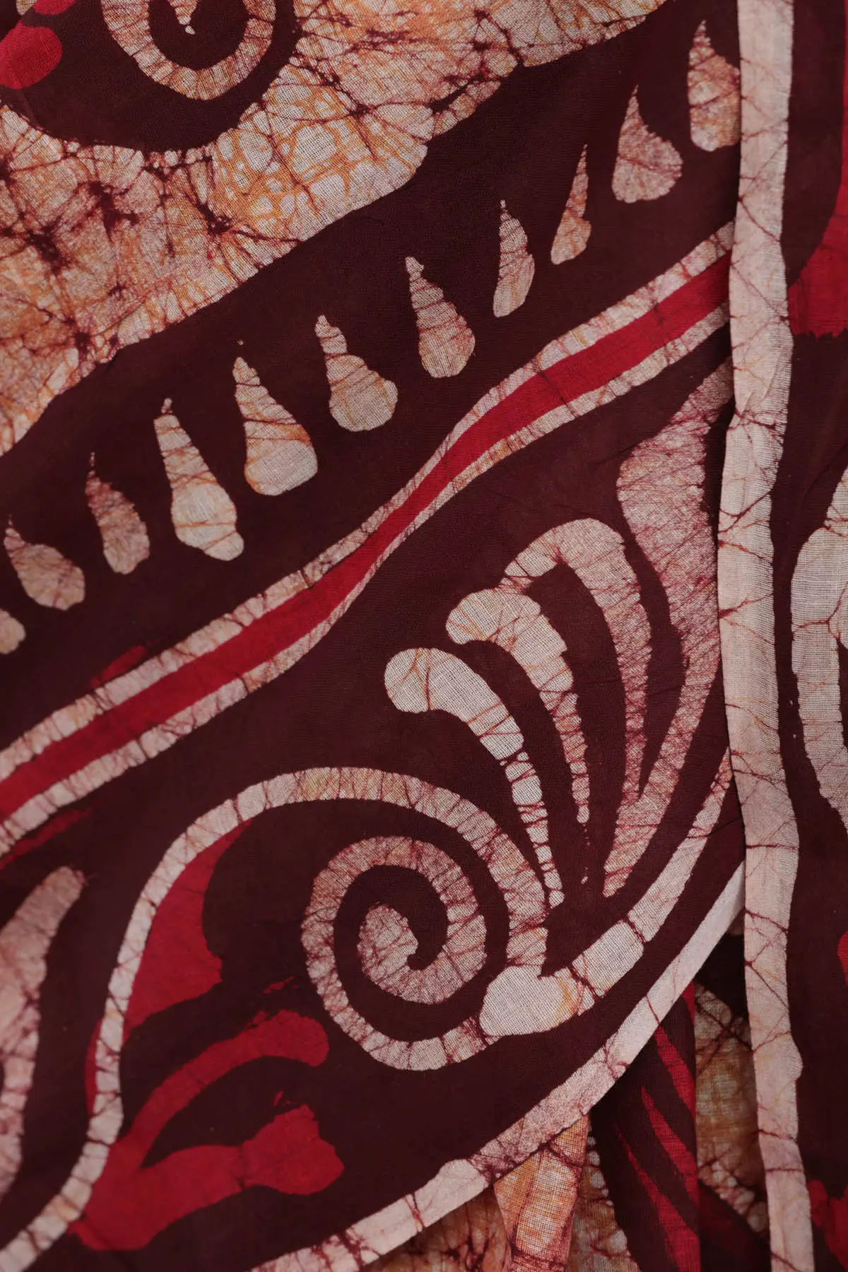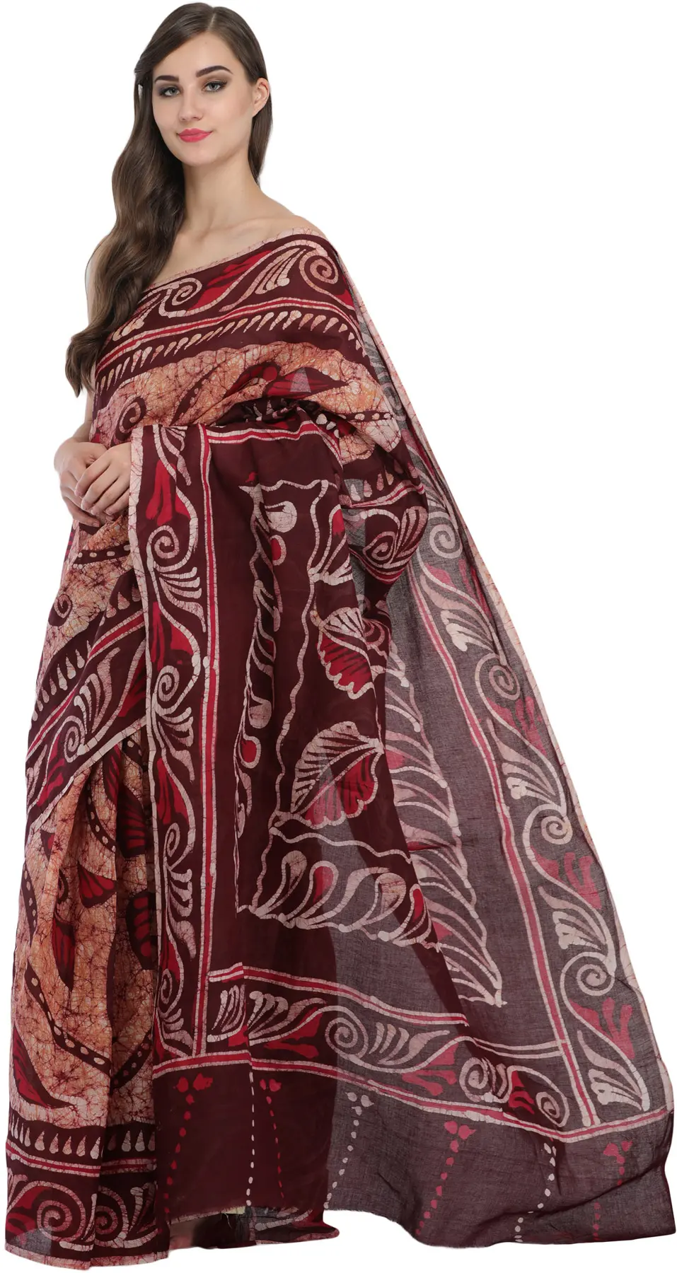 Immerse yourself in the rich cultural tapestry of Madhya Pradesh with this exquisite pure cotton sari. Adorned with intricate batik prints, this garment is a testament to the region's artistic heritage, offering a unique blend of traditional craftsmanship and contemporary design. The name "Sandstone Batik" evokes the warm, earthy tones that form the base of this stunning piece, reminiscent of the ancient rock formations found in the heart of India. The beauty of this sari lies in its artisanal printing technique. Batik, a wax-resist dyeing method, is skillfully employed to create mesmerizing patterns. The process involves applying wax to the fabric, which then resists the dye, allowing for the creation of delicate, organic designs. This particular sari showcases a captivating interplay of colors, primarily a rich maroon and a soft, natural sandstone hue, highlighted by crisp white accents. The motifs are a delightful fusion of abstract swirls and stylized floral or leaf-like elements, each meticulously rendered to create a visually arresting composition. The overall effect is both sophisticated and free-spirited, making it a truly captivating addition to any wardrobe.