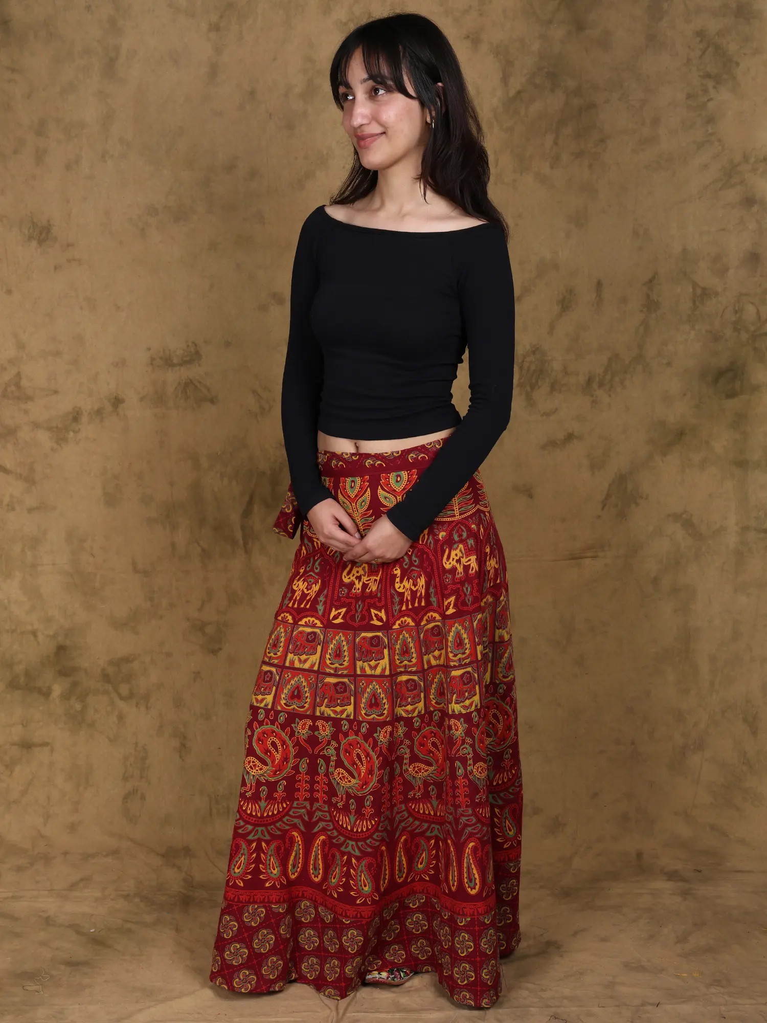 Discover the captivating allure of this exquisite long skirt, a testament to the rich artistic heritage of Sanganer, a renowned block-printing hub in Rajasthan, India. Each inch of this skirt is a canvas, meticulously adorned with a vibrant, traditional print featuring majestic elephants and graceful peacocks, symbols of prosperity, wisdom, and beauty. The deep, earthy red base is intricately detailed with warm yellows, greens, and hints of gold, creating a mesmerizing tapestry that evokes the spirit of Indian culture and craftsmanship.