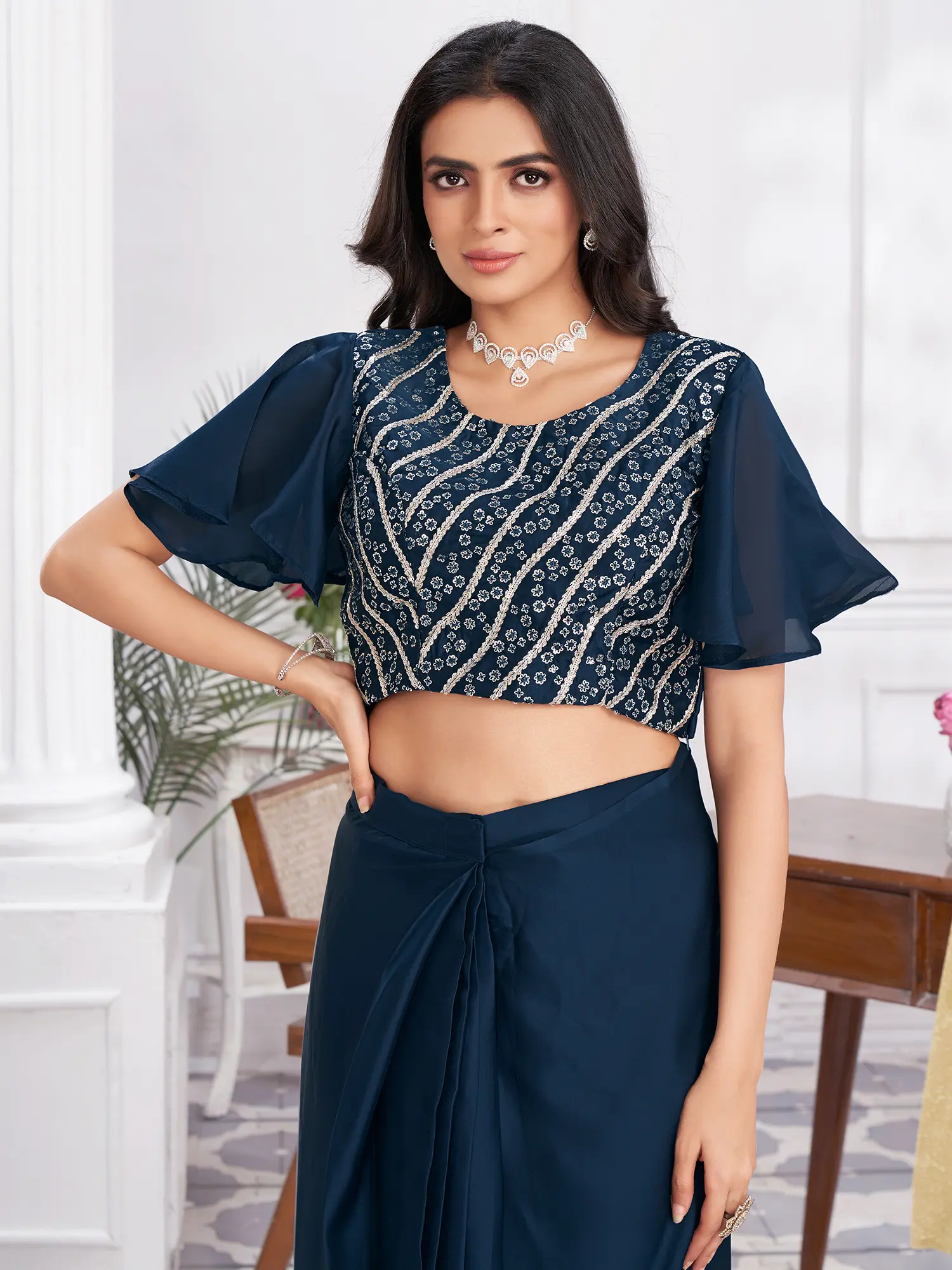 This saree breaks away from conventional draping, presenting a more contemporary and chic silhouette. The way the fabric is artfully arranged creates a flattering and fashionable look that is both comfortable and stylish. The design hints at an easy-to-wear, yet sophisticated style, making it an ideal choice for those seeking to blend traditional aesthetics with modern fashion sensibilities. The soft, flowing fabric ensures ease of movement, allowing you to celebrate and mingle with confidence and grace. This is more than just a saree; it's an experience in refined style and comfort.