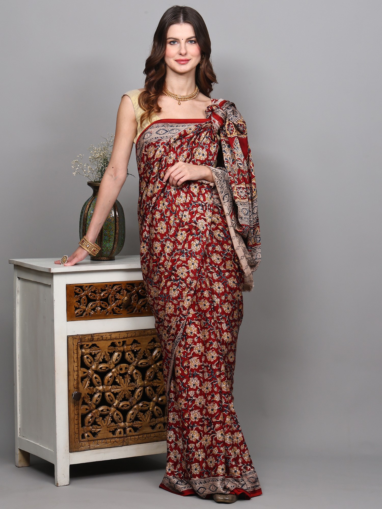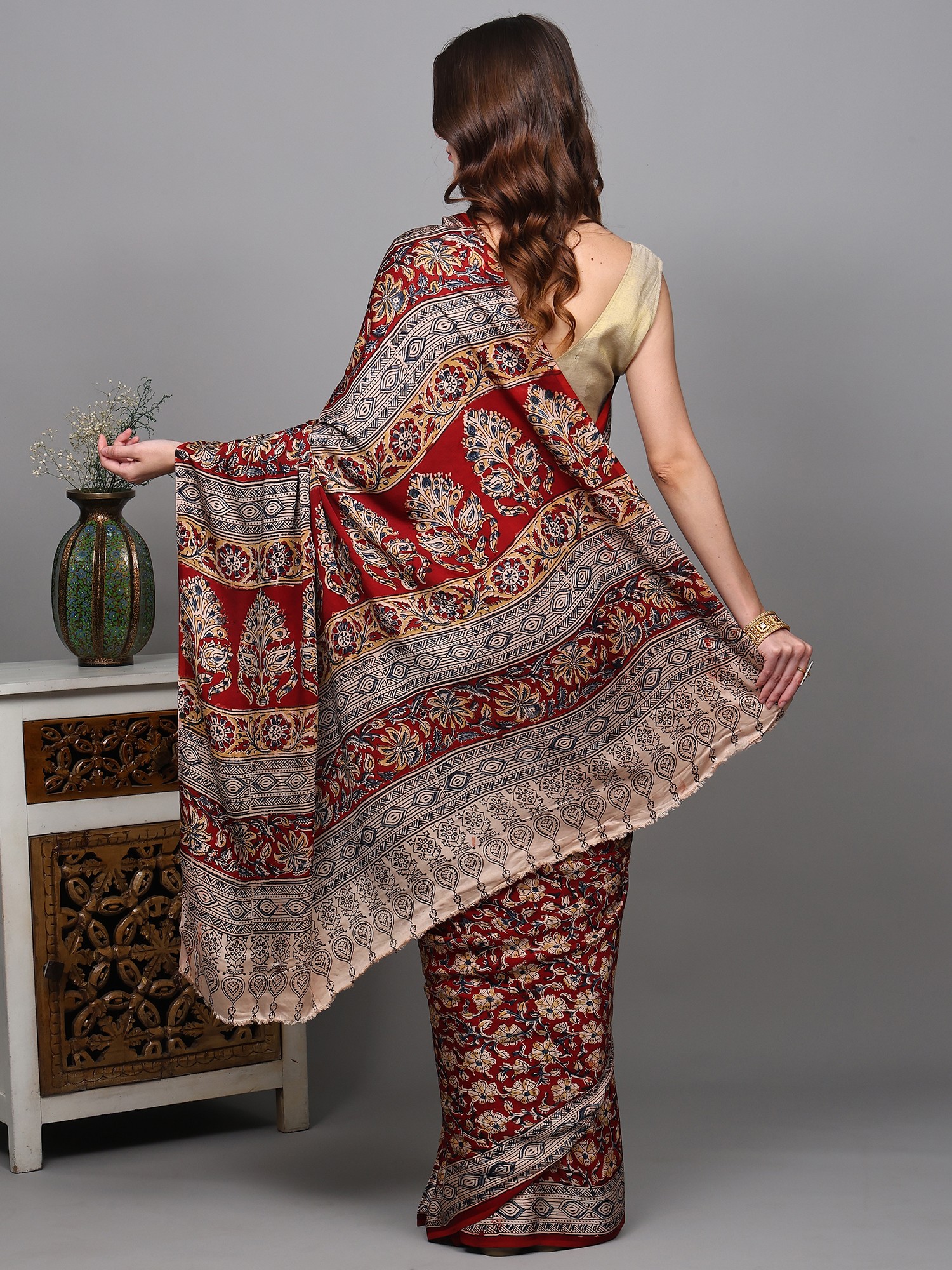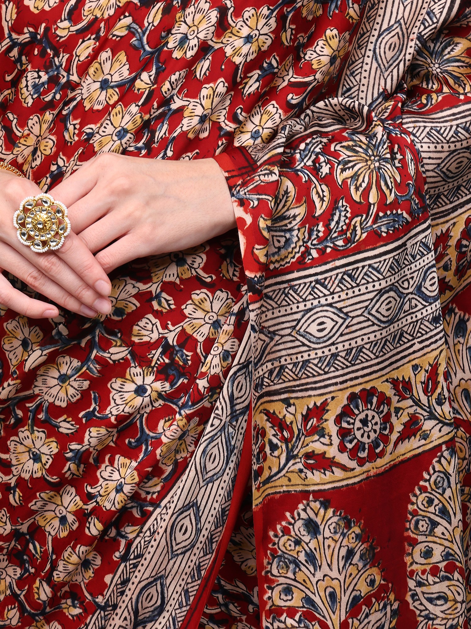 Rythmic-Red Kalamkari Saree with Printed All-Over Betel Leaf Vines from Telangana