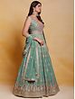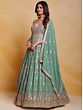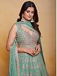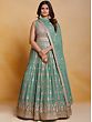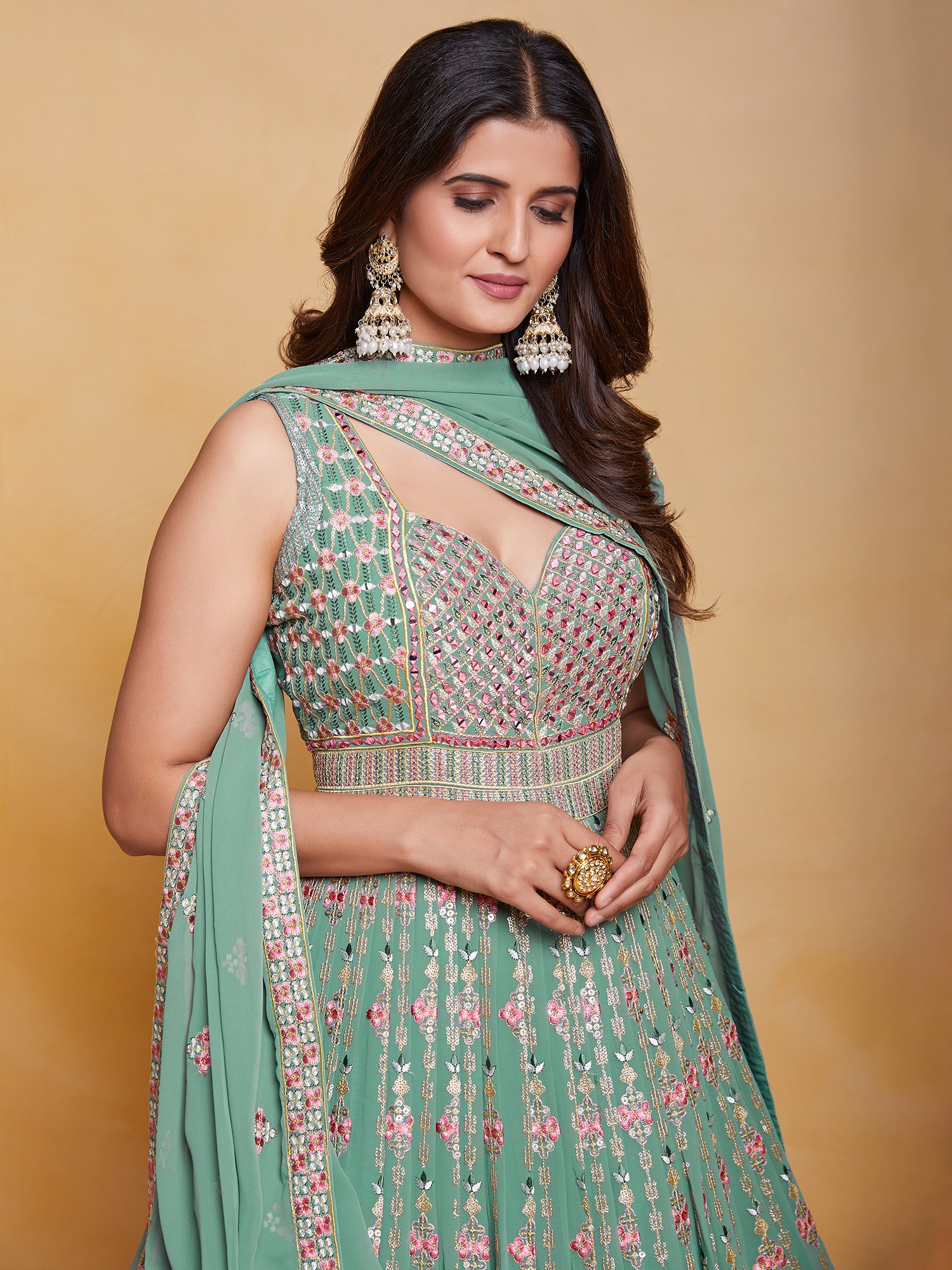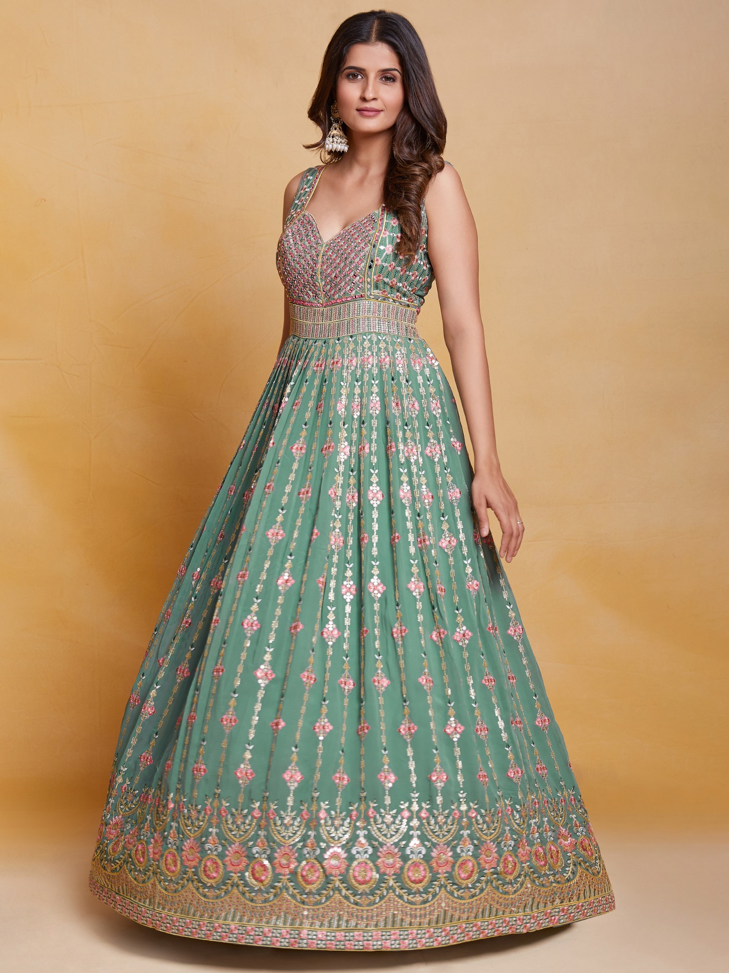 Become a picture of gorgeousness with this Sea-green Anarkali-style gown. Crafted with a soft and gracefully flowing georgette, the gown has a lovely length, adorned with a beautiful ethnic pattern. Threadwork all over creates floral details, embellished with sequins and mirrors that bring a glamorous shimmer to the gown, making it a statement of Indian festive spirit.