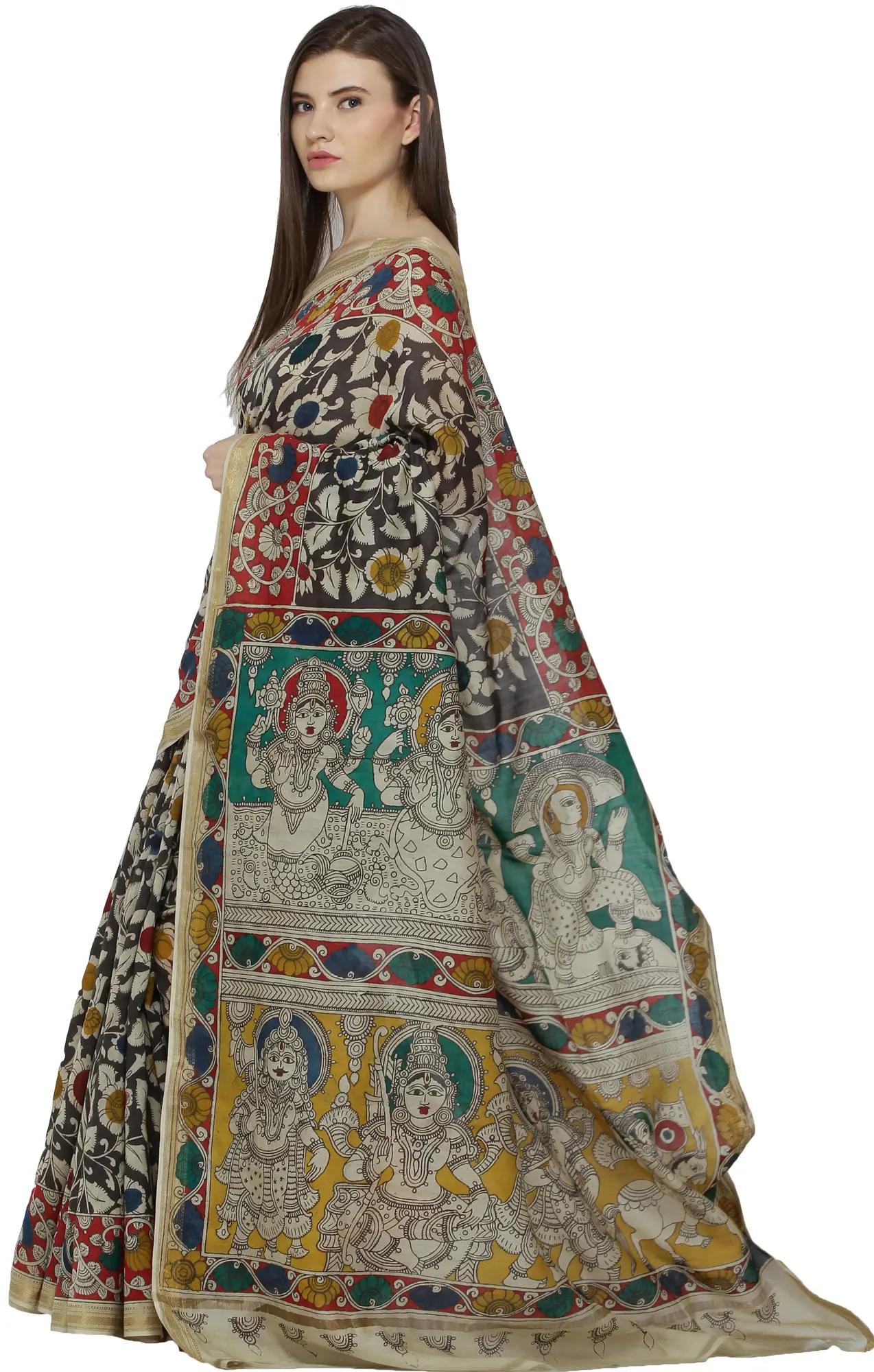 Kalamkari, meaning "pen-work," is an ancient art form that has been passed down through generations. Originating in the state of Andhra Pradesh, it is renowned for its detailed designs and the use of natural dyes. This particular sari exemplifies the traditional techniques, with every line and color applied with precision and care. The "Sea-Mist" in its name evokes the subtle, layered beauty of the dark base color, enhanced by the vibrant, yet harmonious, hues used in the motifs and the central narrative on the pallu. Wearing this sari is not just an act of adorning oneself with beautiful fabric; it is an embrace of a living art tradition and a connection to India's profound cultural heritage.