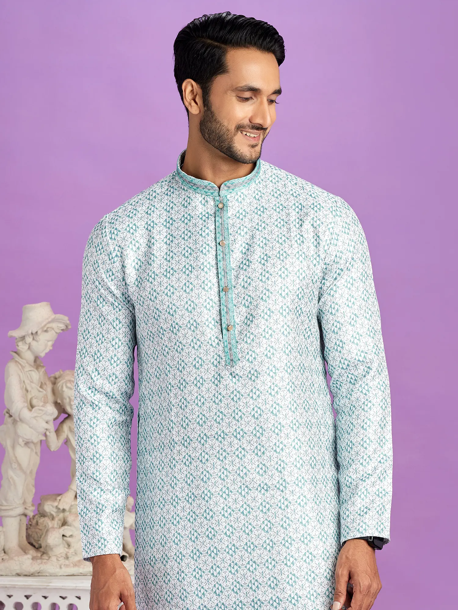 The kurta features a captivating digital print that showcases a delicate, repeating pattern in a soothing palette of white and light blue. This intricate detailing adds a touch of sophistication and visual interest, making the garment a true statement piece. The precise digital printing ensures the design remains crisp and vibrant, wash after wash. The classic straight-cut silhouette of the kurta is timeless, offering both ease of movement and a refined aesthetic.