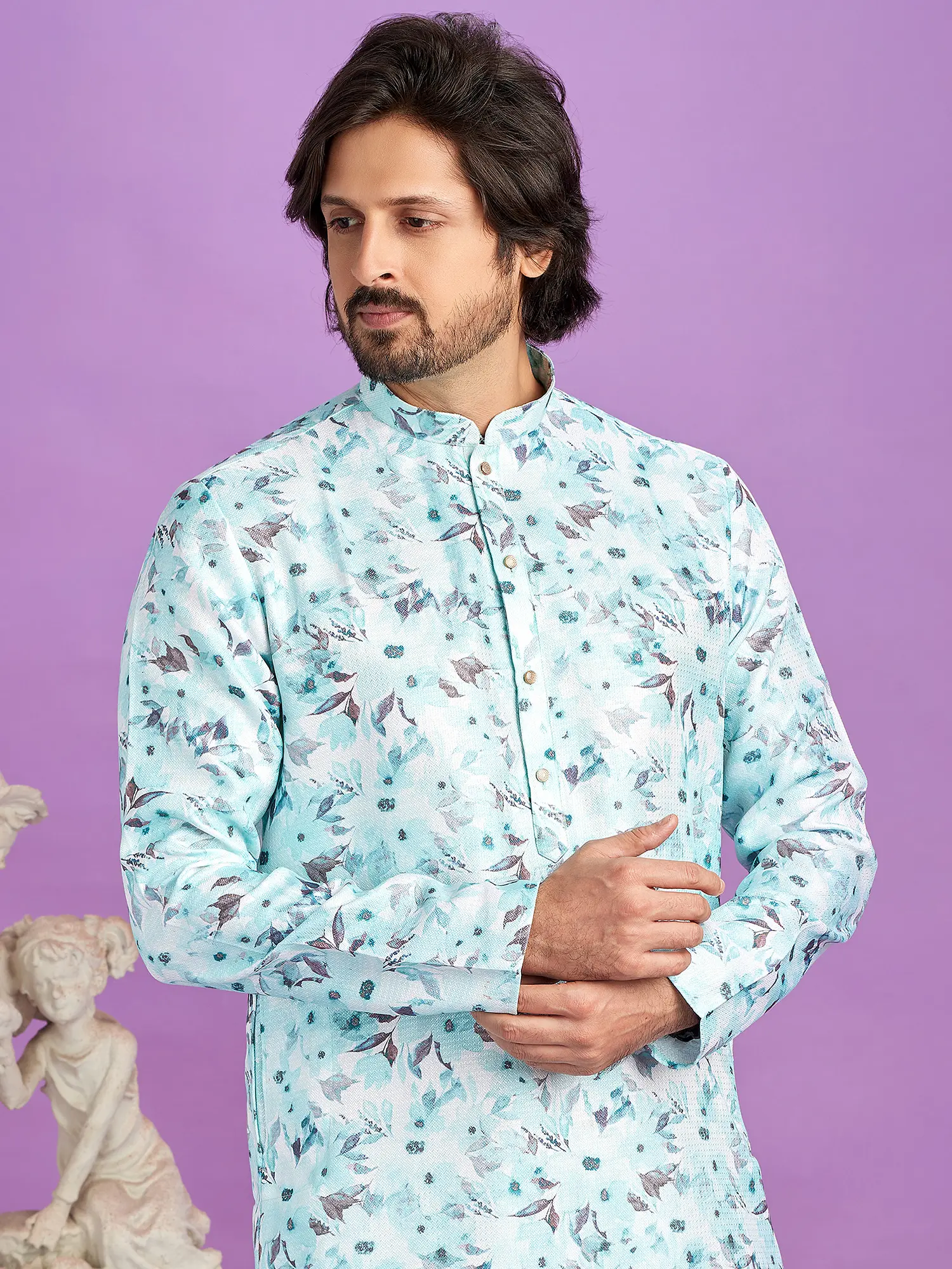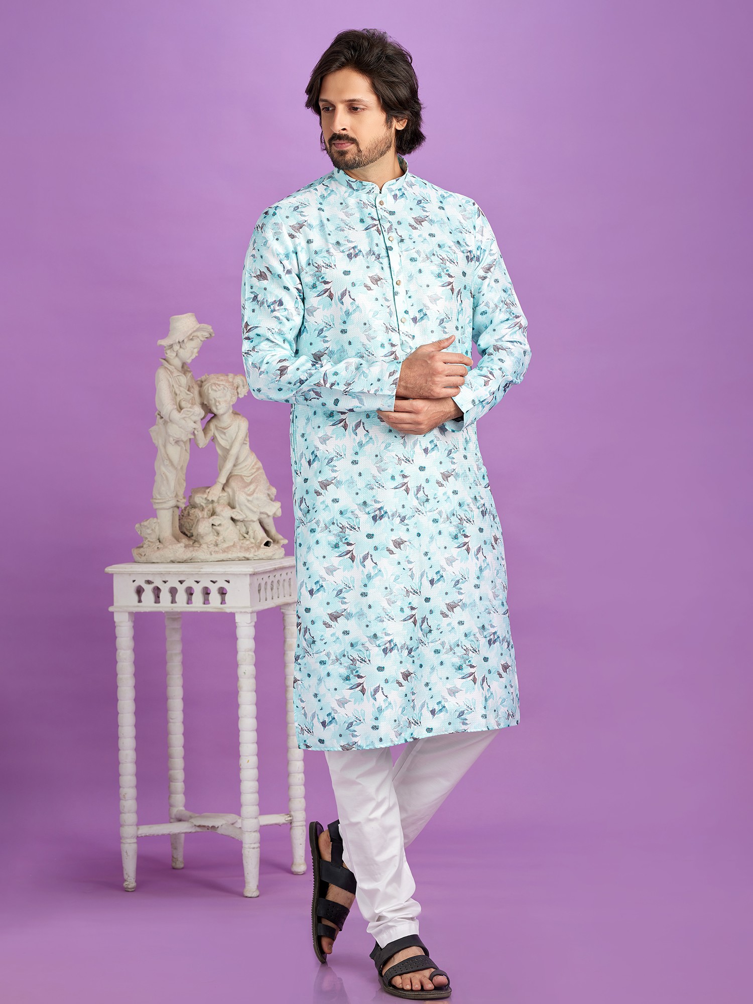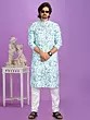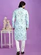 The kurta features a captivating digital print, a symphony of subtle floral motifs rendered in soothing aquamarine and muted earthy tones. This intricate design is presented on a straight-cut silhouette, offering a clean and modern aesthetic. The accompanying pajama provides a classic, comfortable base that perfectly complements the detailed artistry of the kurta, creating a balanced and sophisticated look.