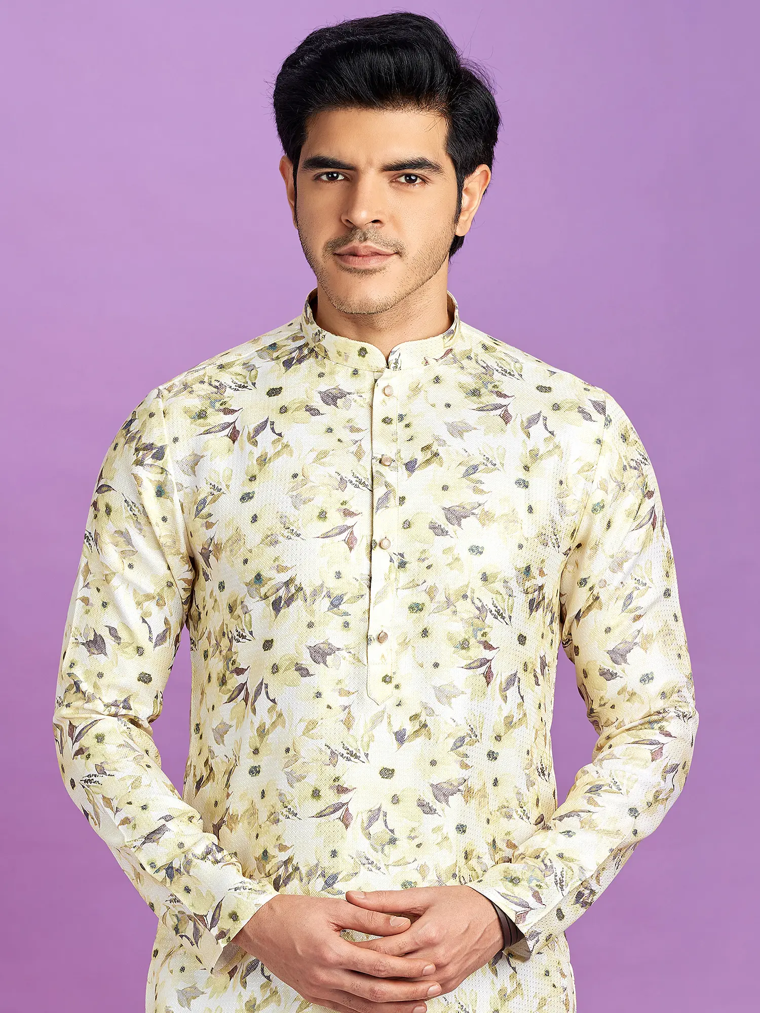 Wedding Kurta Pajama Set with All-Over Woven Floral Motifs in Self