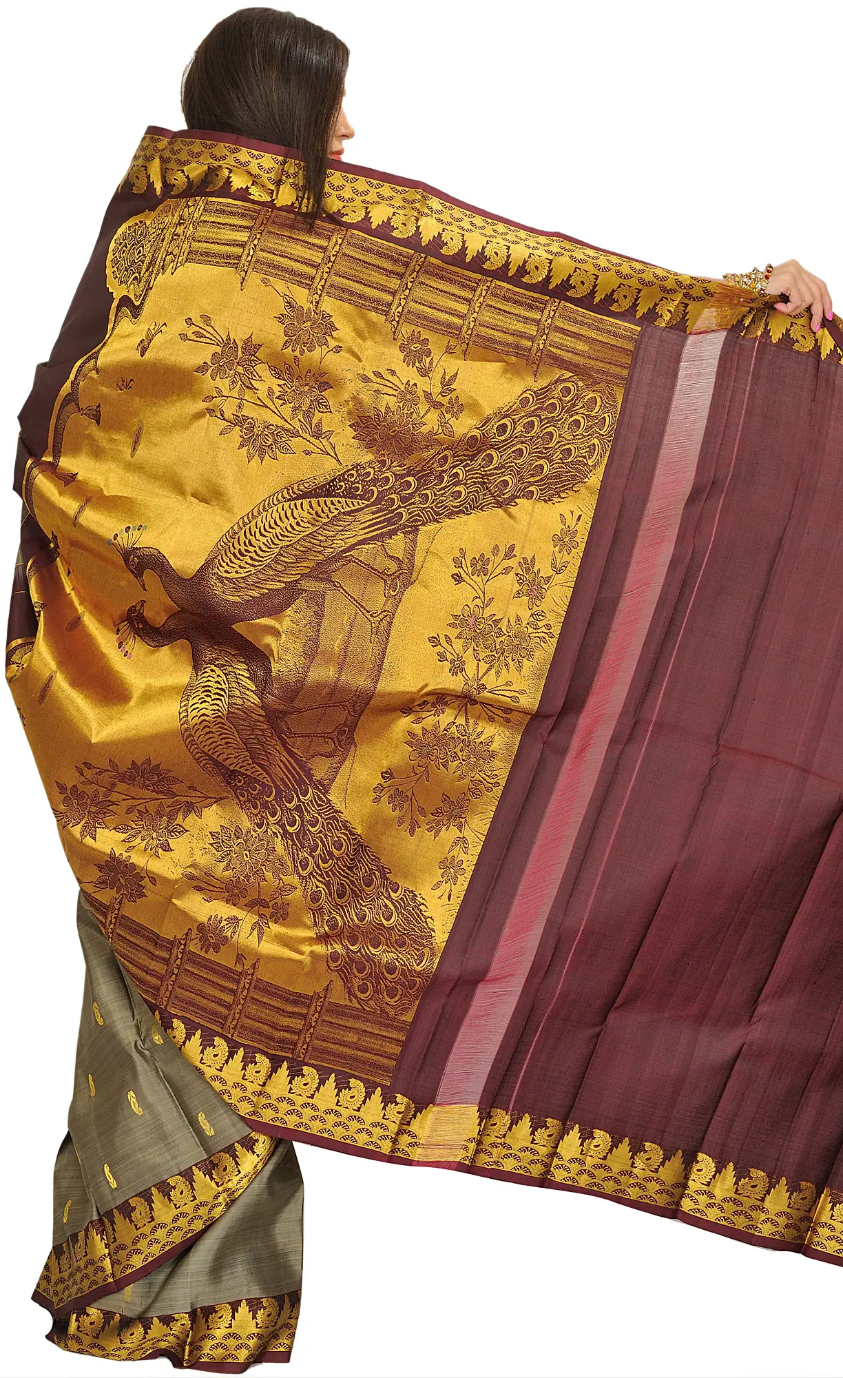 Seneca-Rock Kanjivaram Sari with Woven Paisleys and Peacock Pair on Aanchal