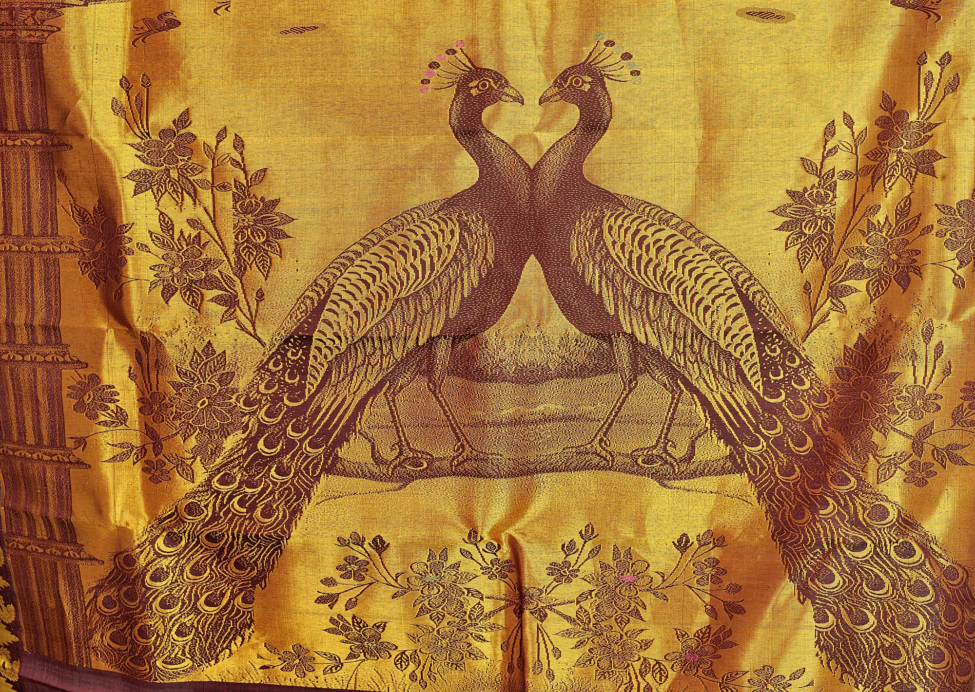 The true showstopper of this magnificent sari is its resplendent aanchal. Here, the artistry takes flight with a breathtaking depiction of a pair of majestic peacocks rendered in a radiant, lustrous gold. The intricate weaving details bring the birds to life, showcasing the iconic fanned tails and proud crests. Surrounding the peacocks is a delicate floral motif, also woven in the same rich gold, creating a vibrant and captivating tableau. This aanchal is not merely a part of the sari; it is a work of art, a testament to the skill of the weavers who have transformed pure silk into a flowing masterpiece of mythological and natural symbolism. The interplay of the seneca-rock base and the dazzling gold aanchal creates a visual harmony that is both striking and deeply traditional.
