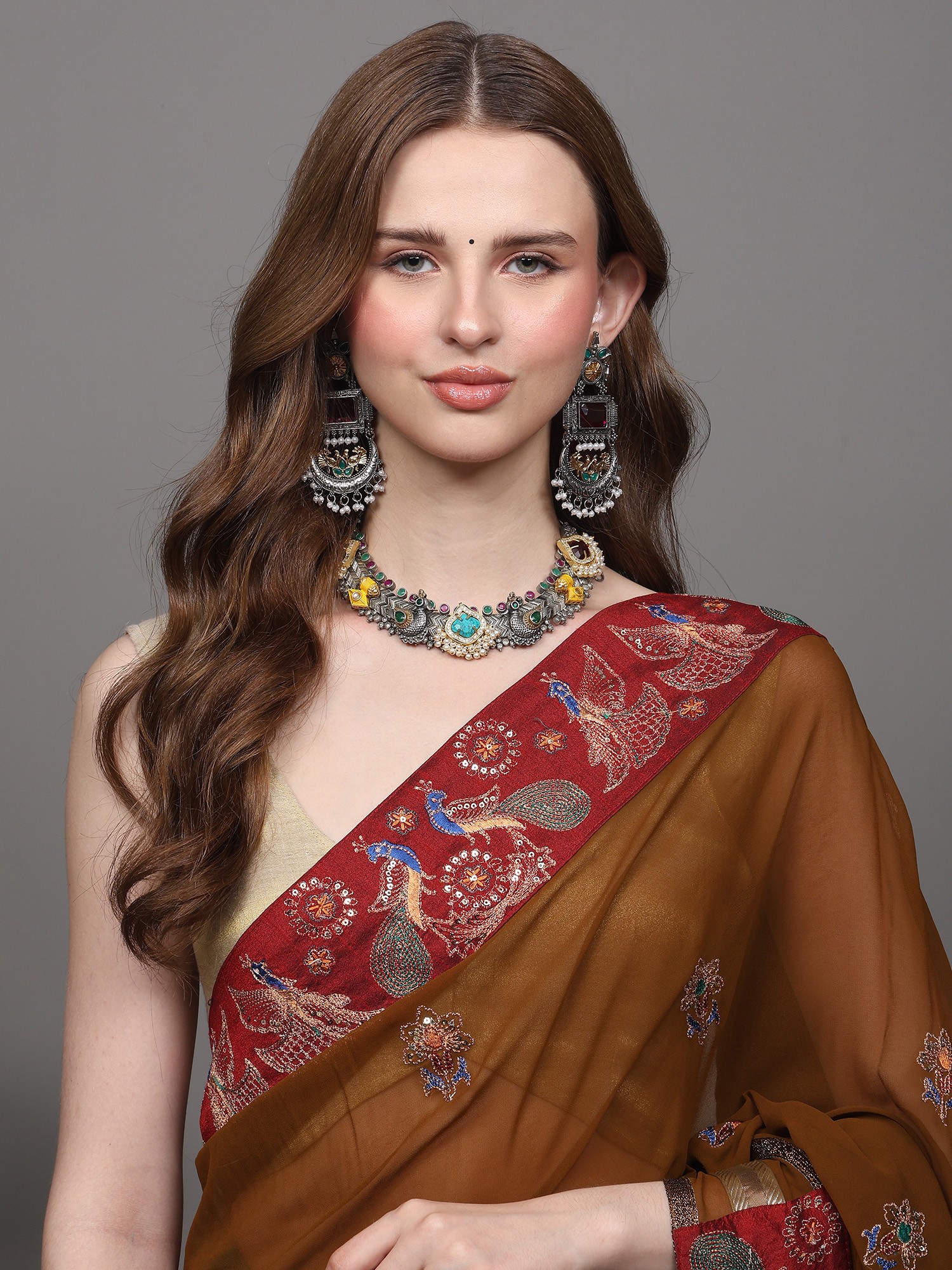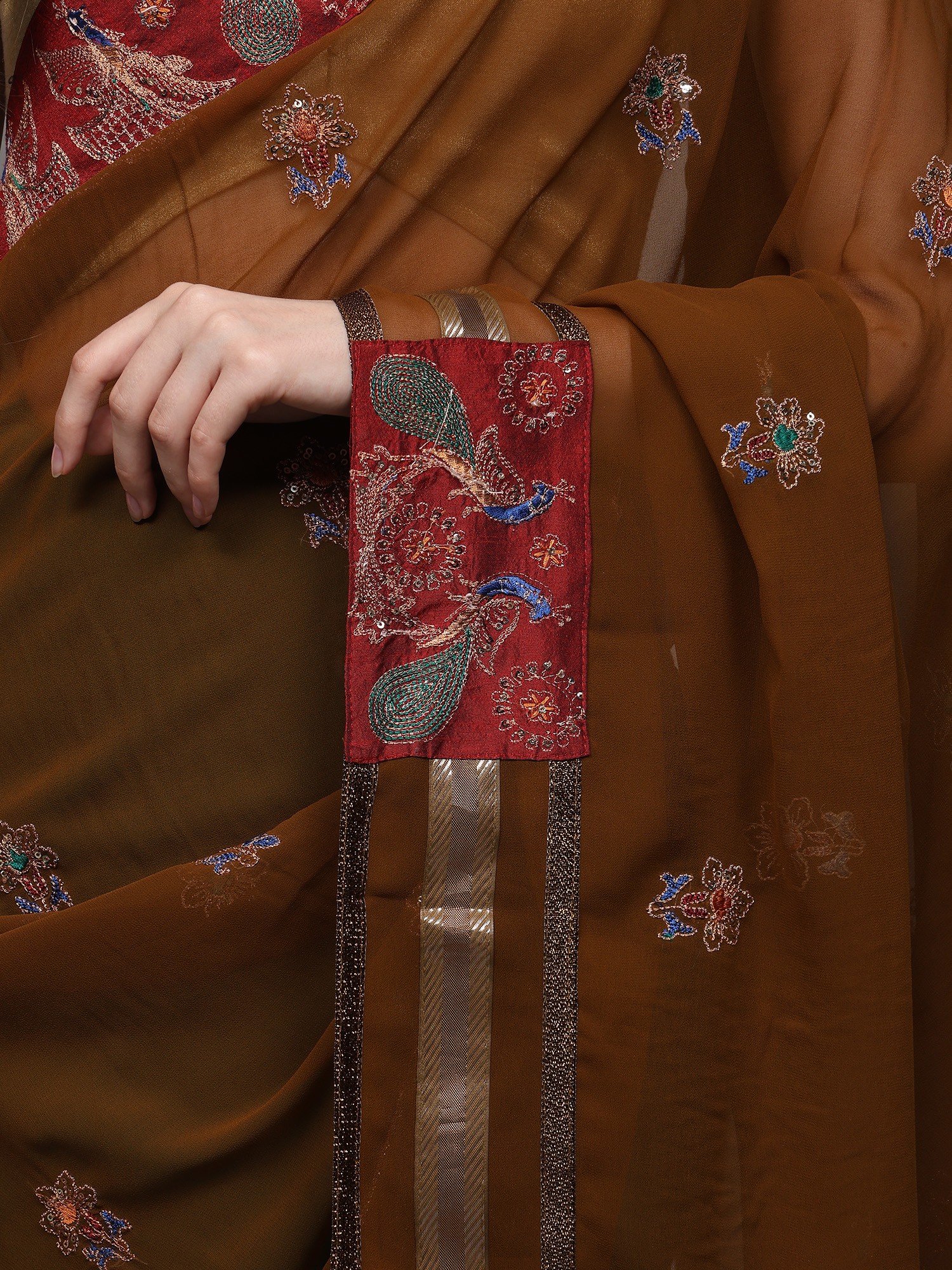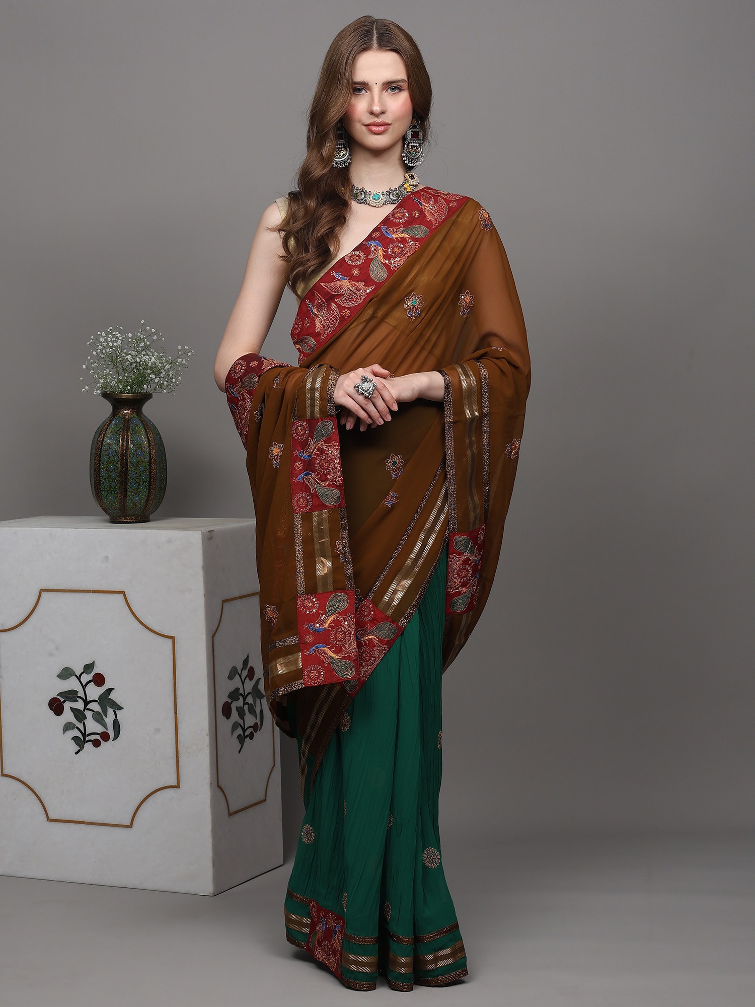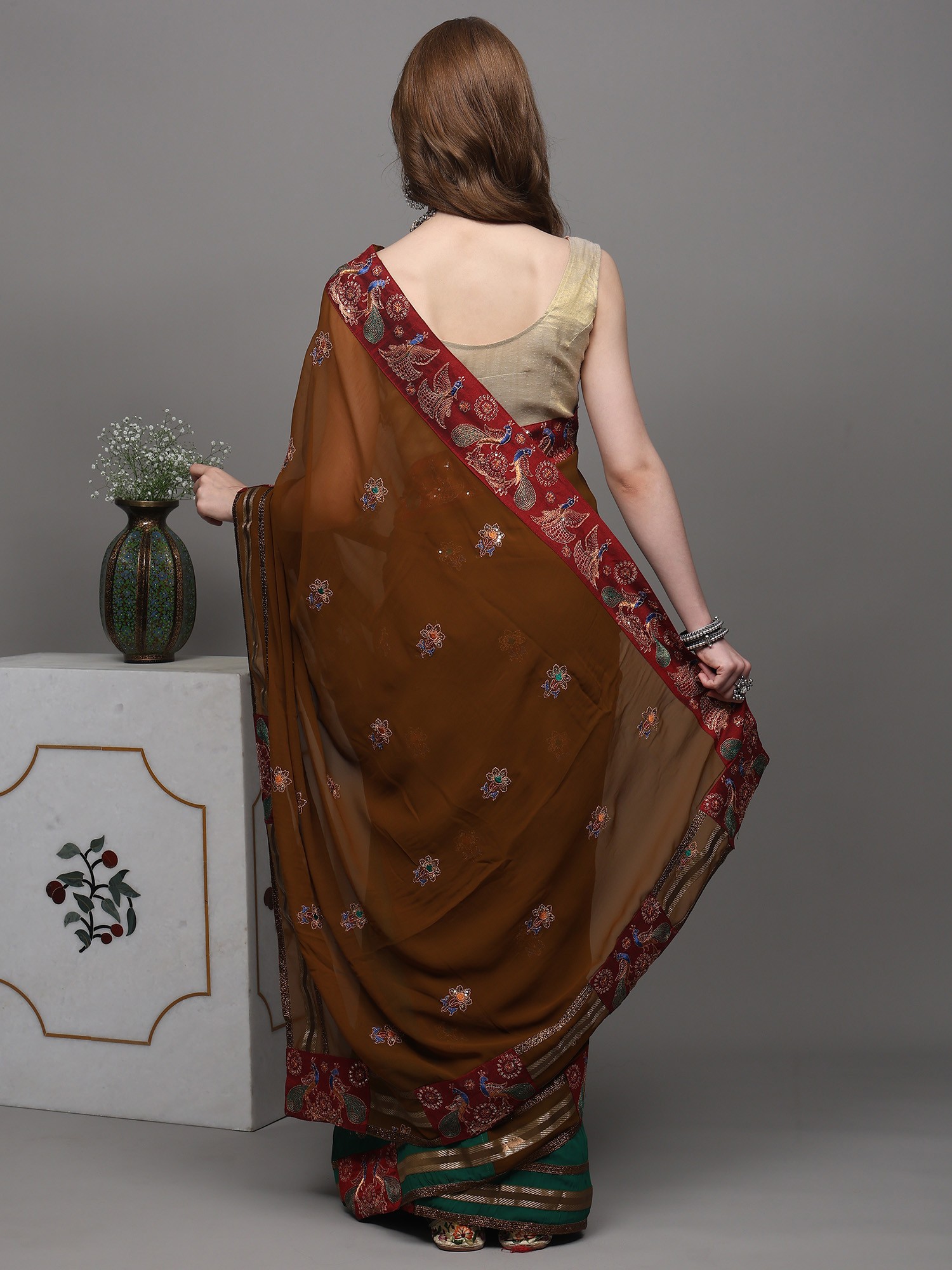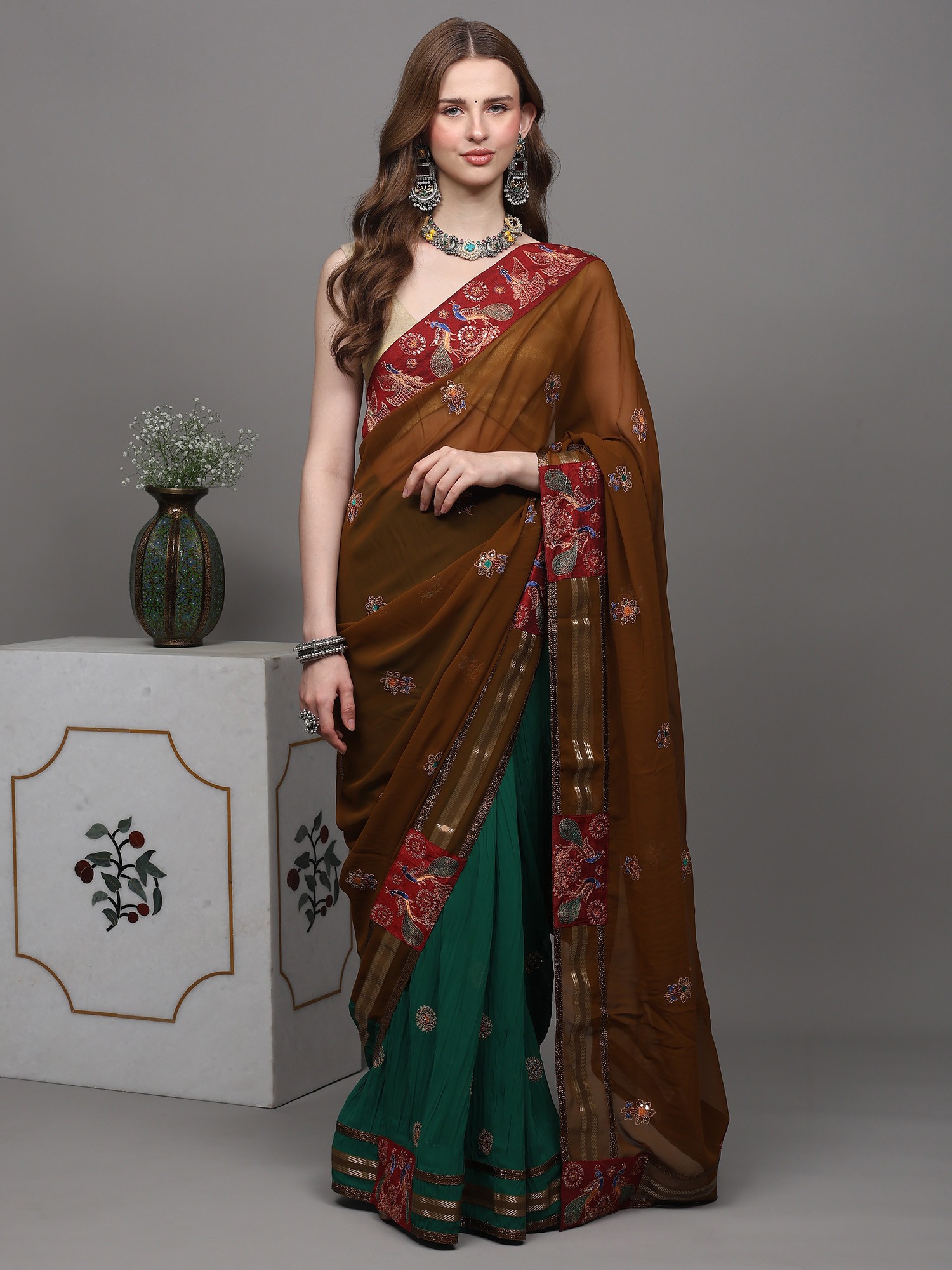 Adorn yourself with allure in our Sepia and Green Designer Saree, where sepia meets green in a symphony of elegance. Comfort meets style with the graceful georgette drape, embellished by sequins embroidered into exquisite flowers. The color choice intertwines earthy warmth with natural vibrance, celebrating contrast. Each sequin sparkles like dew on petals, evoking a sense of delicate beauty. This sari isn't just attire; it's a canvas of craftsmanship, a fusion of color and texture that wraps you in an aura of sophistication. Drape yourself in artistry and embrace a new level of grace that transcends trends.