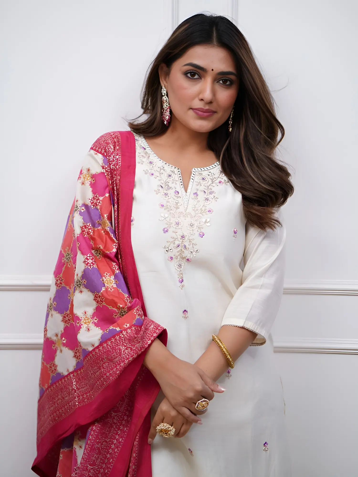 Crafted from high-quality viscose chanderi fabric, this salwar suit offers a luxurious feel and comfortable fit. The breathable material ensures you stay comfortable all day long, while the tailored design flatters your silhouette. This ensemble not only looks fabulous but also provides the ease and comfort you need to move with confidence and grace. It is designed keeping in mind for you to enjoy the best of both worlds - style and comfort.