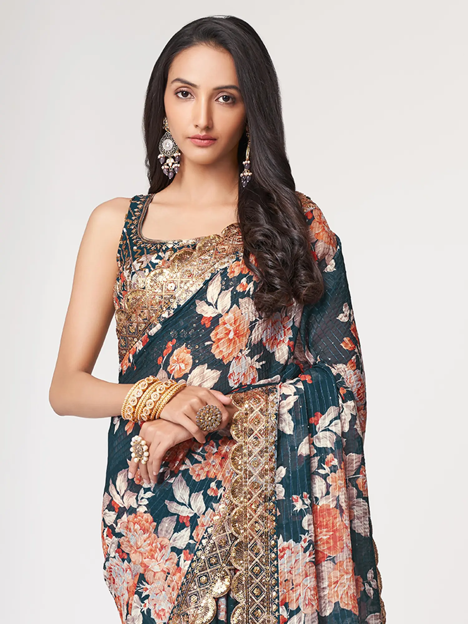 A stylish element is added by the scalloped border which is adorned with golden sequins to amplify the festive feel of the saree.