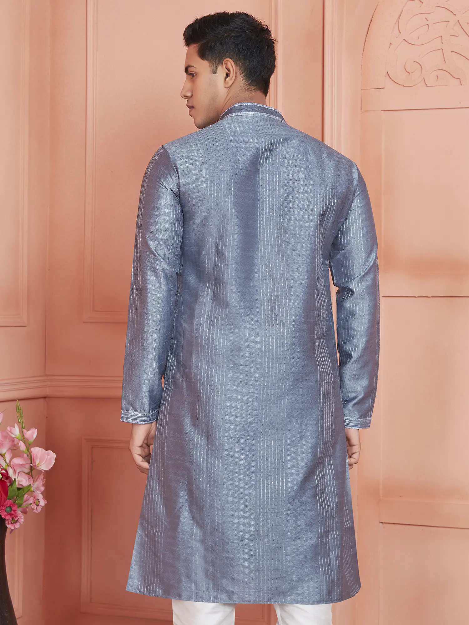 Metallic-Thread Embroidered Kurta Pajama with Floral Fauna Motifs and Sequins work
