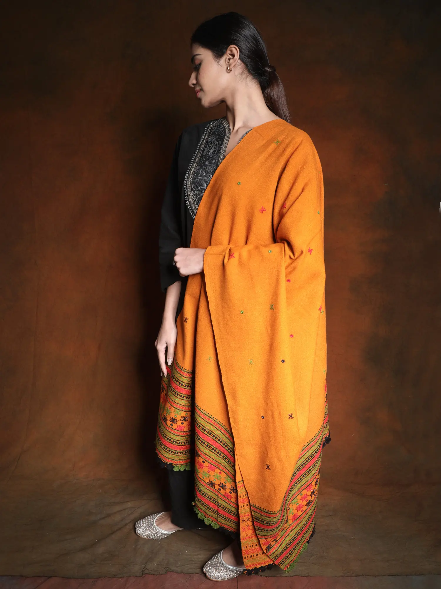 Crafted from pure wool, this shawl offers unparalleled warmth and softness, making it an ideal companion for cooler evenings or a stylish addition to your winter wardrobe. The natural fibers provide excellent insulation while remaining breathable, ensuring comfort in a variety of temperatures. The generous dimensions allow for versatile styling. Drape it elegantly over your shoulders for a sophisticated evening look, wrap it snugly around yourself for cozy warmth on a chilly day, or let it cascade artfully to showcase its stunning embroidered border. The timeless design and the inherent beauty of the craftsmanship ensure that this shawl will remain a cherished piece in your collection for years to come, transcending fleeting fashion trends. It’s more than just an accessory; it’s a wearable piece of art, carrying with it the stories and traditions of its origin.