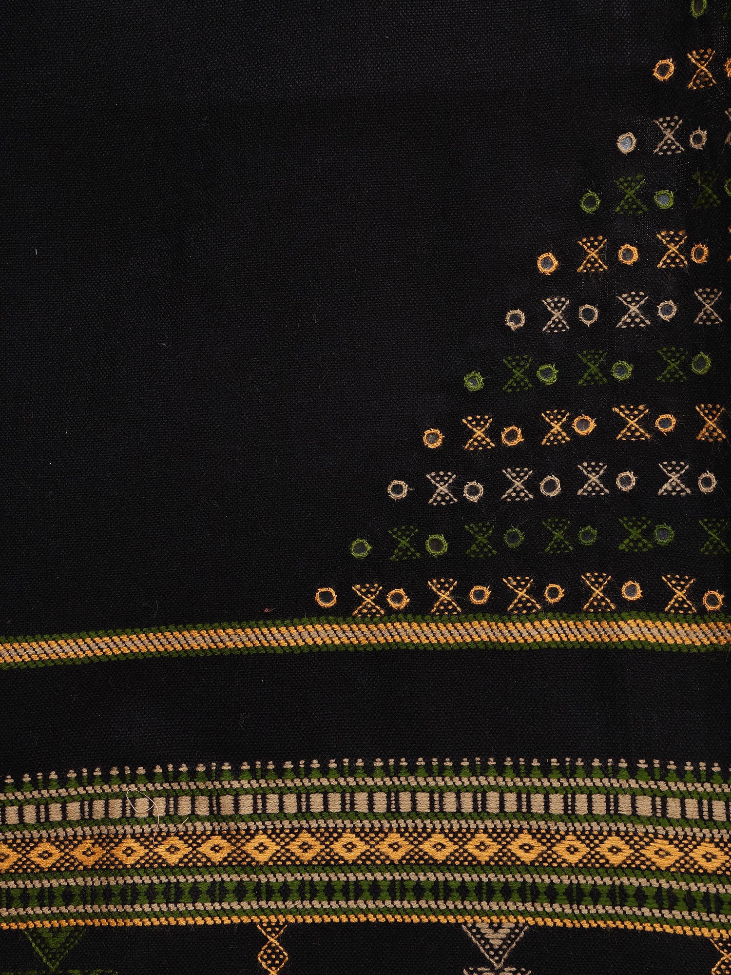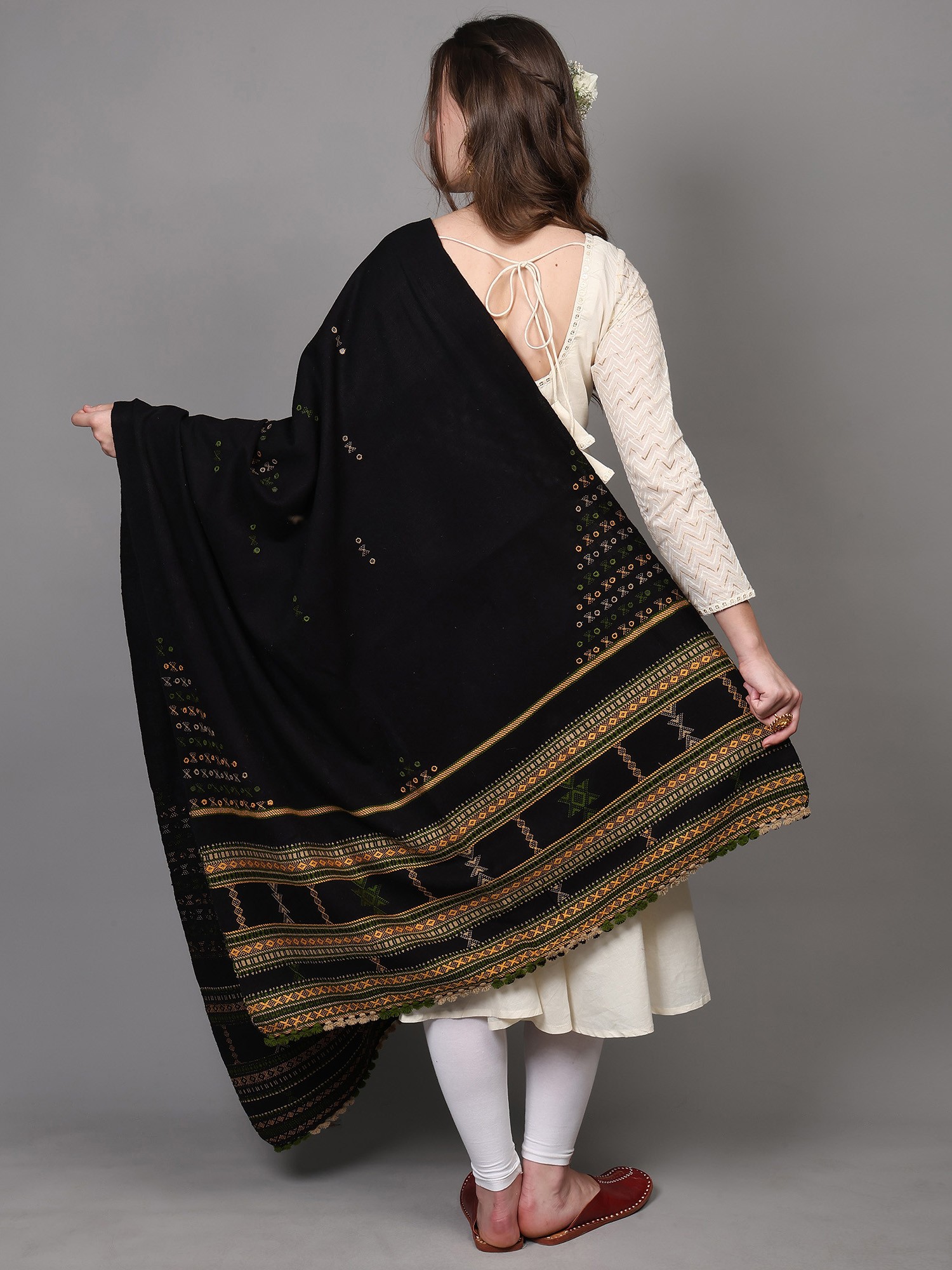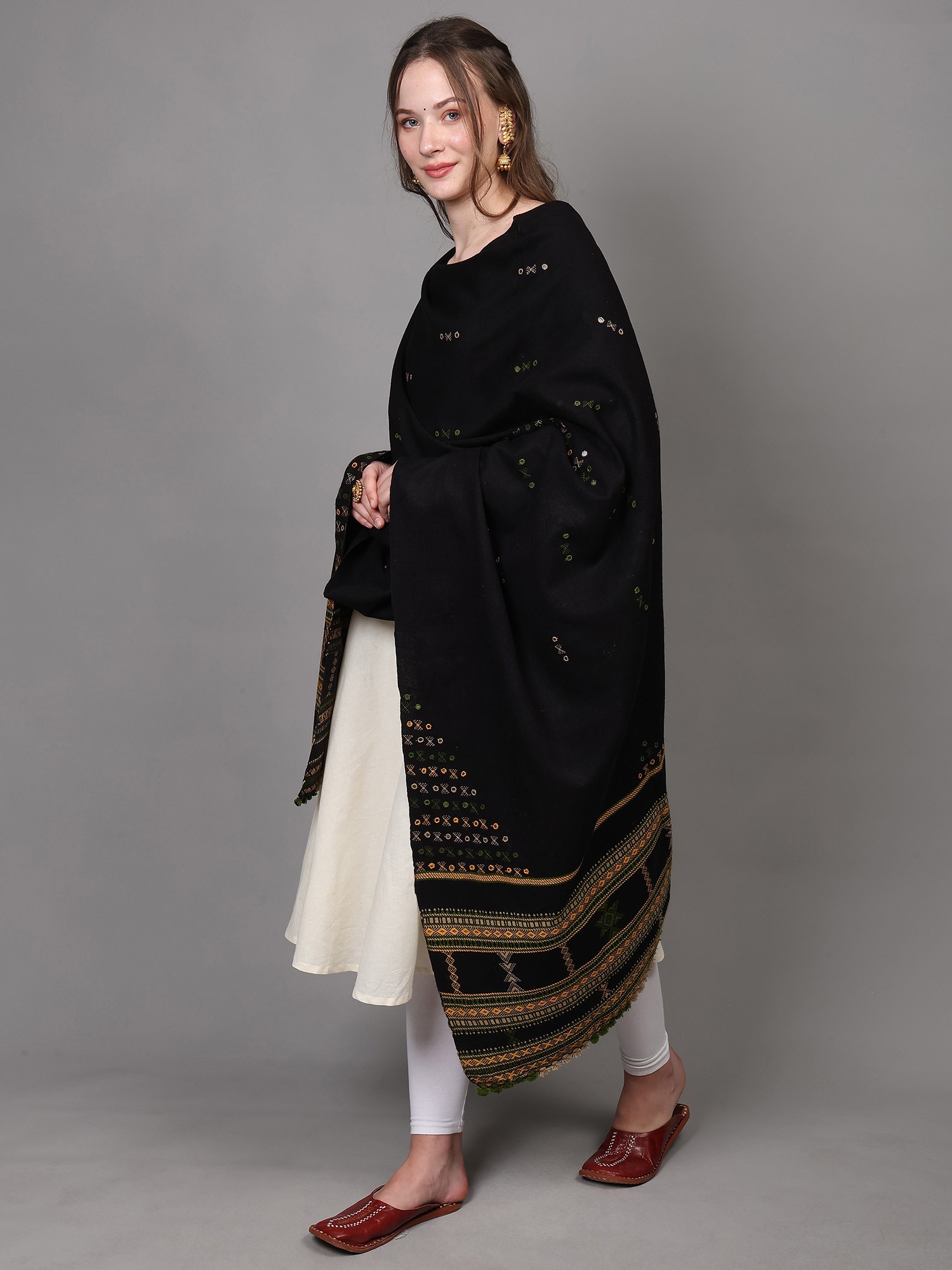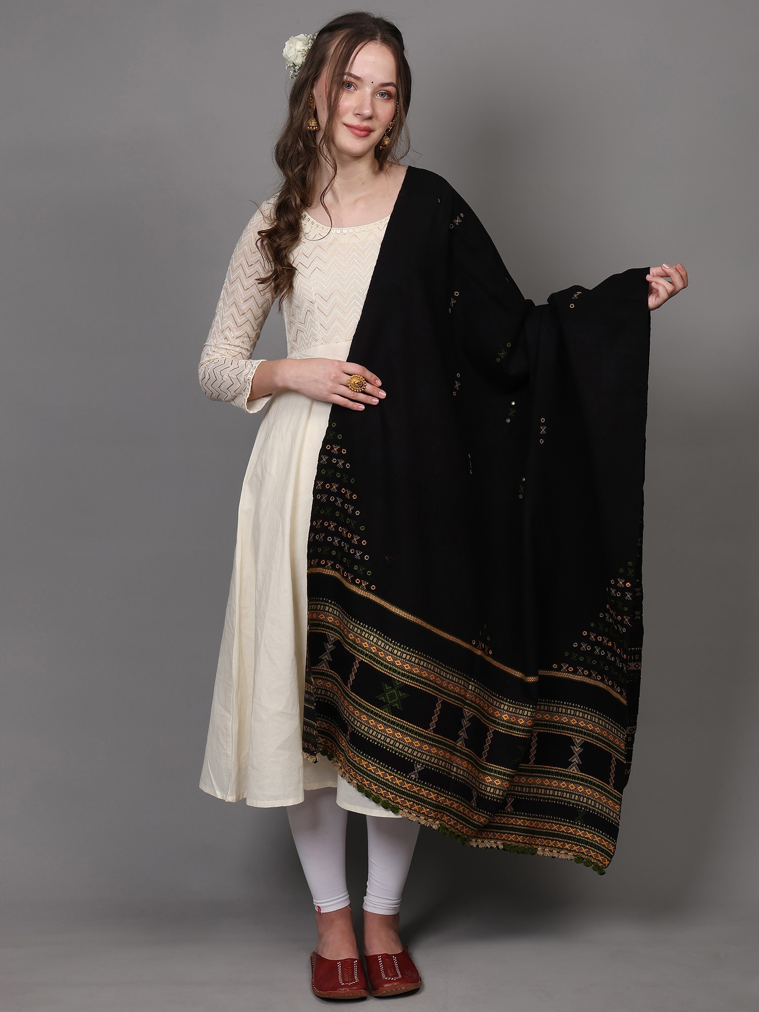 Discover the allure of traditional Indian craftsmanship with this exquisite shawl, a testament to the rich textile heritage of Kutch. Crafted from pure wool, this shawl offers unparalleled warmth and a luxuriously soft feel, making it the perfect companion for cooler days and evenings. The deep black hue serves as a striking canvas for the intricate details that bring this piece to life.