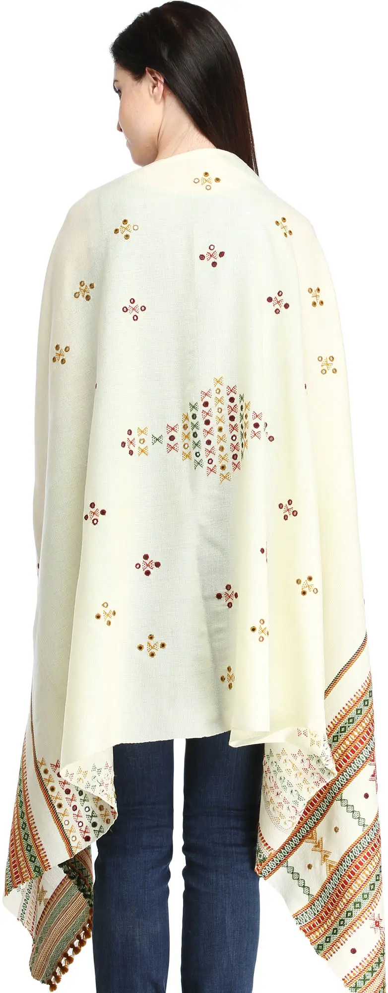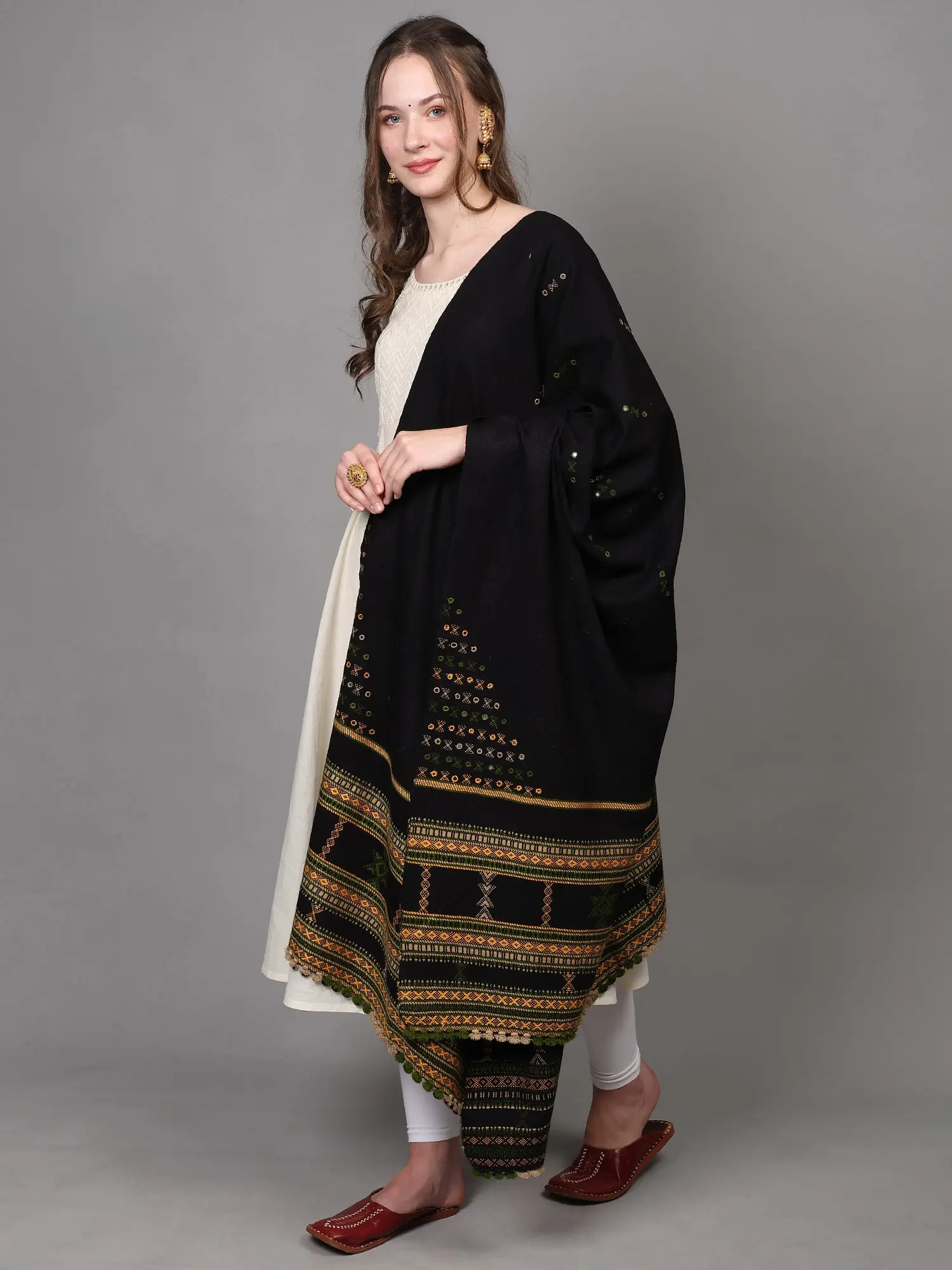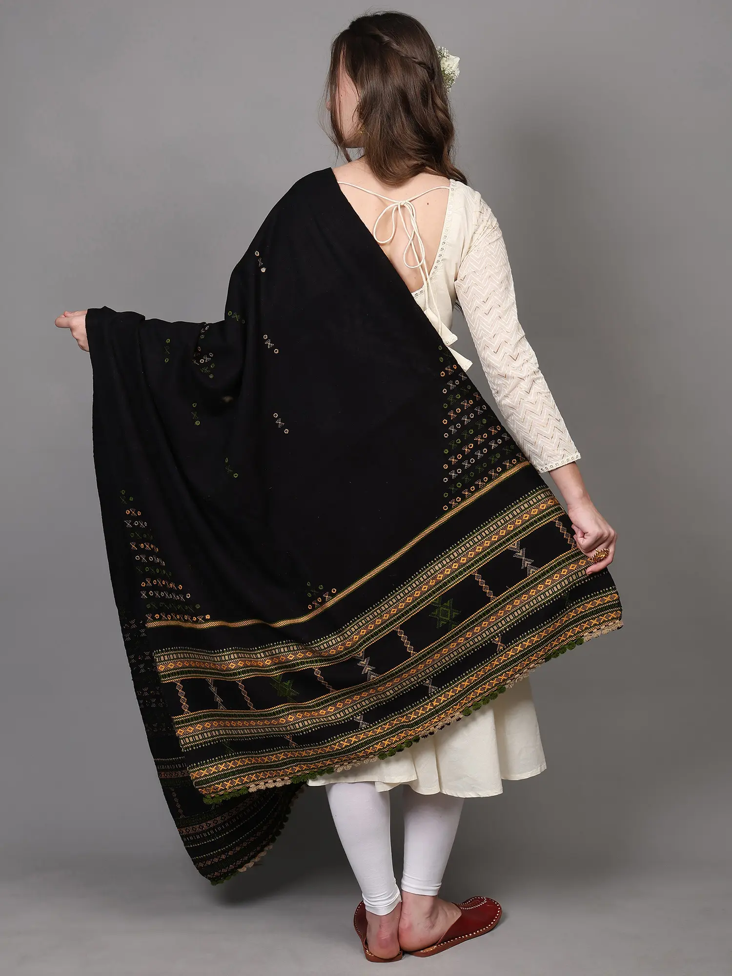 The vibrant culture of Kutch comes alive in this Shawl adorned with a woven border and embroidered mirrors. Kutch, a treasure trove of art, brings you this piece. The woven border, inspired by the region's heritage, carries the essence of Kutchi craftsmanship. Intricately embroidered mirrors add a touch of tradition to this contemporary masterpiece. The colors mirror the vibrancy of the desert landscape. Each mirror and thread reflect the dedication of Kutchi artisans, whose skills have been honed over generations. Wearing this shawl, you adorn yourself with not just a garment but a piece of Kutch's rich artistic legacy.