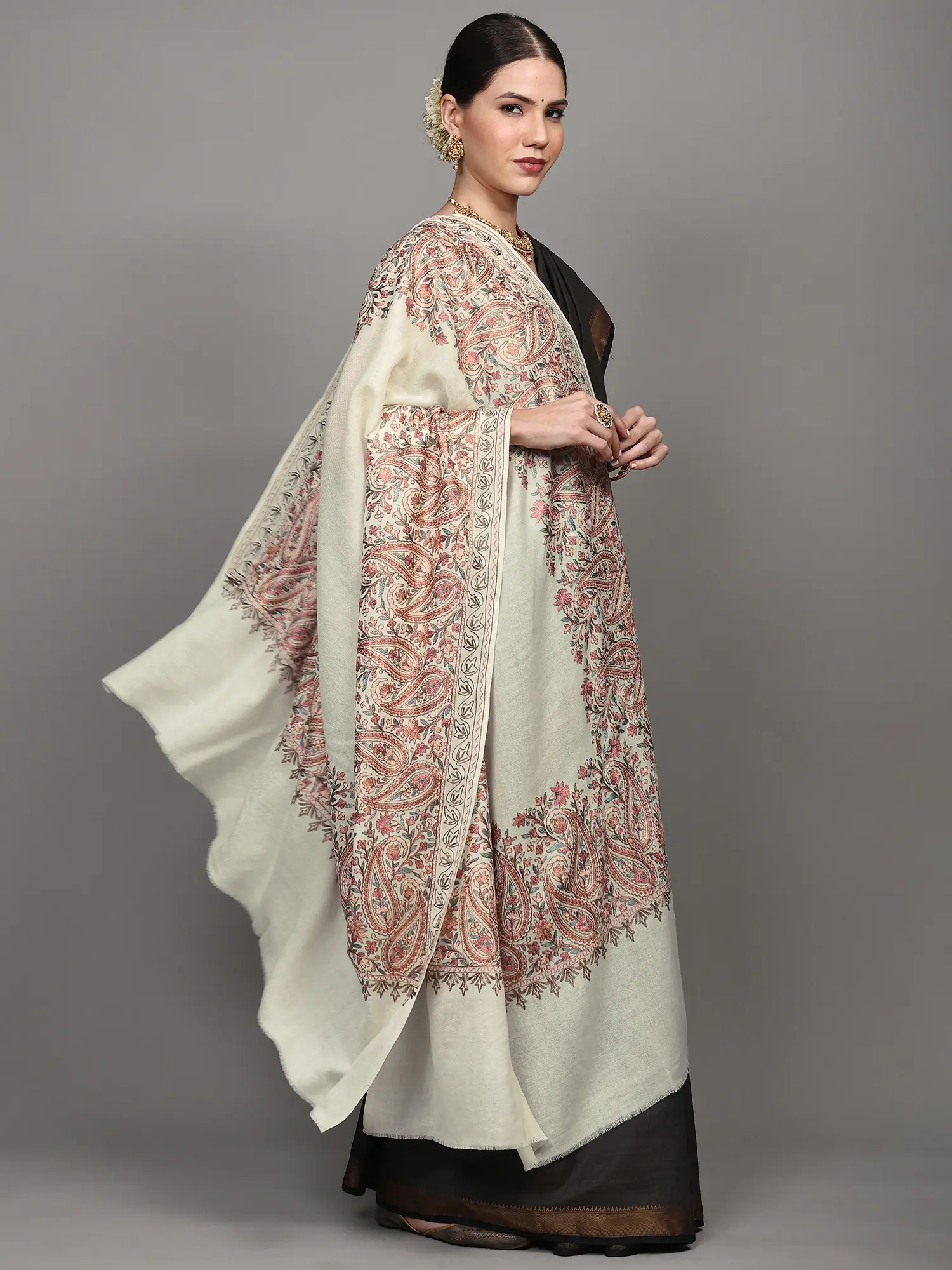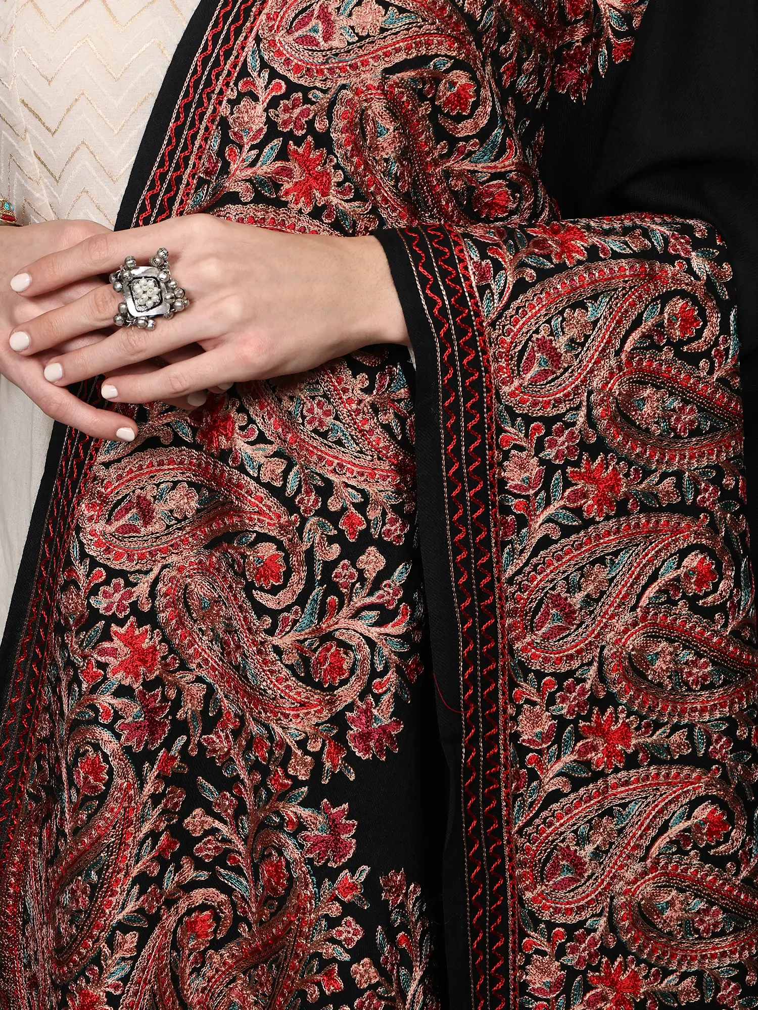 The focal point of this stunning piece is its broad border, meticulously adorned with chain stitch Aari embroidery. This traditional technique, known for its precision and delicate detailing, brings to life a mesmerizing pattern of paisleys. The paisley motif, a symbol of fertility and eternity, is rendered in a captivating palette of reds, pinks, and subtle hints of green and gold threads. Each stitch is a whisper of traditional artistry, creating a rich tapestry of texture and color that draws the eye and speaks volumes of skilled craftsmanship. The embroidery seamlessly integrates with the woolen fabric, creating a harmonious blend of warmth and visual appeal.