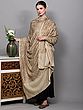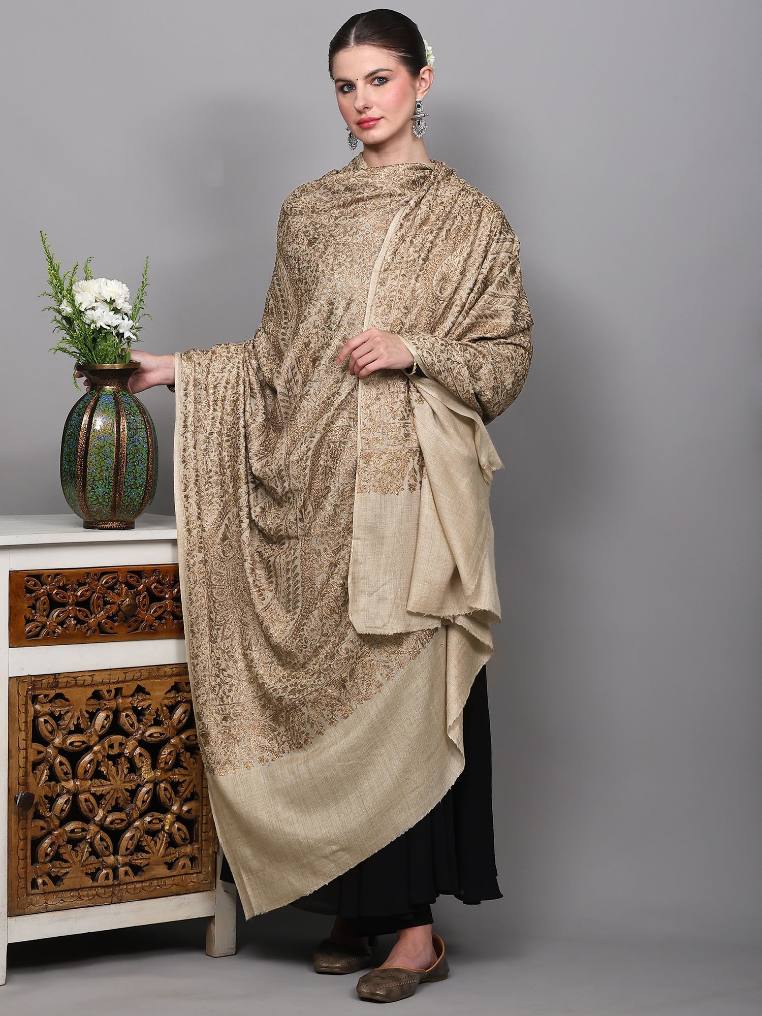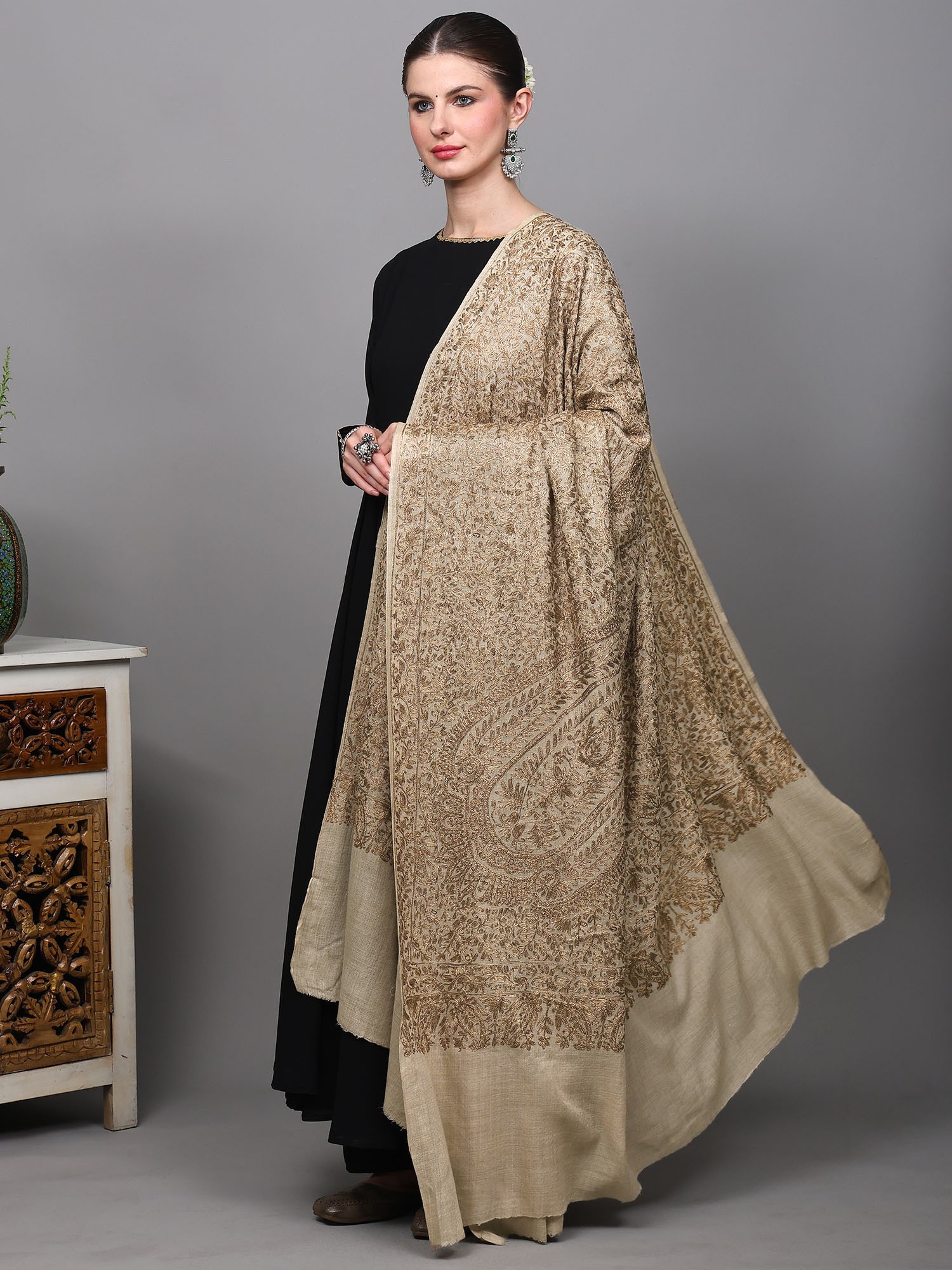 Irish-Cream Aari Embroidered Shawl with Paisleys-Flowers Pattern and Diamond Weave