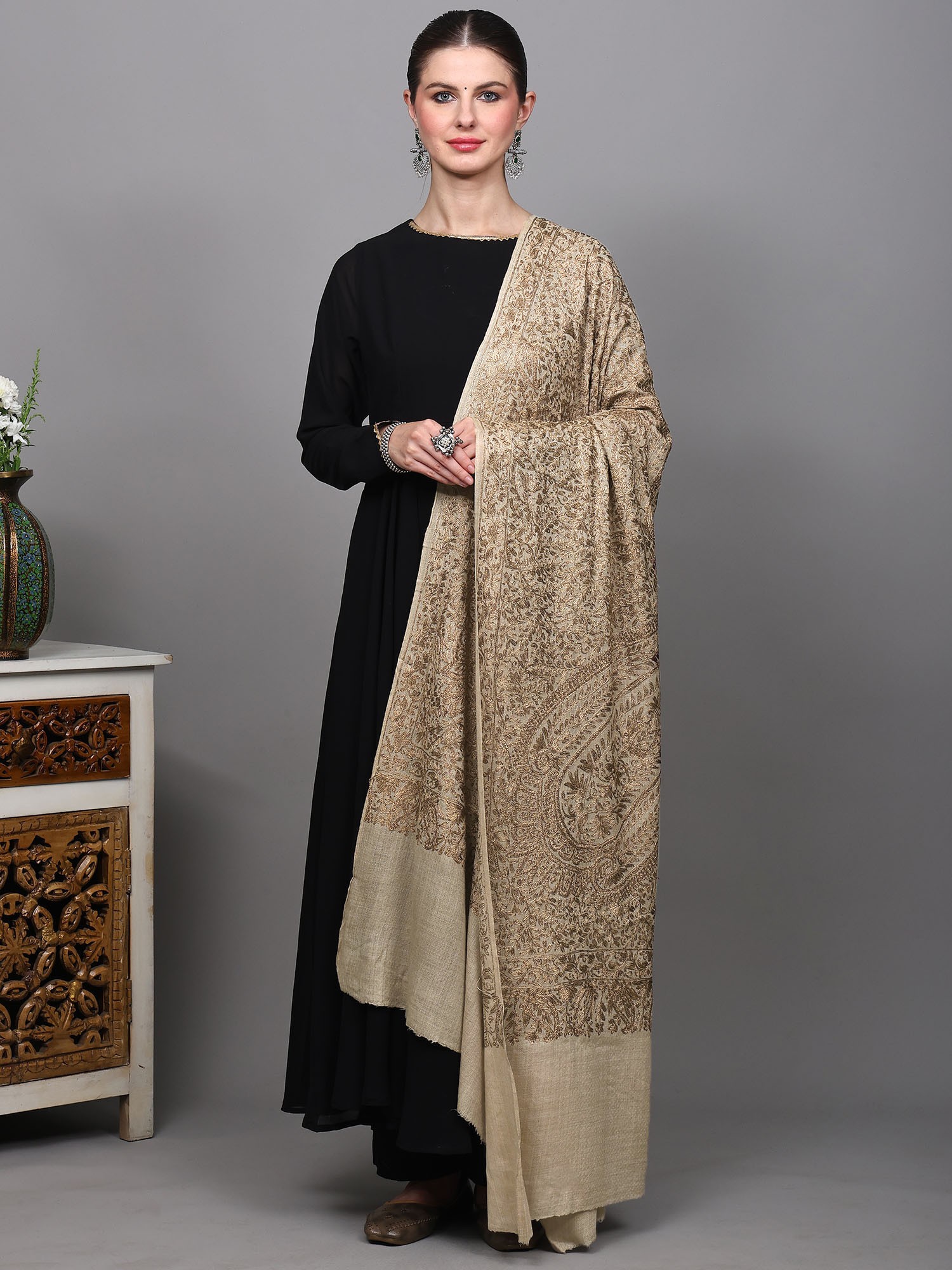 This shawl is more than just an accessory; it's a statement piece designed for versatility. Its generous dimensions allow for a multitude of styling options. Drape it elegantly over your shoulders for a formal occasion, adding a touch of opulence to your evening wear. Wrap it around yourself for a cozy yet chic layer during cooler months, complementing both traditional Indian attire and contemporary outfits. The neutral base color and the classic embroidery ensure it pairs effortlessly with a wide spectrum of colors and patterns, making it an indispensable addition to your wardrobe. Whether you're attending a wedding, a festive gathering, or simply seeking to add a touch of refined charm to your everyday look, this shawl promises to be your go-to companion. Its timeless design transcends fleeting trends, ensuring it remains a cherished item for years to come.