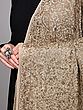 The true magic of this shawl lies in its all-over intricate thread embroidery. Delicate paisleys, the quintessential motif of elegance, intertwine seamlessly with intricately rendered floral leaves. Each stitch has been meticulously placed, creating a rich tapestry of texture and detail that draws the eye and whispers tales of heritage. The embroidery is executed with precision, ensuring a refined and sophisticated finish that speaks volumes about the wearer's discerning taste. The dance of paisleys and foliage across the entire expanse of the shawl creates a mesmerizing visual effect, making it a true work of art to be draped and admired.