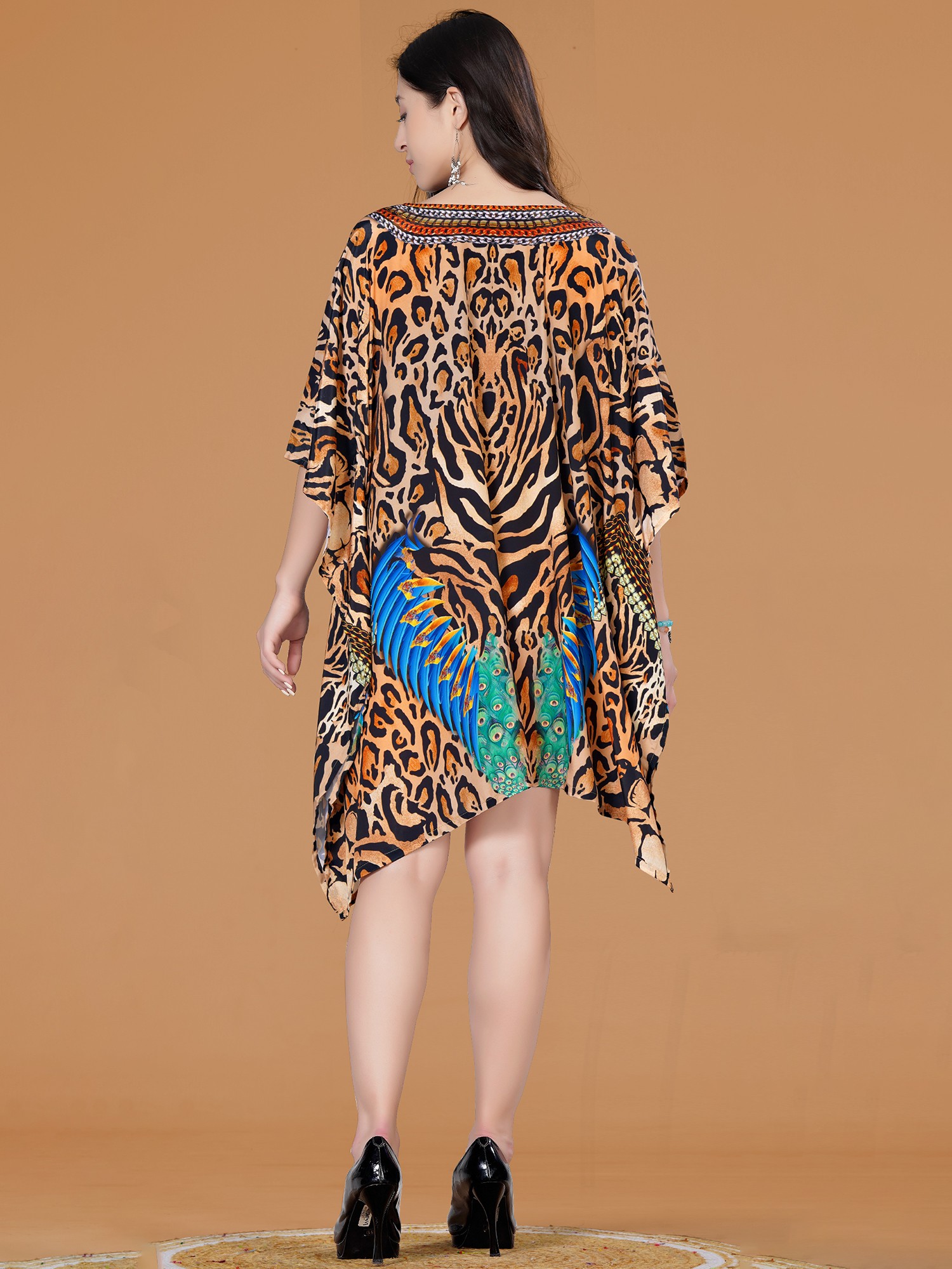 Embrace bold style with this eye-catching short kaftan. Crafted from flowing art silk, this piece drapes beautifully, offering effortless comfort and a touch of bohemian flair. The V-neckline flatters the décolletage, while the relaxed fit allows for easy movement. Whether you're lounging by the pool, exploring a vibrant city, or enjoying a casual evening out, this kaftan is a versatile addition to your wardrobe.