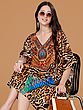 The captivating design features a mesmerizing blend of animal prints and intricate stone work. The combination of bold patterns and delicate embellishments creates a visually stunning effect that is sure to turn heads. The vibrant colors and unique details make this kaftan a true statement piece, perfect for expressing your individual style. The attention to detail is evident in every aspect of this garment, from the carefully chosen fabrics to the meticulously applied embellishments.