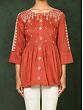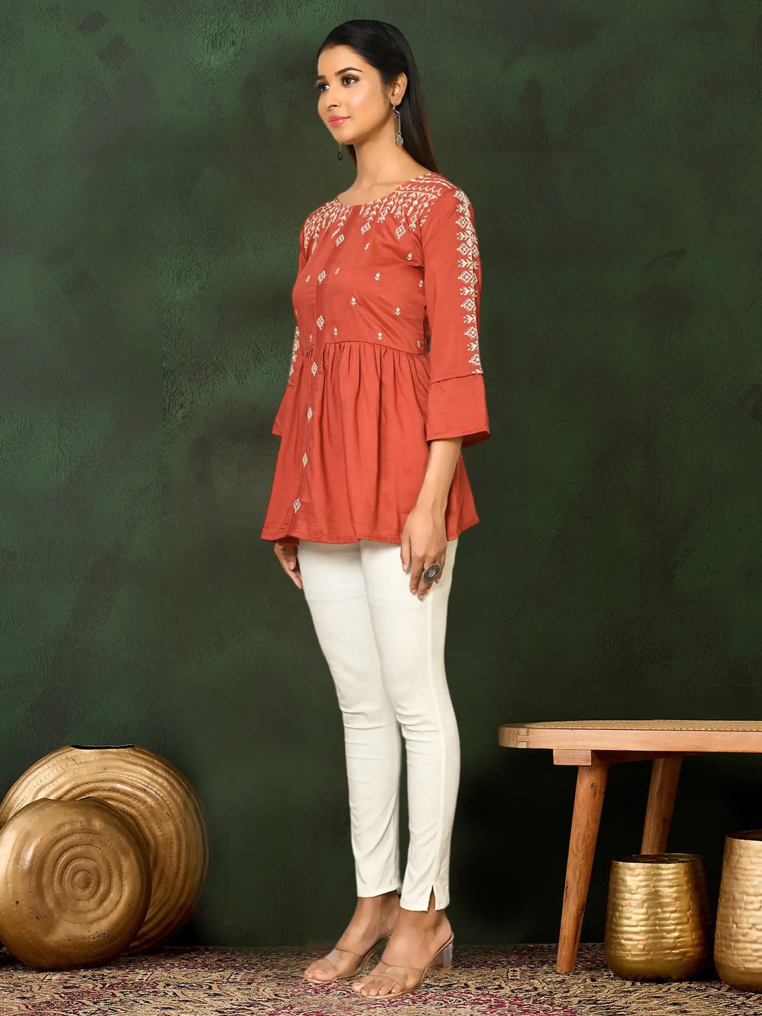 This short top is designed for effortless styling, making it a perfect choice for casual outings or more relaxed social gatherings. Pair it with white leggings or slim-fit trousers for a chic, put-together look. You can also dress it down with your favorite jeans for a more laid-back vibe. The rich orange color makes it a standout piece, easily complemented by neutral accessories. Elevate your casual wear with this beautifully embroidered top that promises both comfort and timeless style.