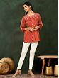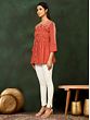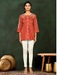 Embrace a blend of traditional artistry and modern comfort with this striking short top. The vibrant, shocking-orange hue serves as a captivating canvas for the intricate white embroidery that graces the neckline and sleeves. This delicate detailing features classic ethnic motifs, adding a touch of sophisticated cultural flair to your everyday wardrobe.