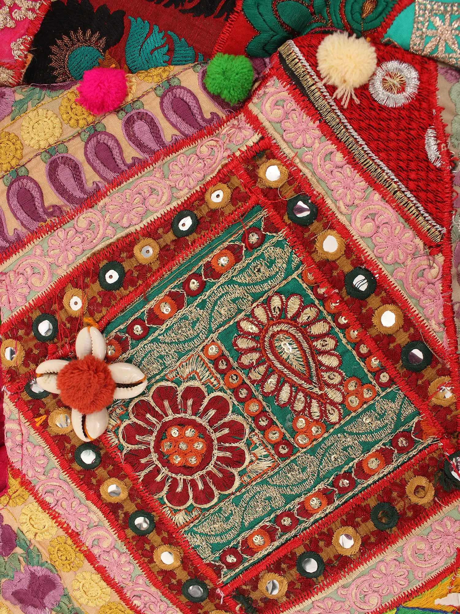 Adorned with floral embroidery and delicate sea-shells, this bag, crafted from art silk, transcends mere accessory, becoming a statement of refined taste and cultural appreciation. Beyond its aesthetics, this bag symbolizes the rich heritage of Kutch, celebrating the vibrant artistry and indigenous creativity of the region.
