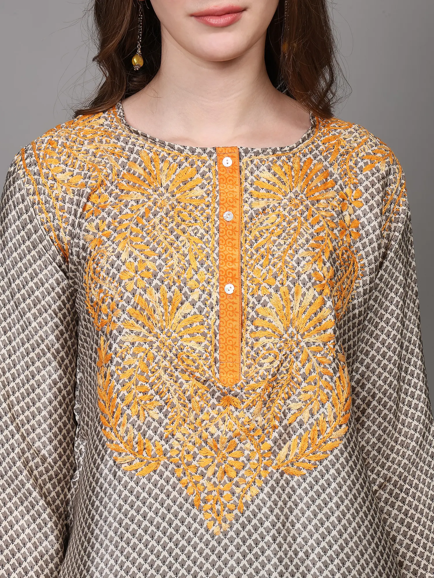 Short Kurti with Chikankari Embroidery on Neck and Printed Bootis