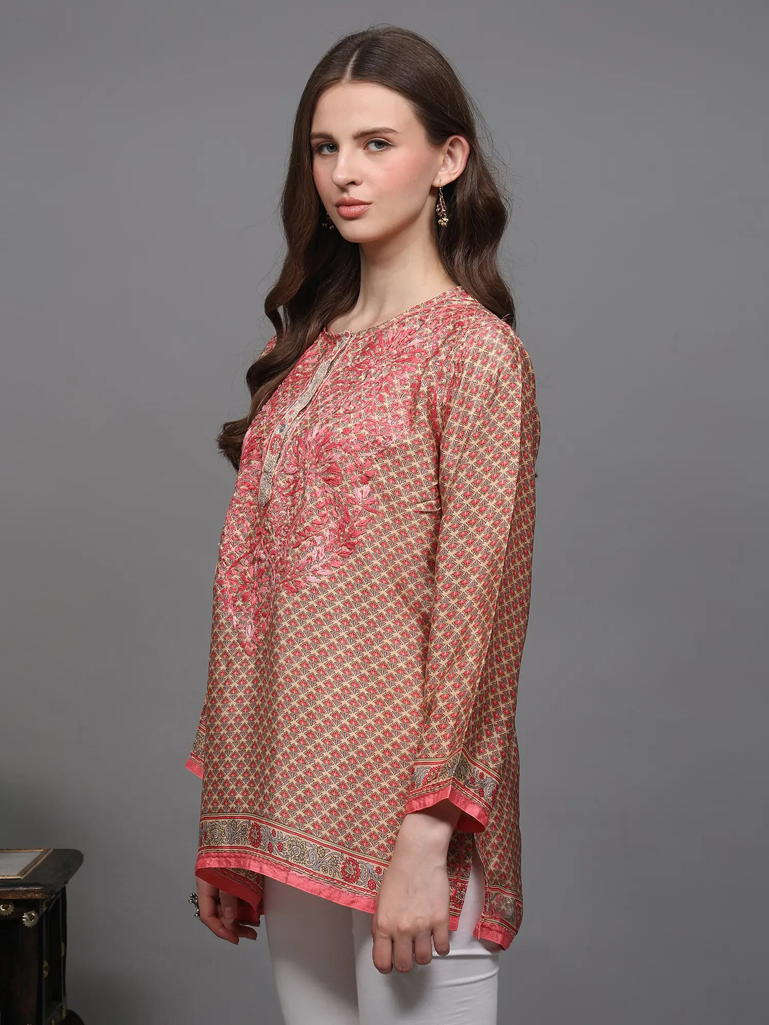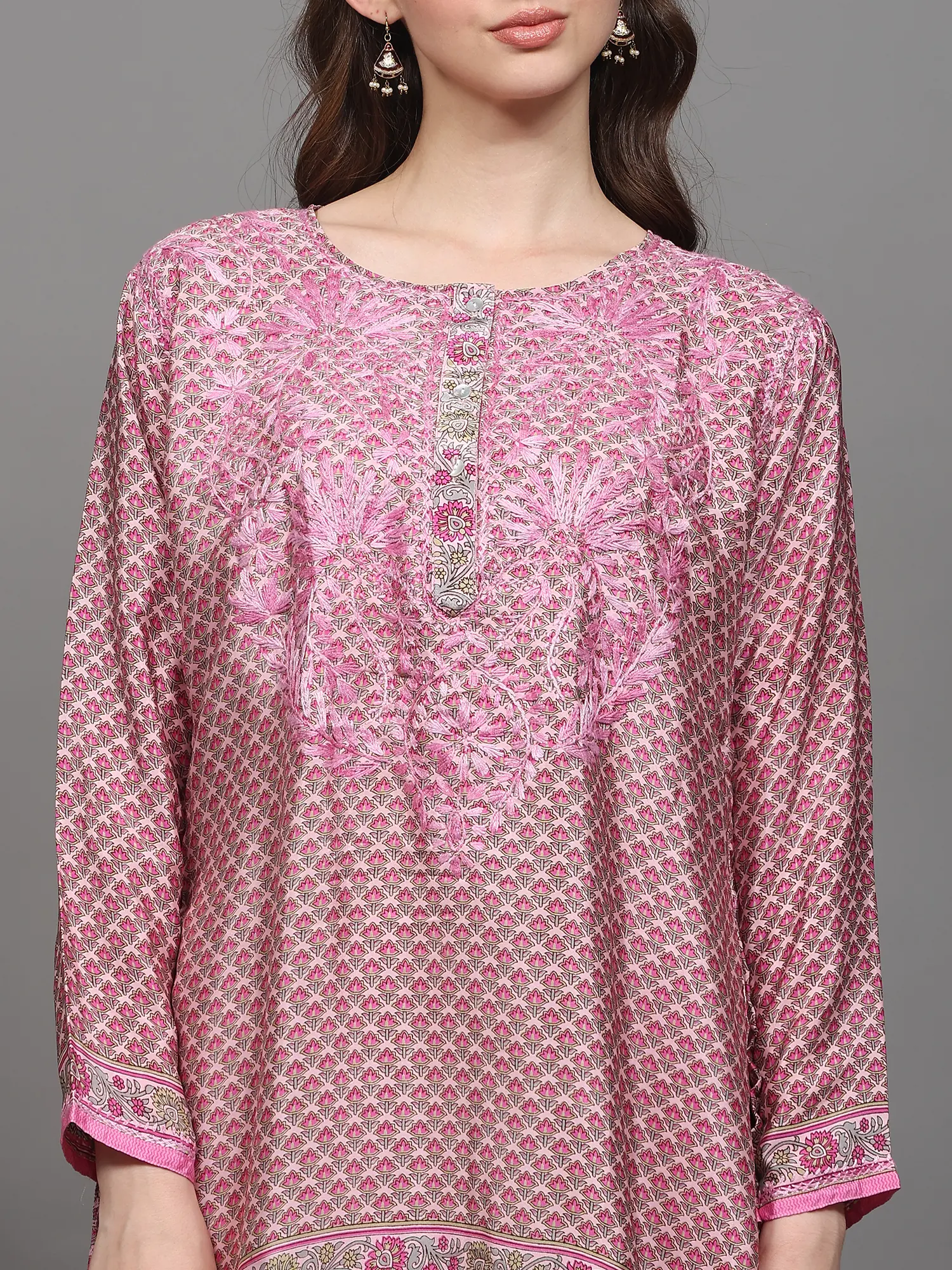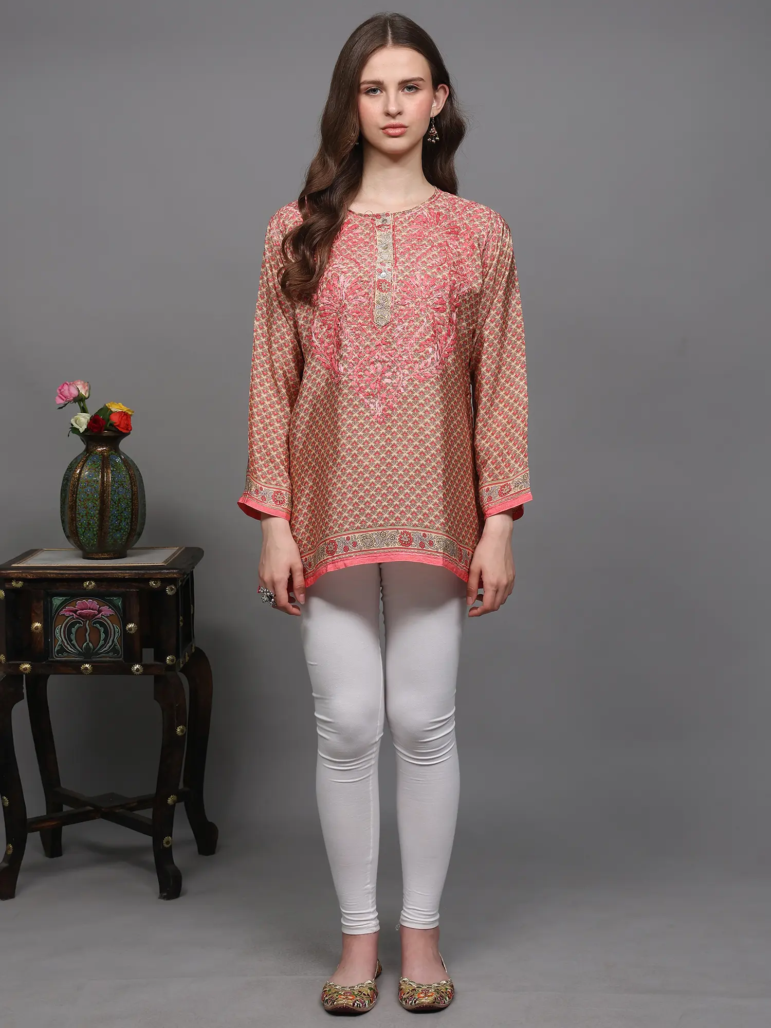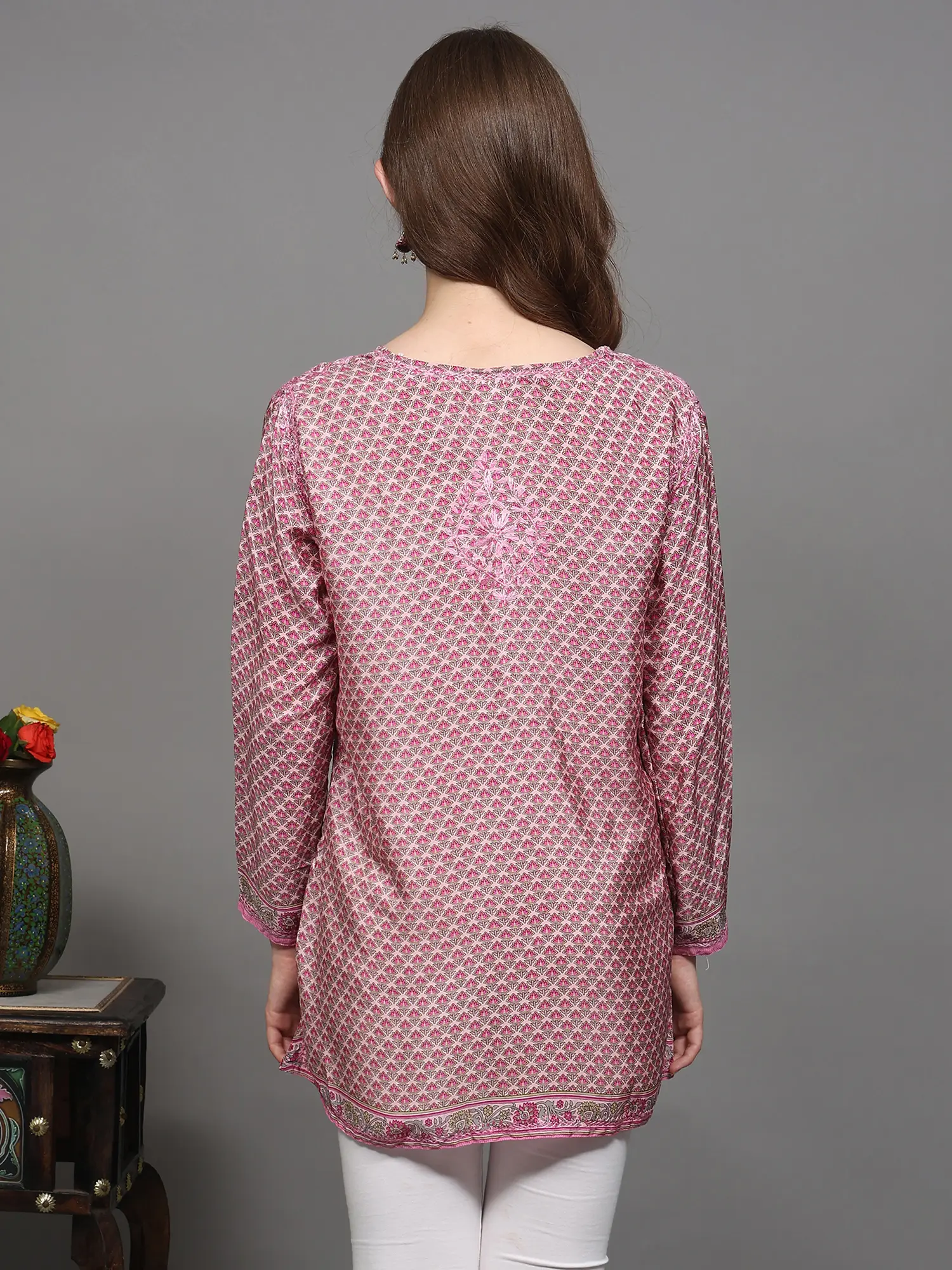 Chikankari Embroidered Crepe Short Kurti with Printed Paisleys and Flowers