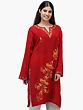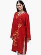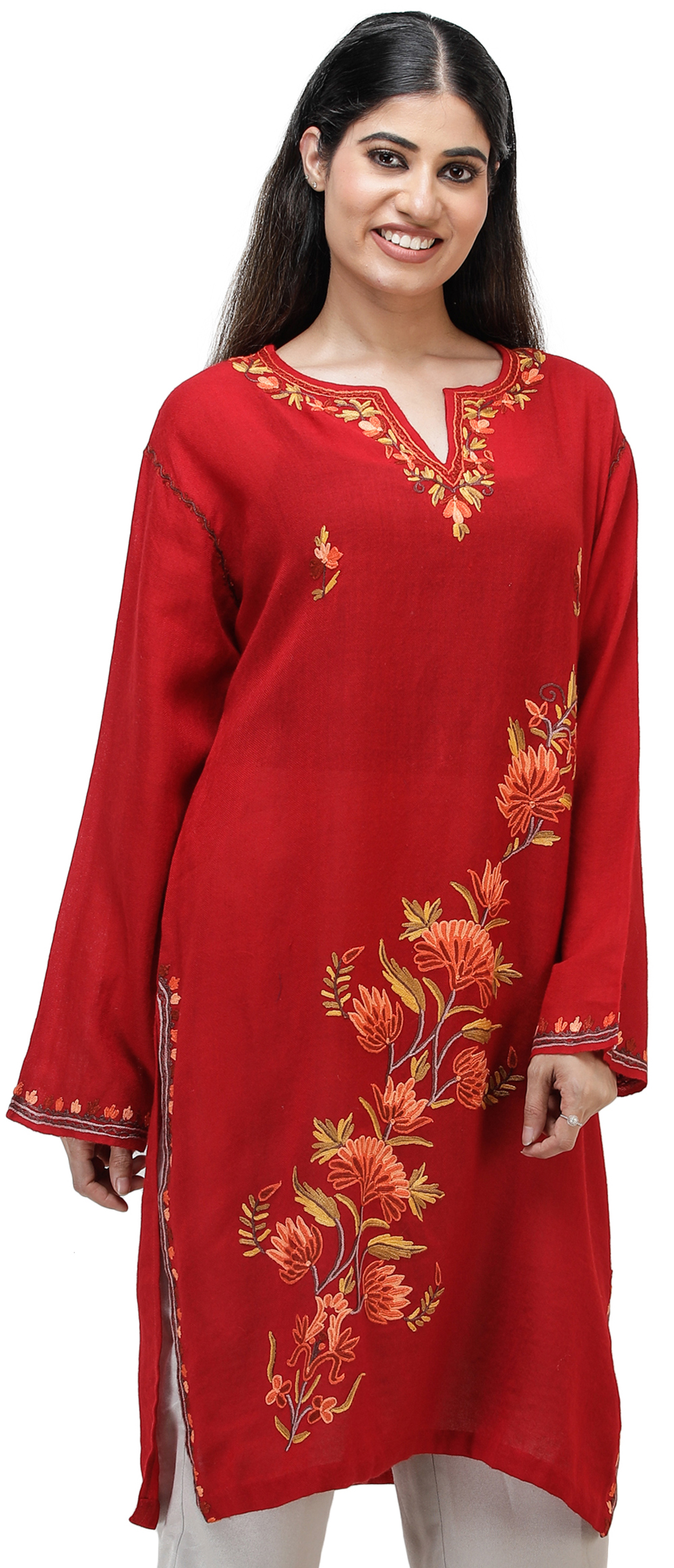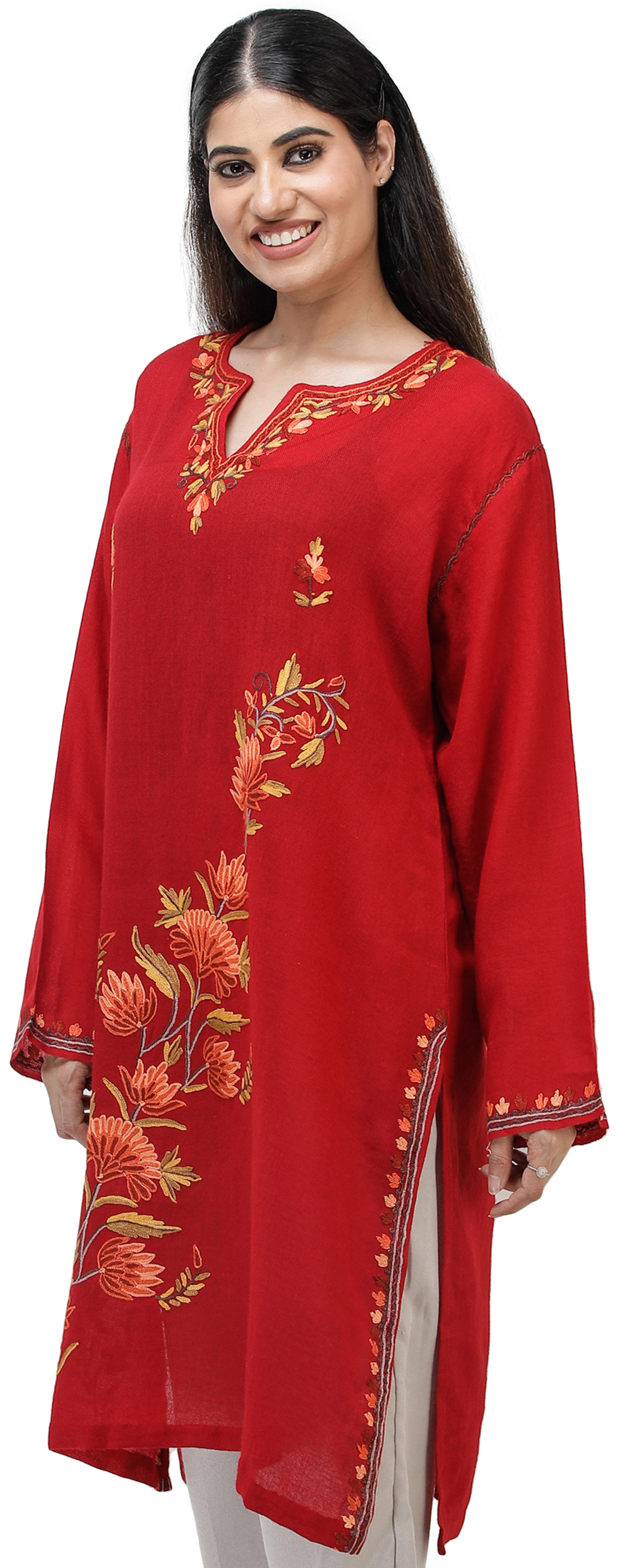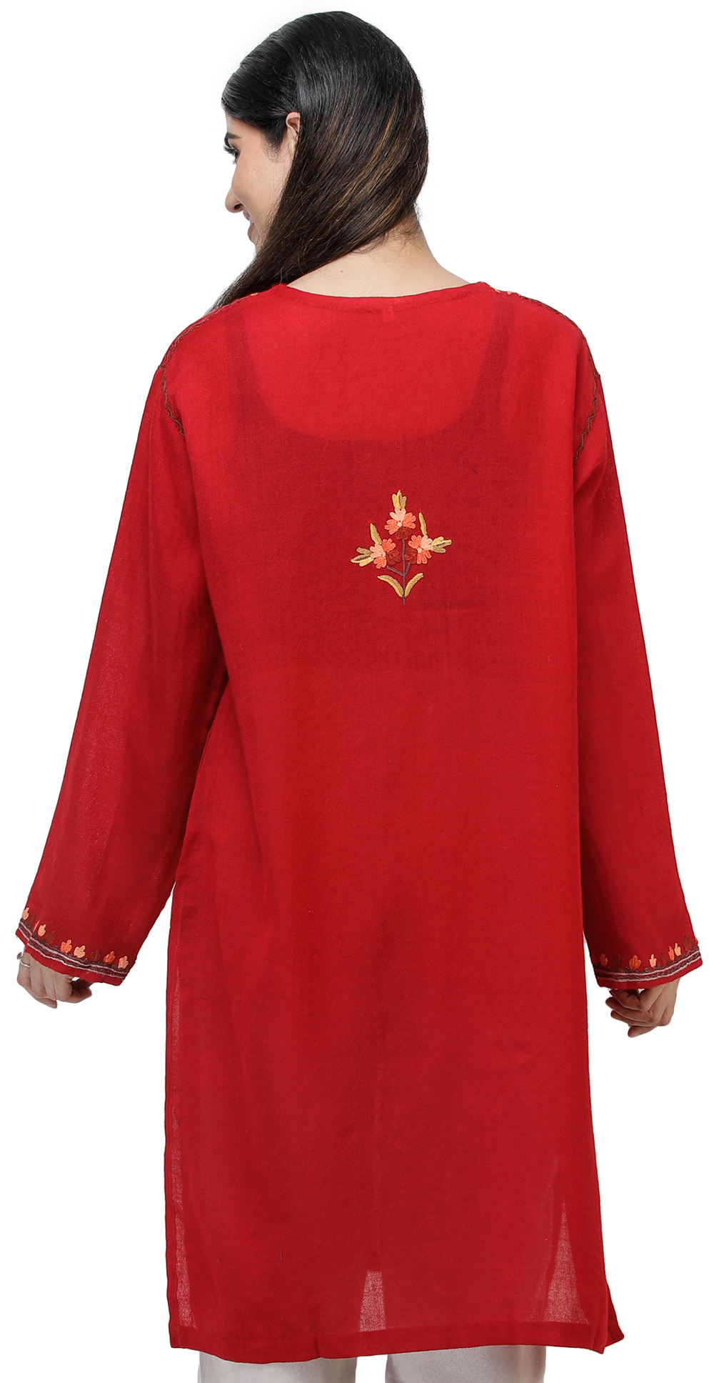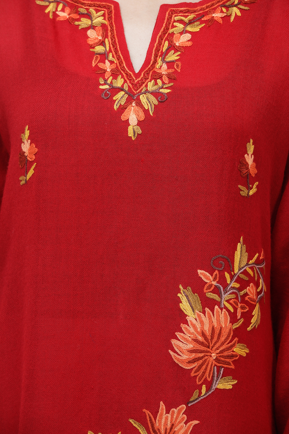 Experimenting with the traditional Phiran of Kashmir, which is a long kurta, this woolen Phiran creates a contemporary shorter version, while maintaining a fashionable link to the heritage attire. The warmth of wool gives the Phiran a comfortable feel, which is beautified by the work of Aari, and used in creating eye-catching and vibrant floral patterns. Intricate floral vines on the neckline, and sleeves and running diagonally on the body lend the Phiran a classic elegance, while the singular floral bunch on the back, inspired by the traditional Kashmiri attire, gives this Phiran a stamp of culture.
