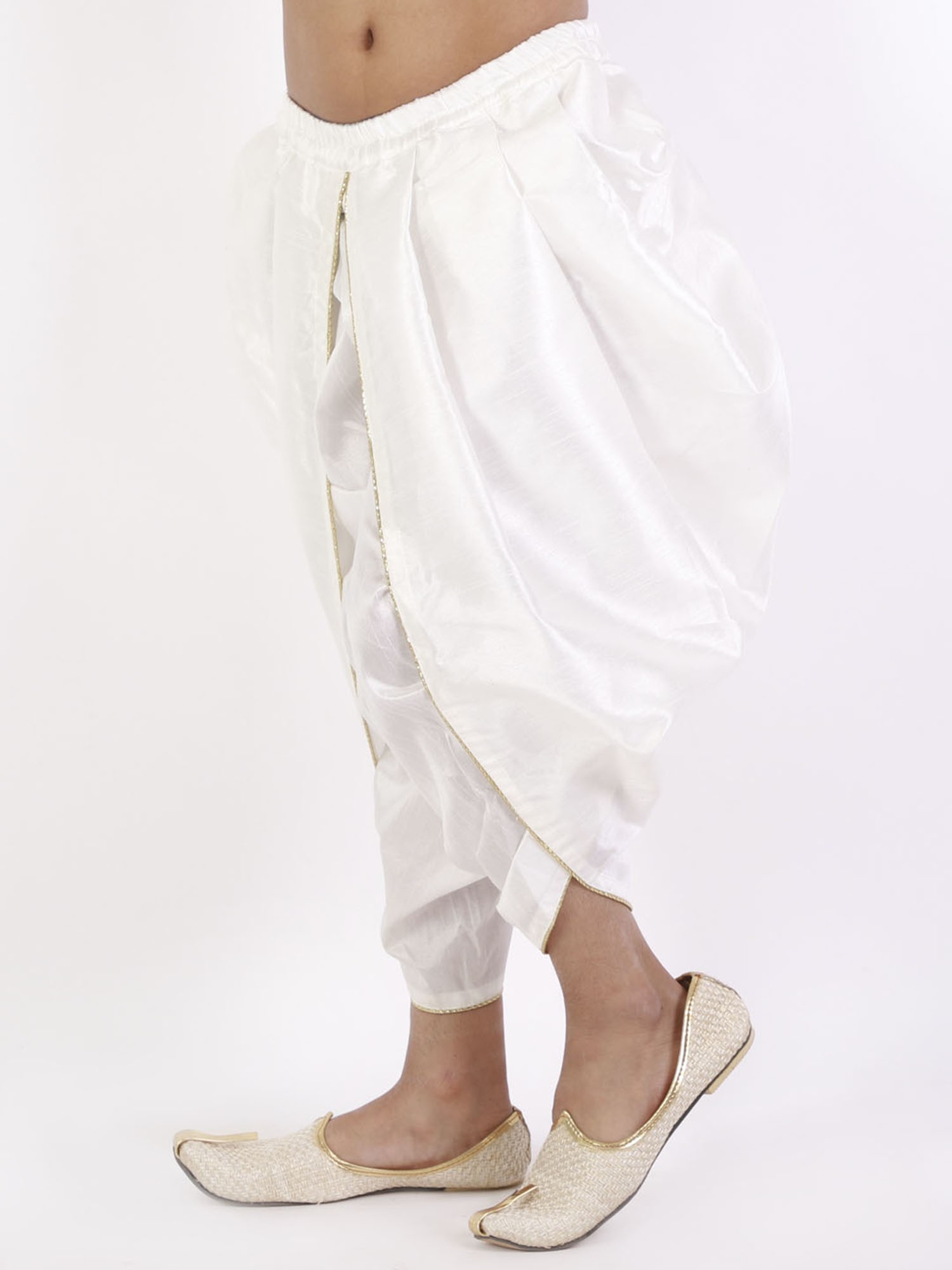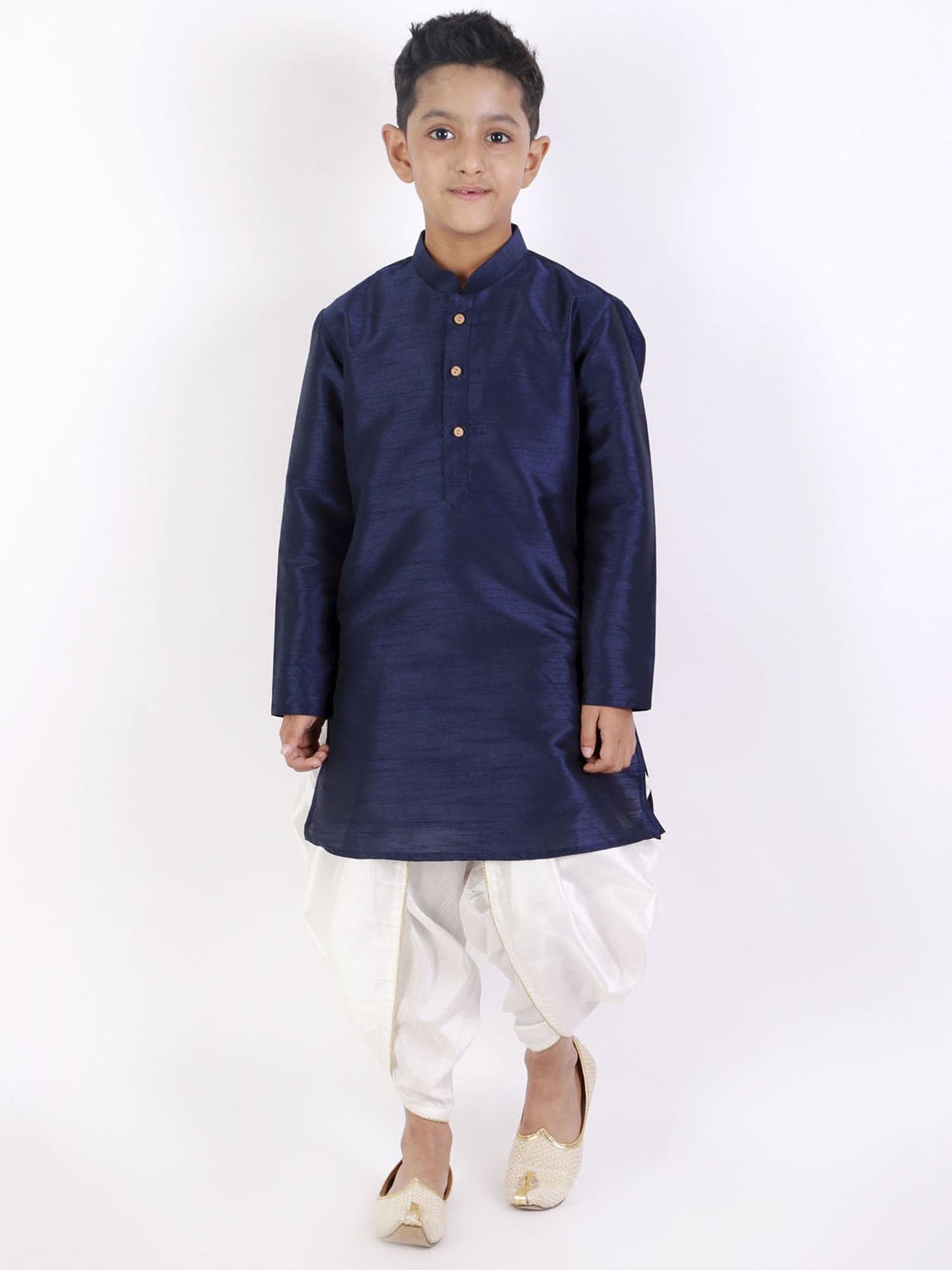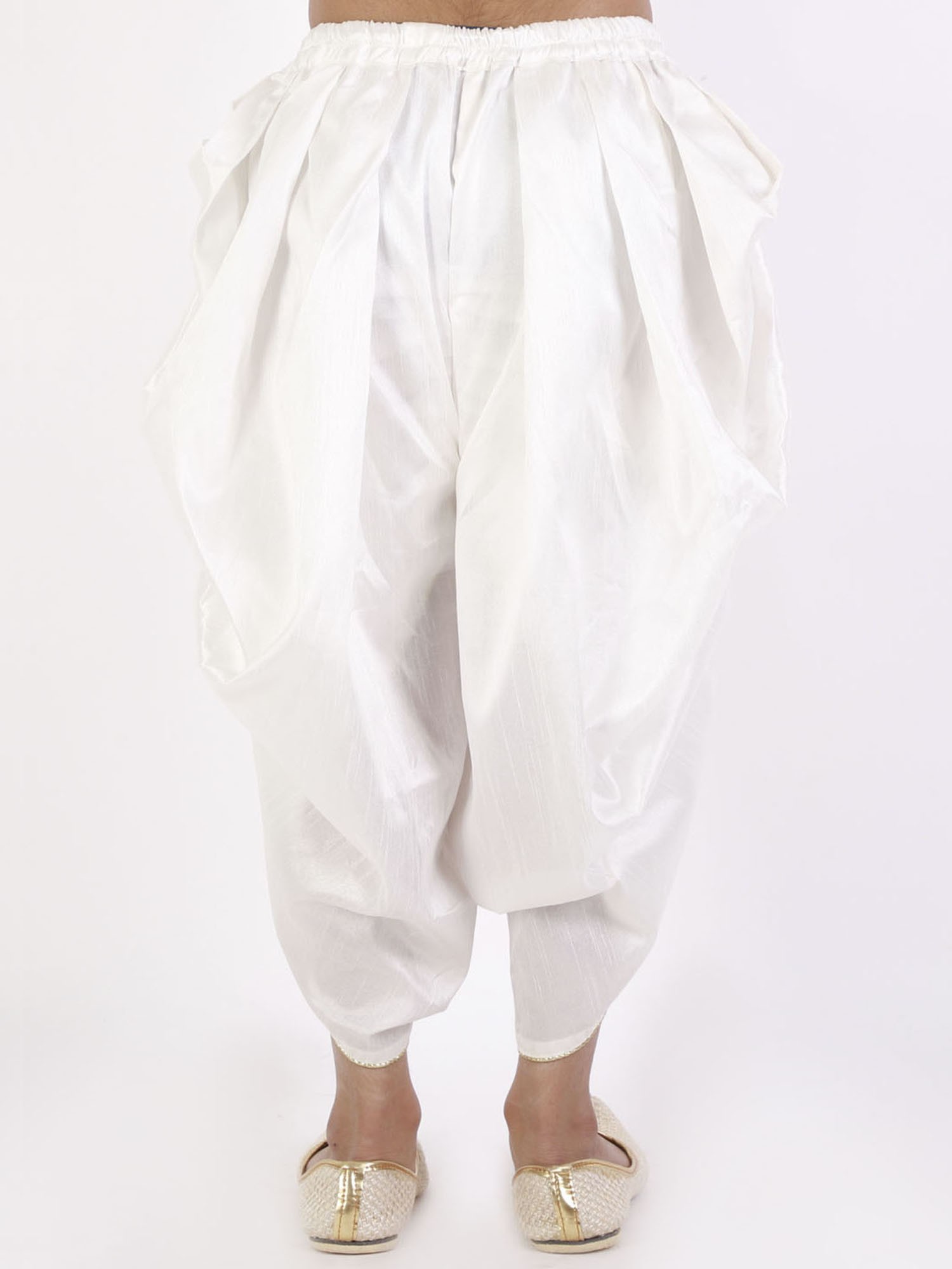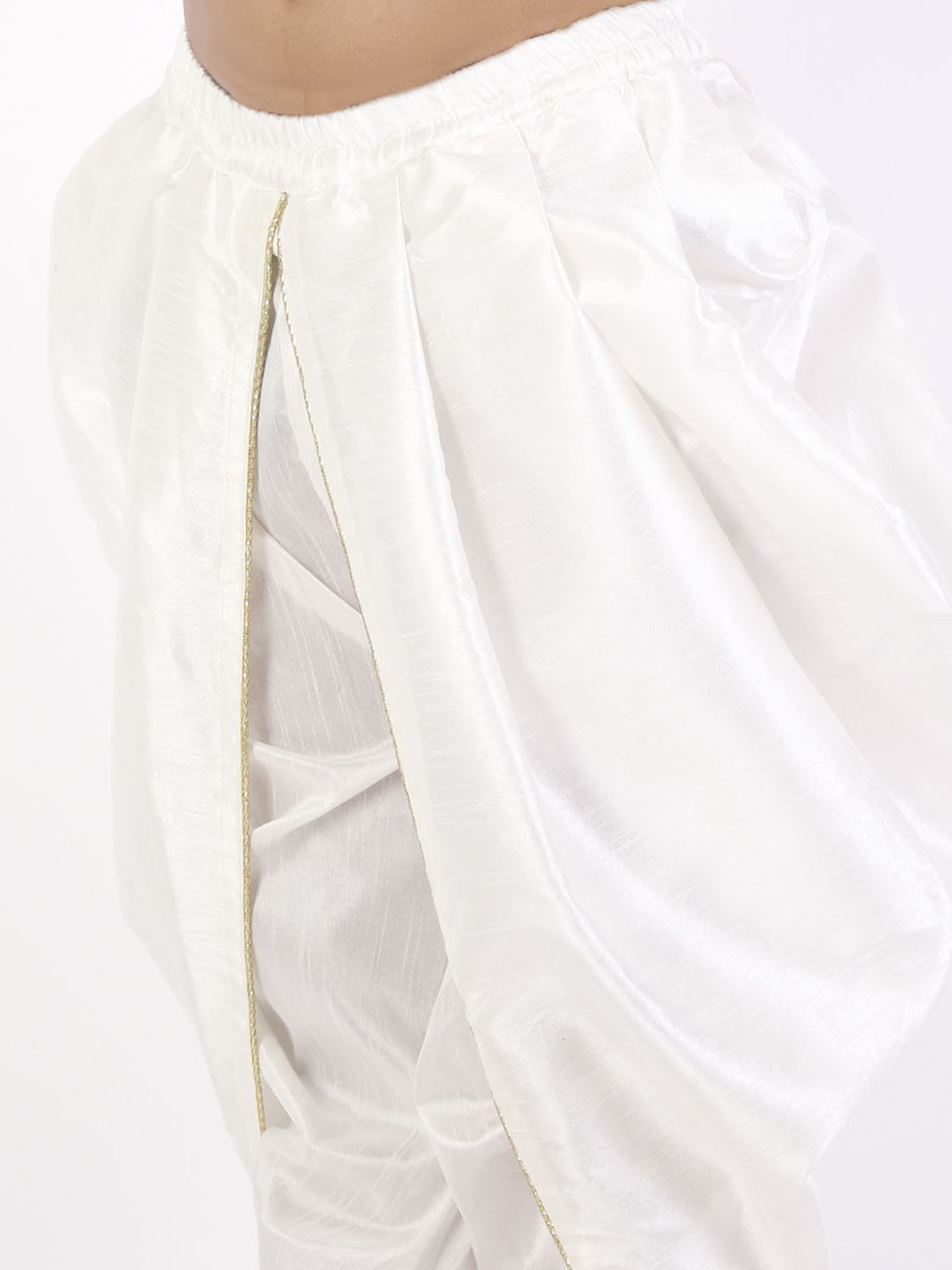 Embrace tradition and comfort with our silk blend elastic-waist boys' dhoti. The luxurious silk blend fabric drapes beautifully, offering a sophisticated look for your little one. The practical elastic waist ensures a comfortable fit that allows for ease of movement, perfect for playful youngsters. Unlike traditional dhotis that require tying, this version simplifies dressing while maintaining the cultural significance of the garment.